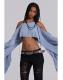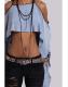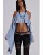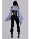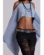 Grey-blue slinky jersey cape top with black PU leather binding and cut-out shoulder detail.