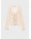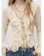 Tejido de encaje. Diseño recto. Cuello pico. Manga larga acampanada. Detalle de volantes en el cuello. Cierre de lazos en la parte delantera