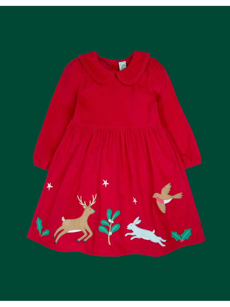 The product: Dance and prance-ready! Your search for the perfect Christmas day dress is over. Designed with soft corduroy in a colour to match Rudolph's nose, it's framed with a frilly collar and patterned with appliqué reindeers, rabbits, robins and holly leaves around the hem. Finished with back button fastenings for easy dressing.