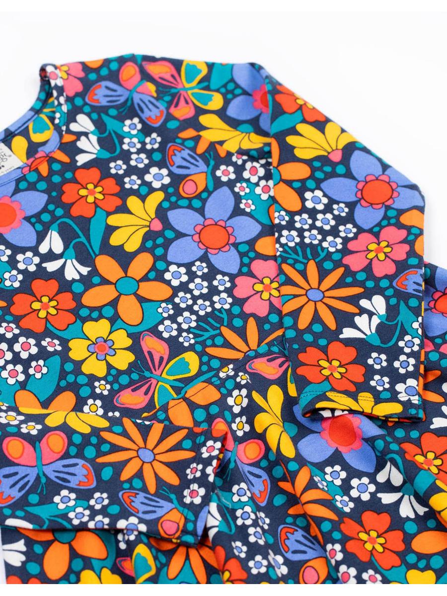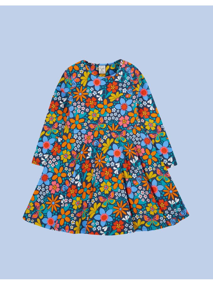 The product: Ready. Set. SPIN! A playful addition to their joyful wardrobe, this dress is soaked in a pigment-popping colour and patterned with fun motifs. Designed with long sleeves and a skater-style skirt ready for twirling.