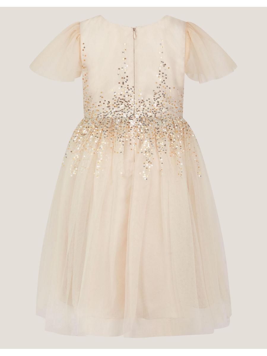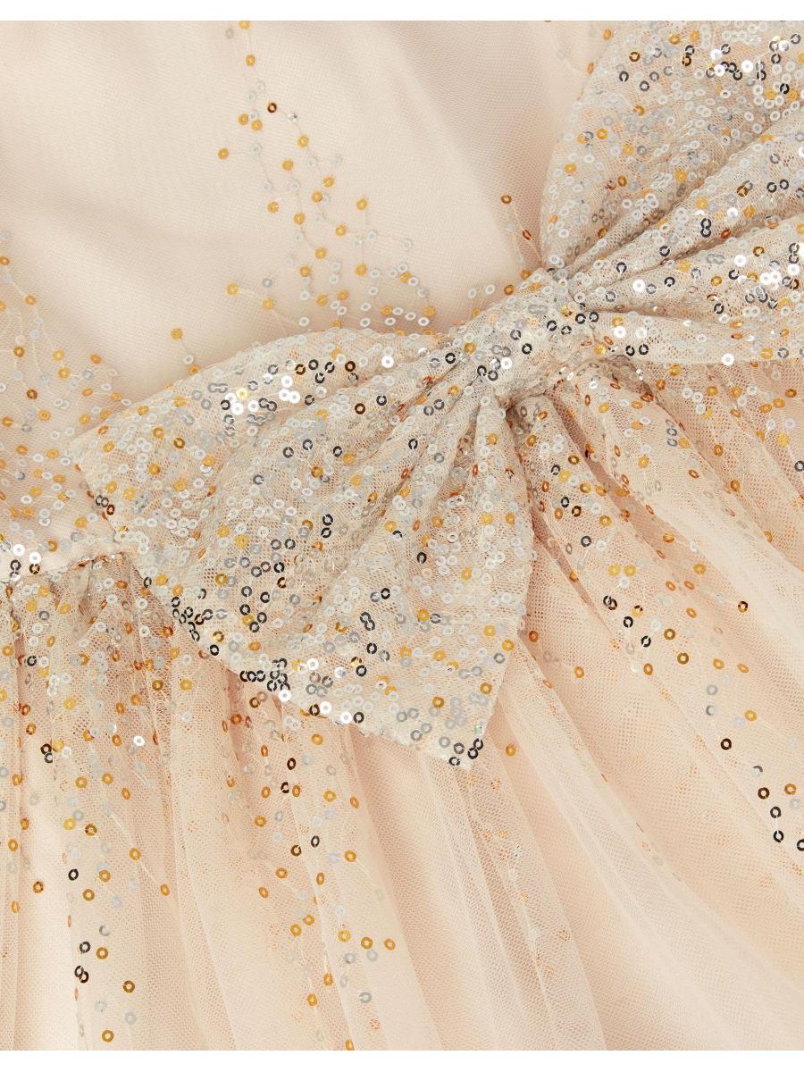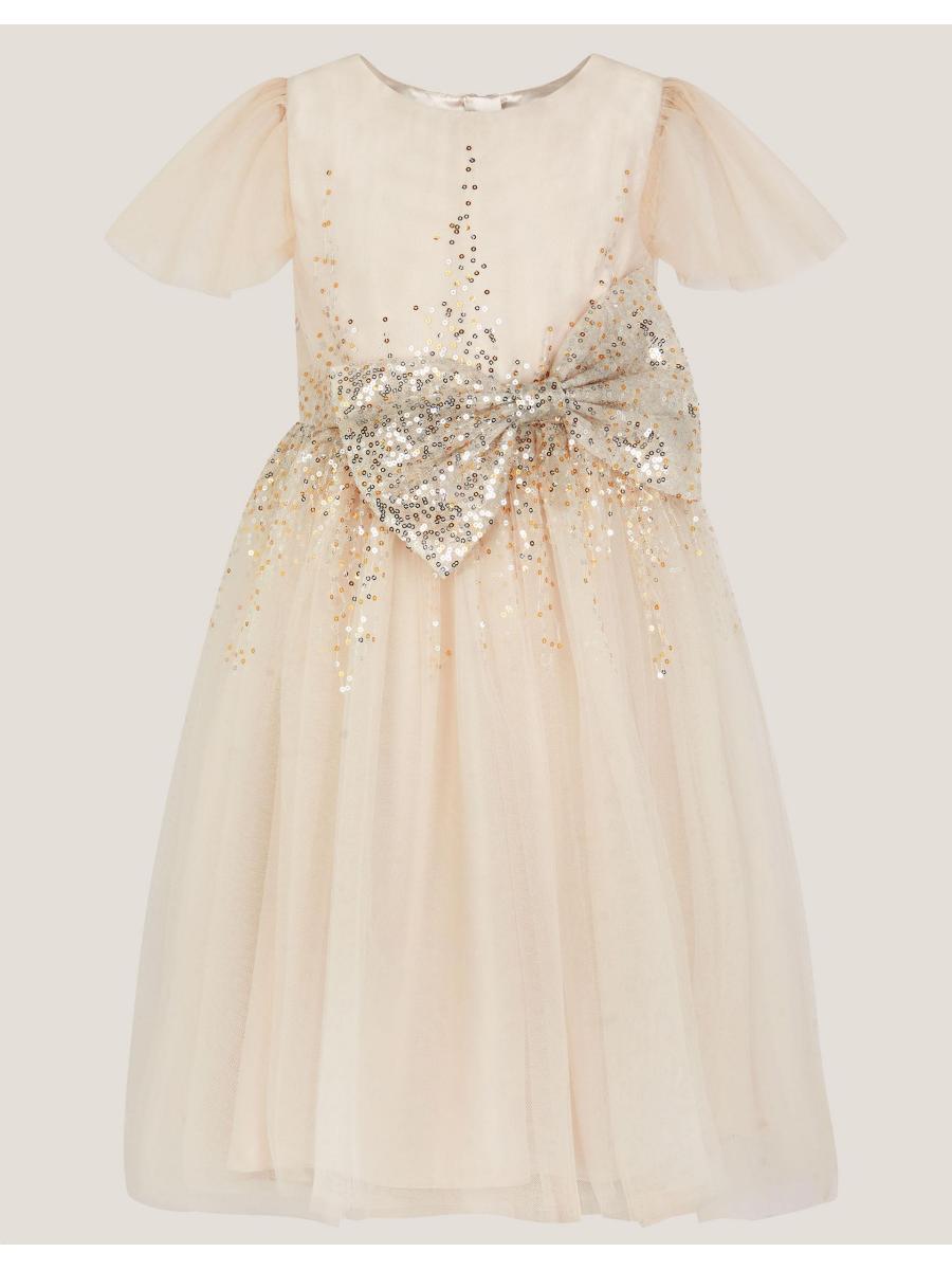 Enter party season. Perfect for special occasions, this gorgeous frock features a delicate tulle overlay with angel sleeves to finish. Complete with a large bow and sparkly sequins to the front. Looks fab with ballet flats! Gold
