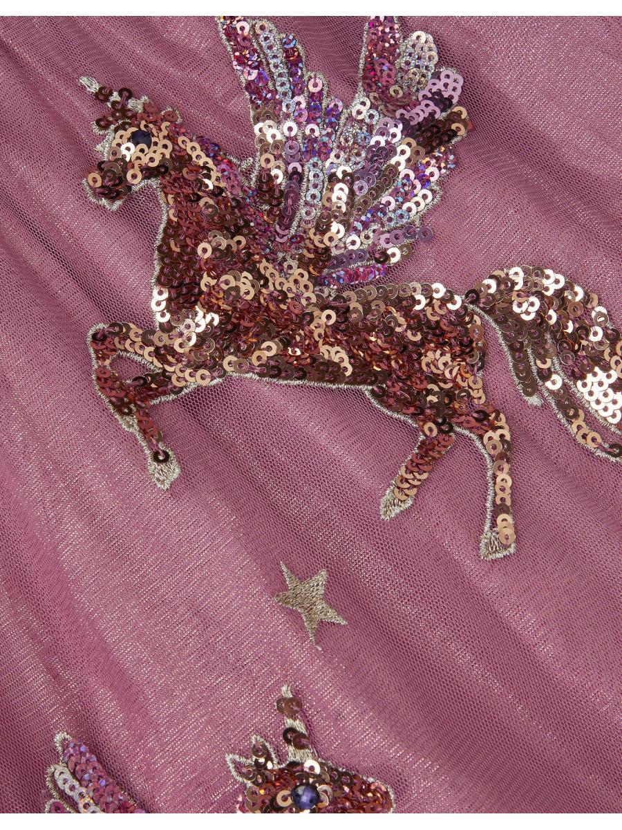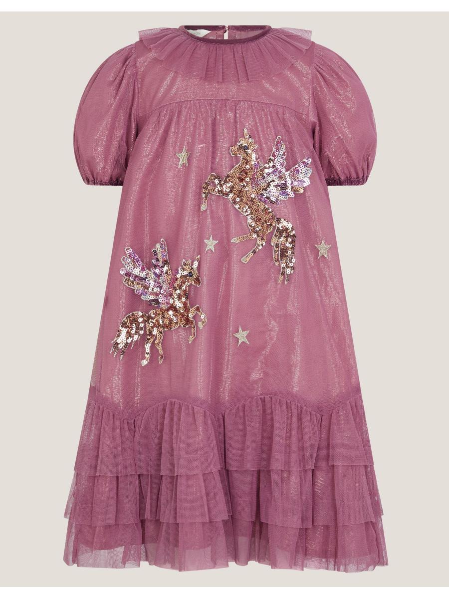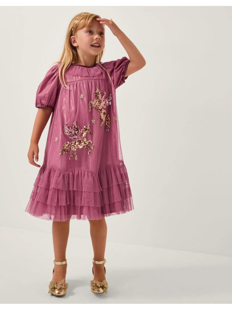 Magical moments start here. The perfect frock for all their festive celebrations, this tulle dress is designed with a floaty trapeze silhouette, swishy ruffles, sparkly unicorns and embroidered stars. Gorgeous! Pink