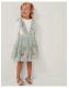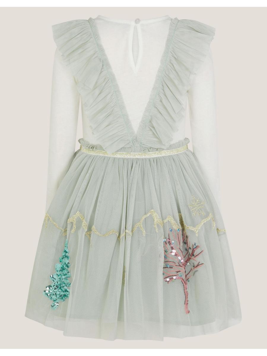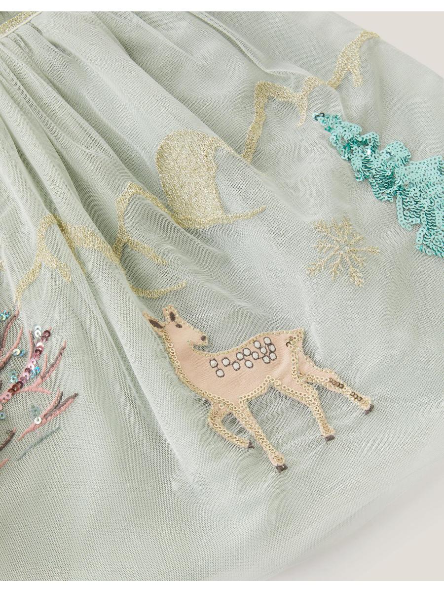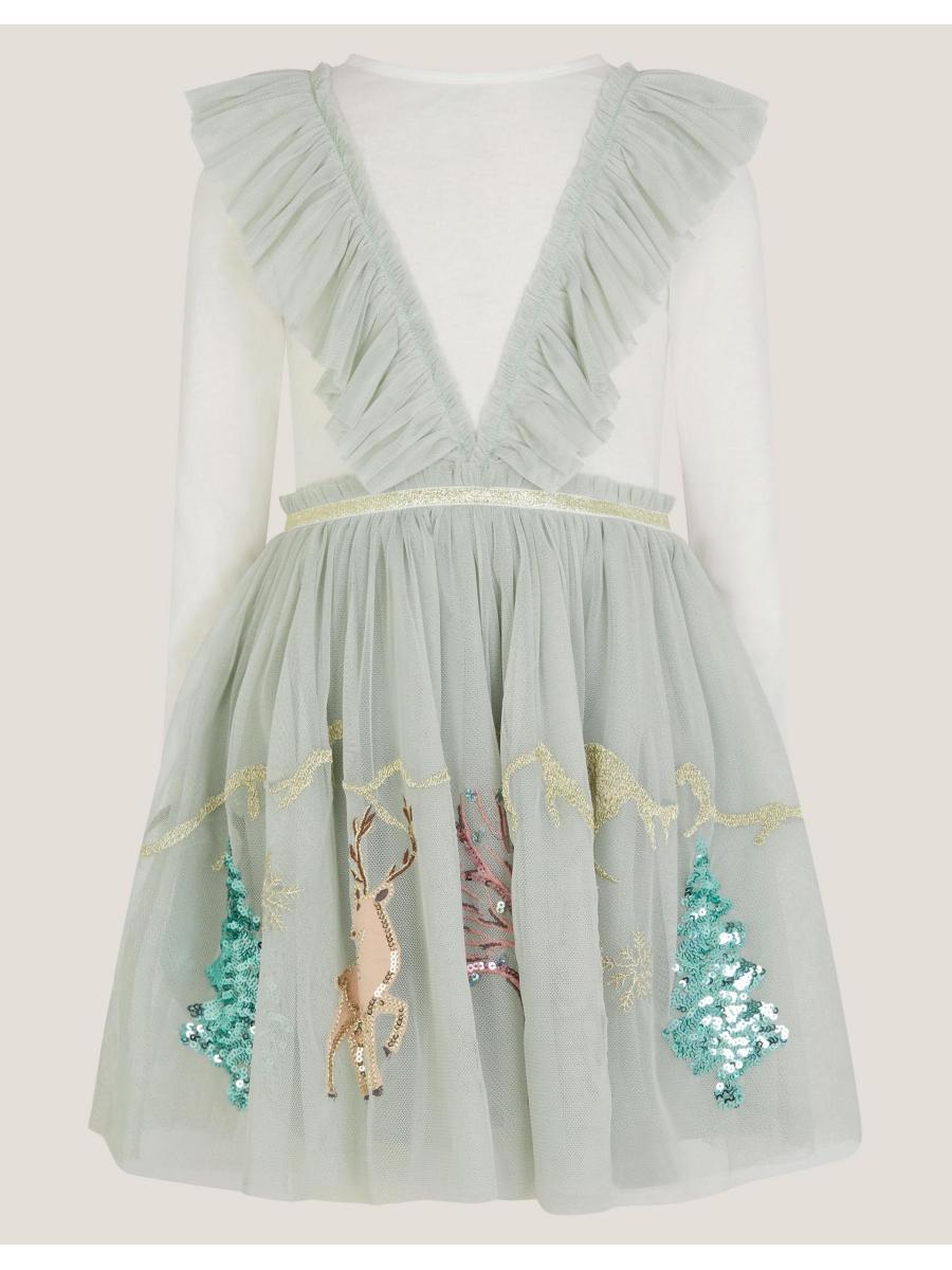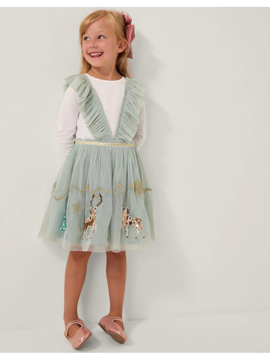 Season of the sparkles. As dazzling as the lights strung around a Christmas tree, this dress is a must-have for their December outfit rotation. Featuring a long sleeve cotton bodice trimmed with tulle ruffles, this skirt is decorated with enchanted motifs and sequin embellishments of reindeers, trees, snowflakes and more. Green