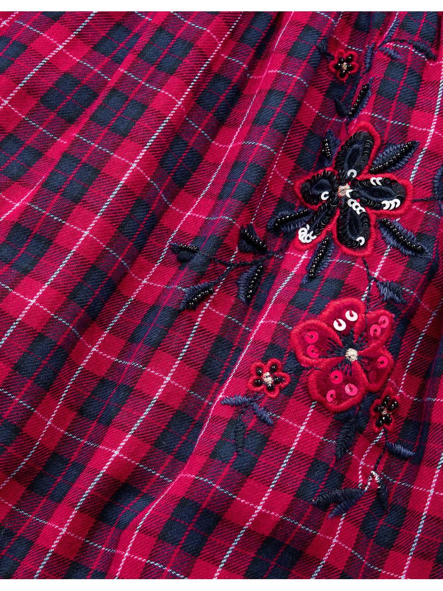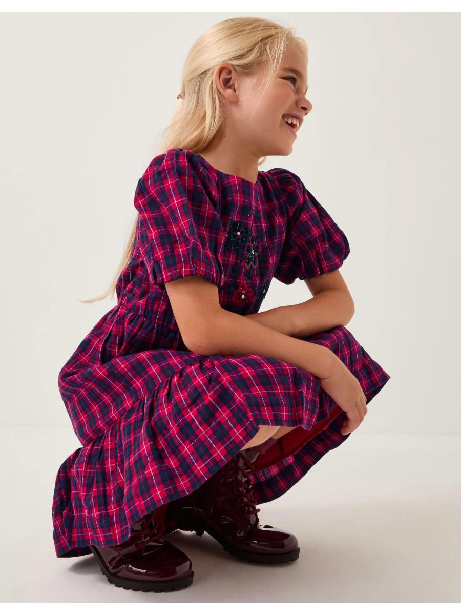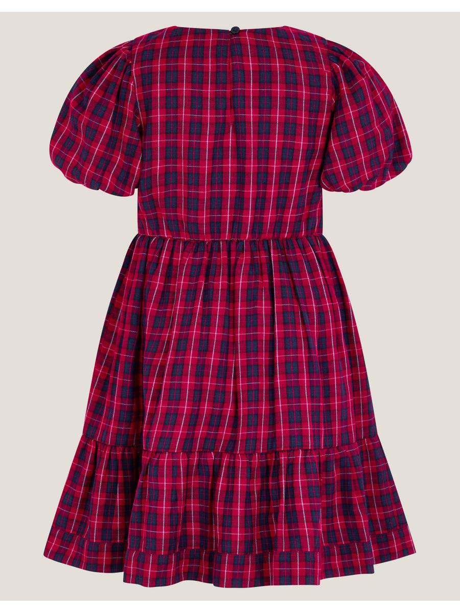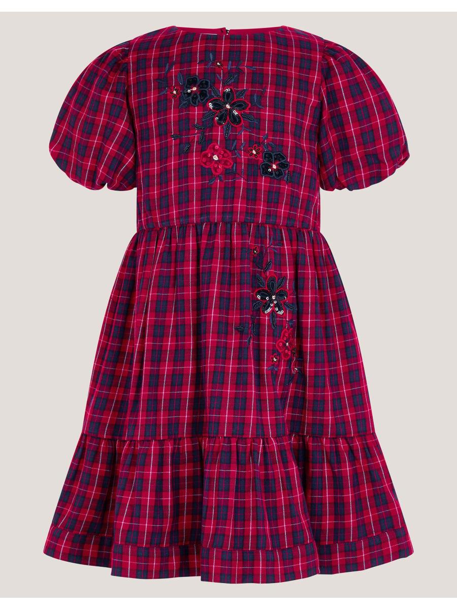 Check this out! Designed in red and navy tartan with puff sleeves for a little drama, this dress is embellished with sequin florals, because who doesn't love daytime sparkles?! Finished with a back button fastening at the neckline. Red