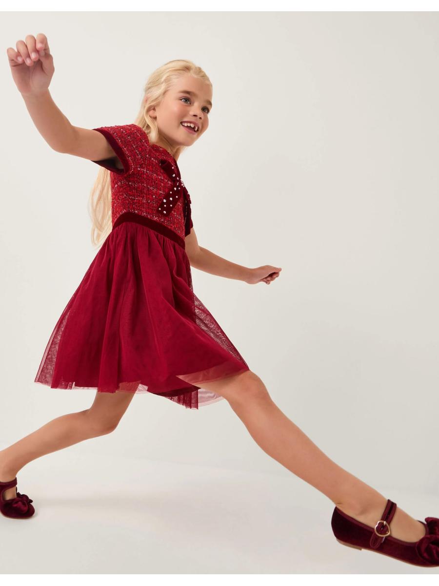 Who wants to party? Designed with a tweed bodice and topped with a glitzy diamanté bow, this dress is made for any special occasion. Complete with a tulle skirt, it's great for twirling on the dance floor. Red