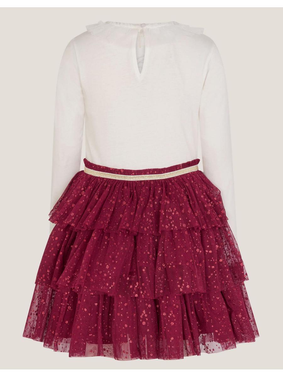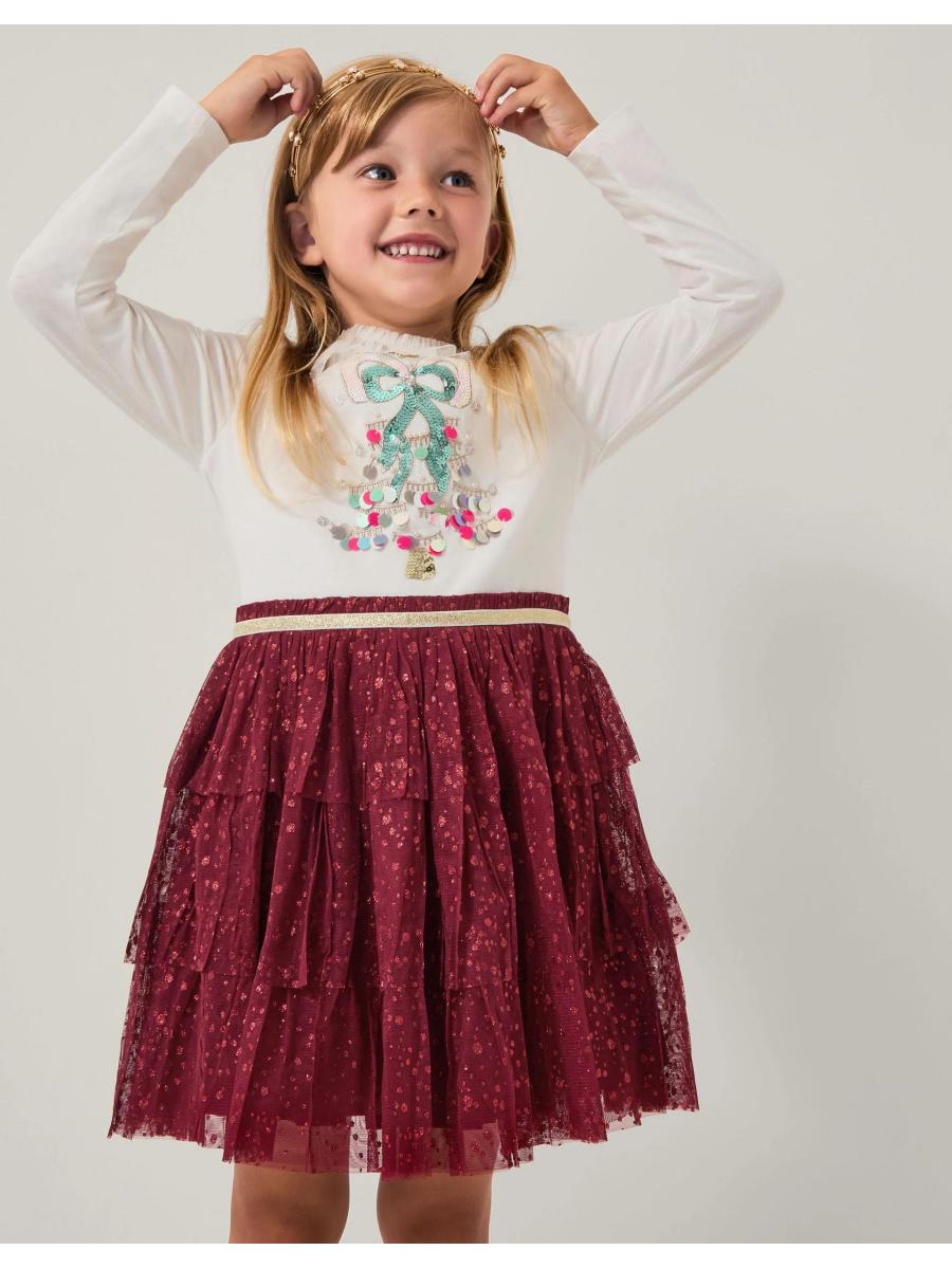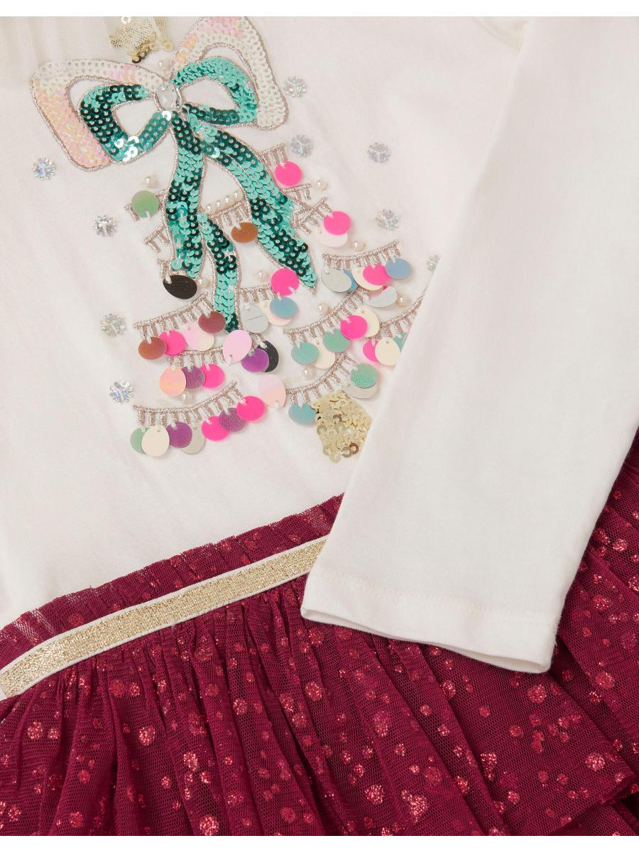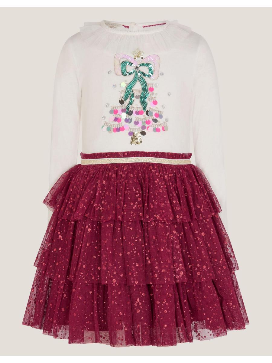Sparkle season. Daywear they'll love showing off throughout the whole of December. Decorated with a bow-tiful sequin Christmas tree on the long sleeve bodice, this disco-ready dress features glitter-spotted tiers of tulle that make up the skirt. Finished with a frilly tulle neckline and button fastenings at the back for easy dressing. Red