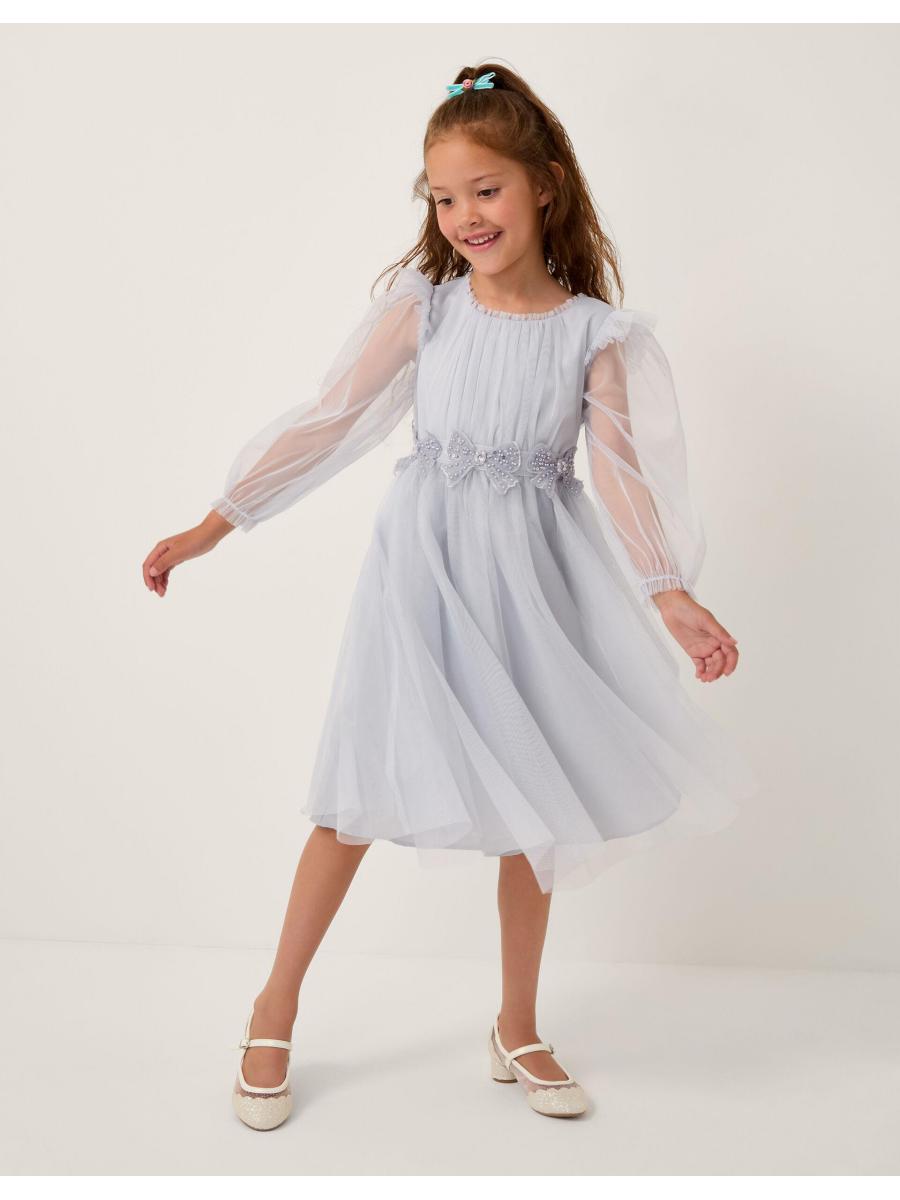 Sheer joy! A twirl-proof party dress they'll love showing off on the dancefloor. Featuring long sleeves and beaded bows around the waistline, it's finished with a pleated bodice and swishy hem. Blue
