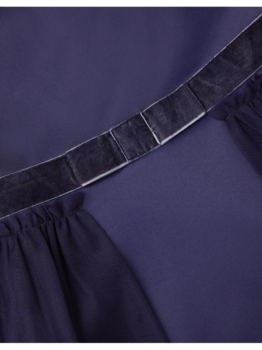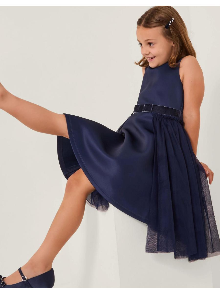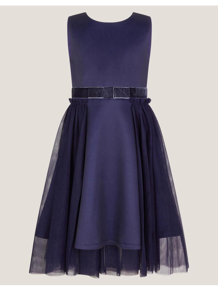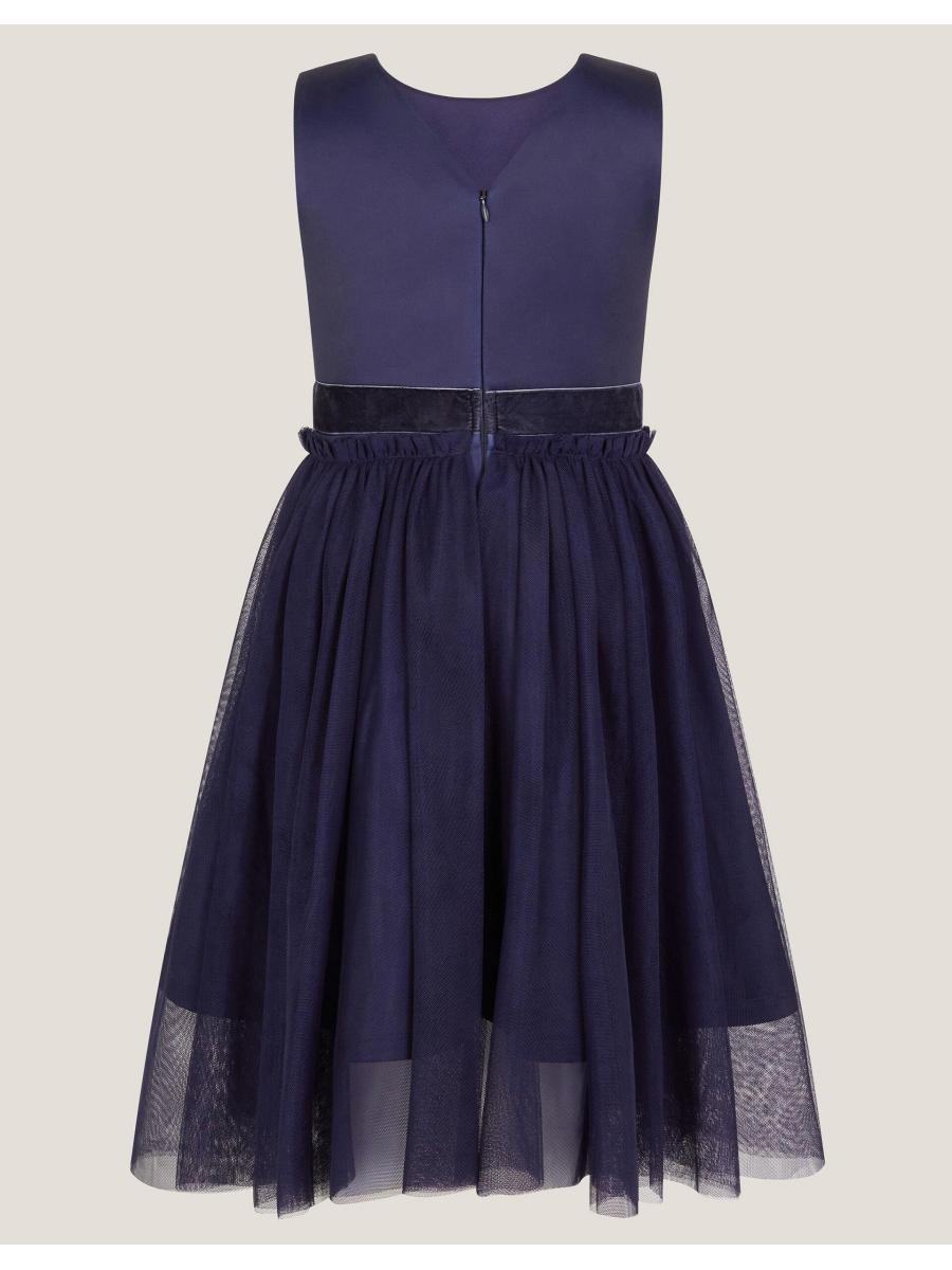 Which way to the dance floor? Perfect for special occasions, this party frock showcases a sleeveless bodice and A-line skirt with a tulle overlay. Finished with a zip fastening and velvet bow detailing at the waist. Blue