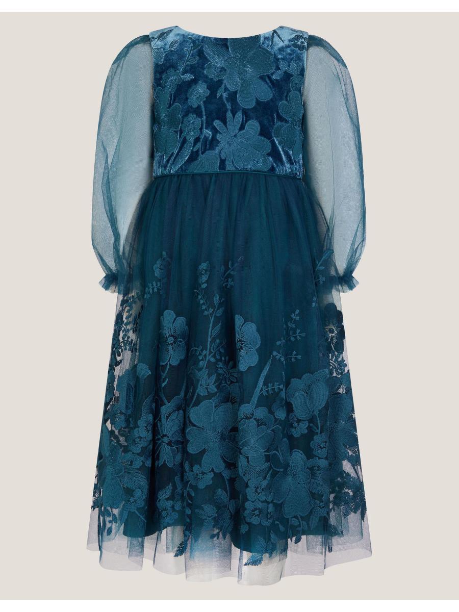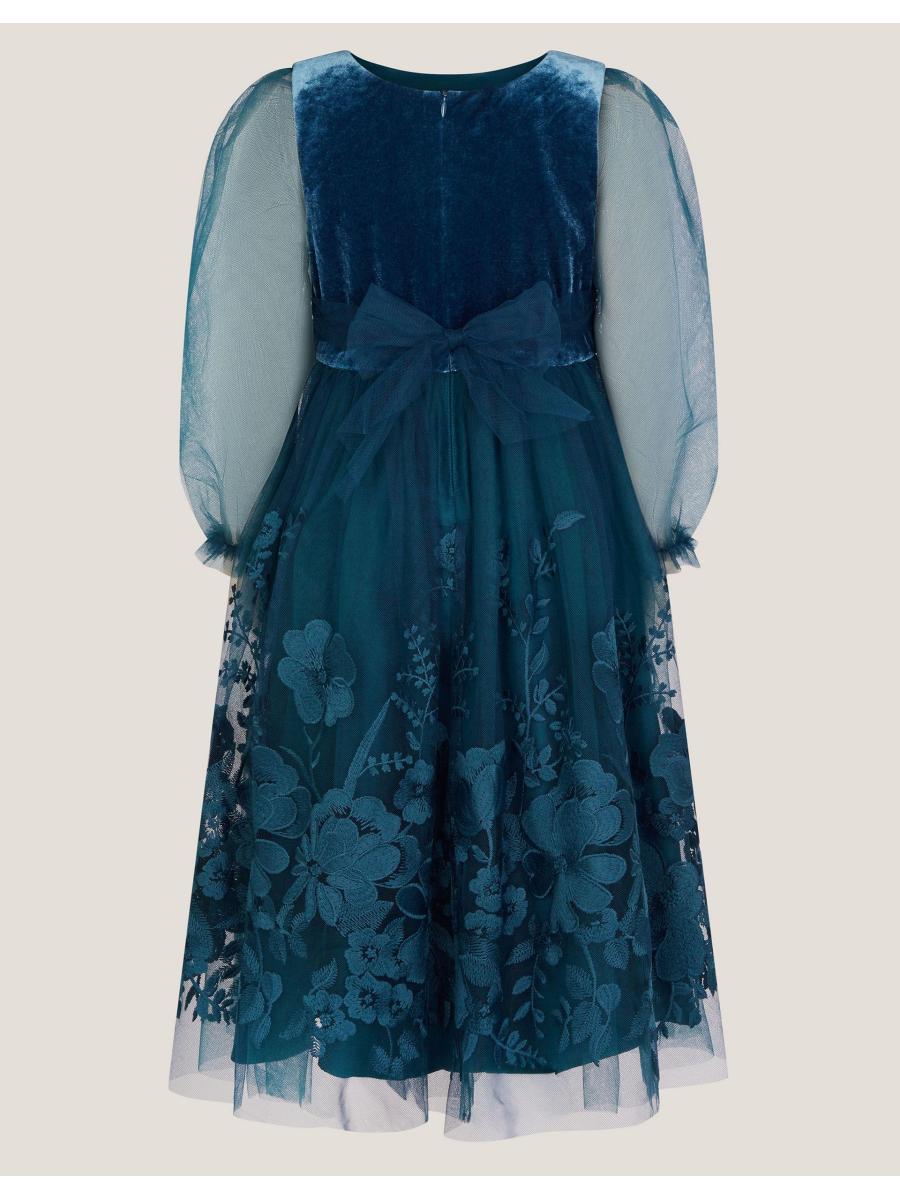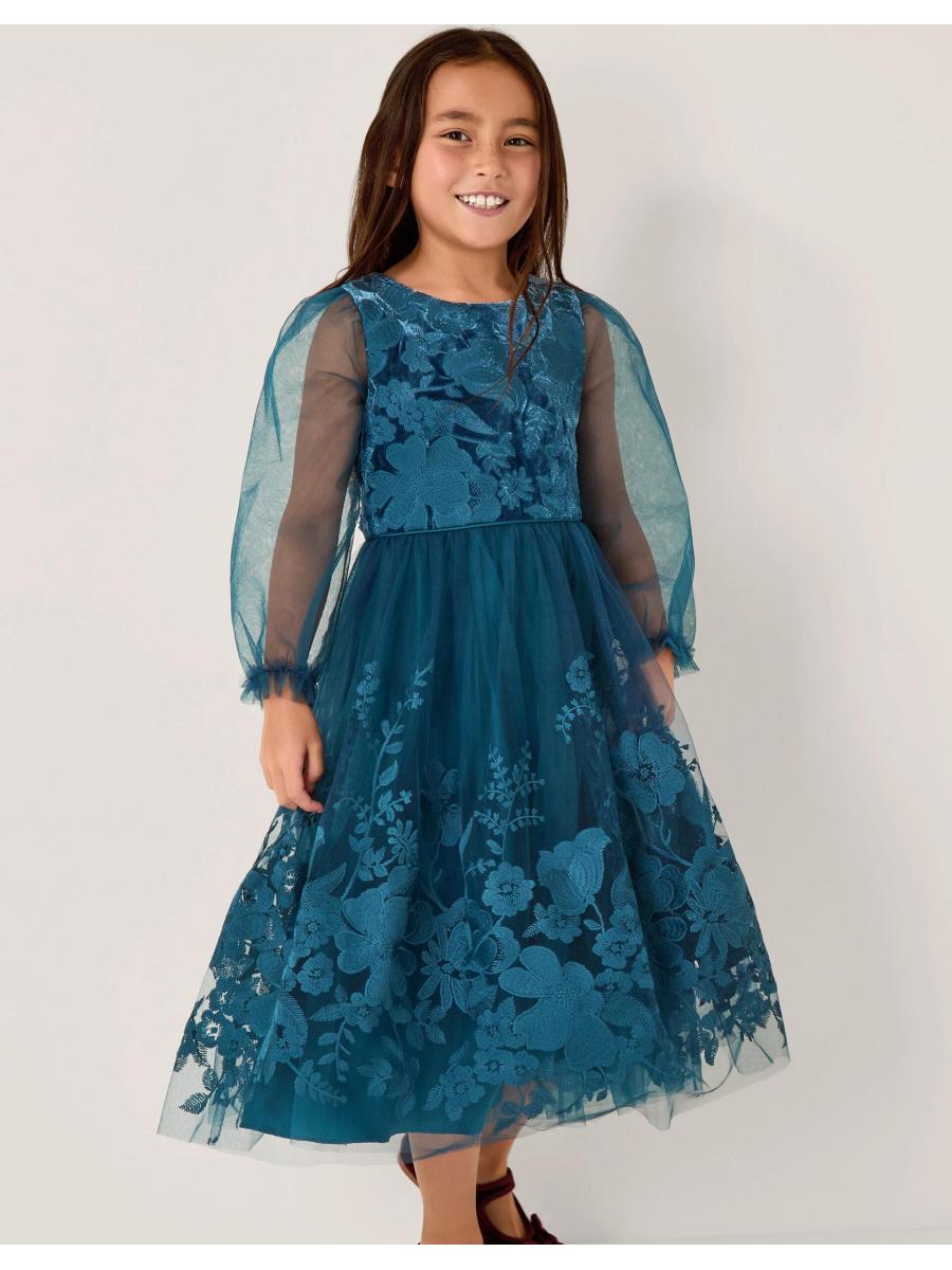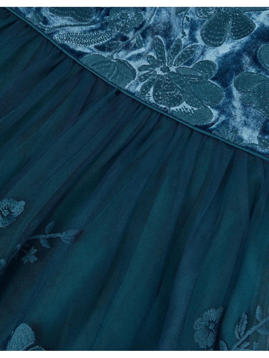 Too gorgeous for words. Perfect for special occasions, this party frock features a velvet bodice and tulle skirt topped with floral embroidery. Designed in a dreamy teal hue, it's finished with long, puffy sleeves. Teal
