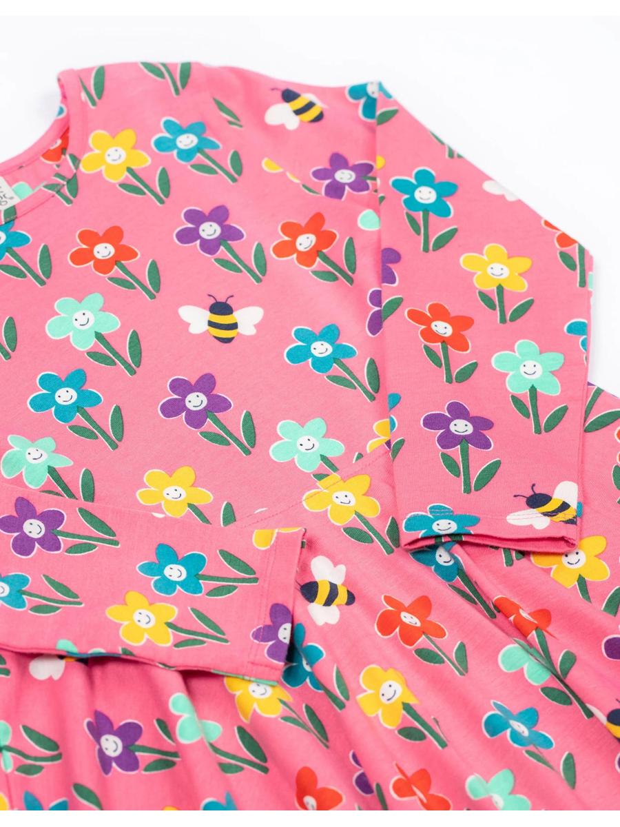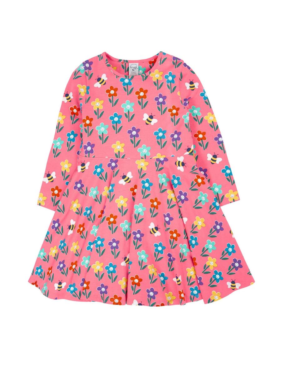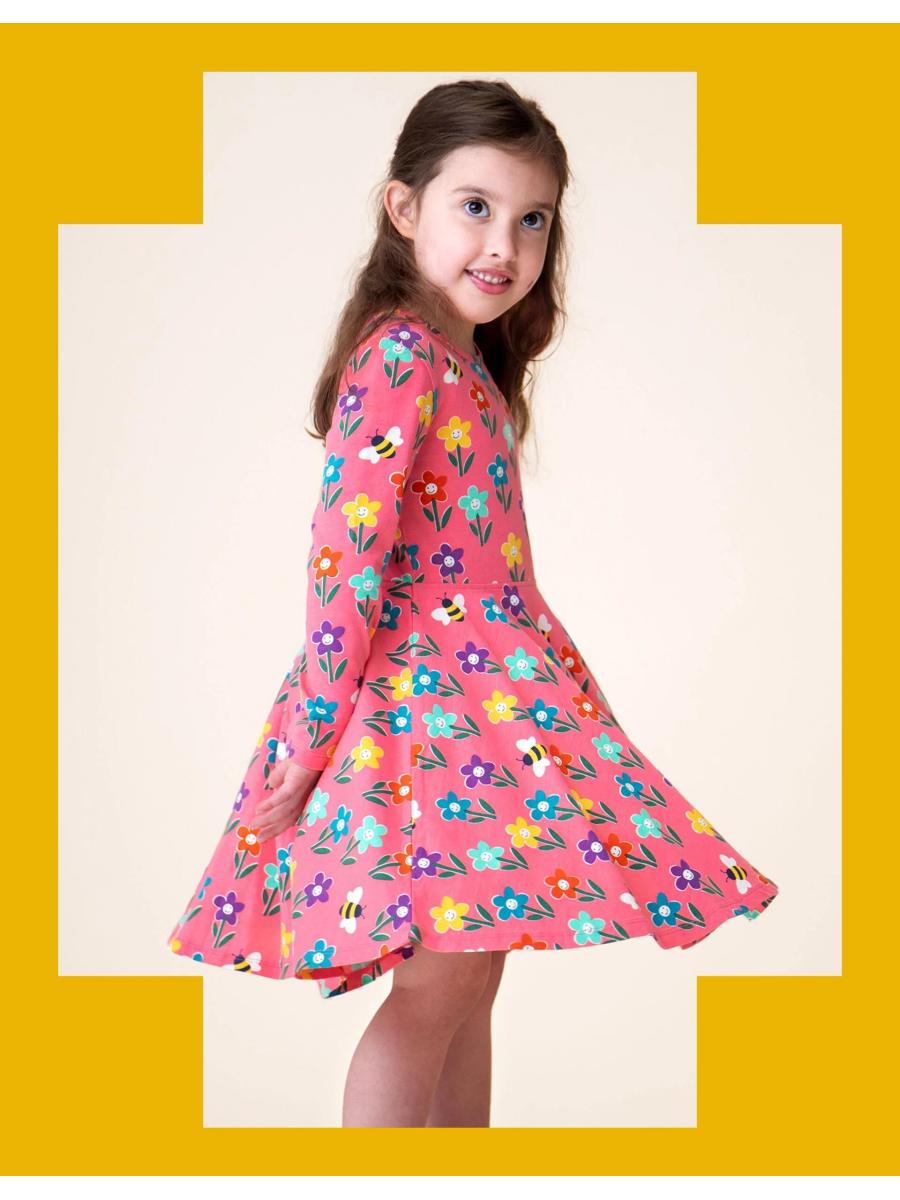 The product: Ready. Set. SPIN! A playful addition to their joyful wardrobe, this dress is soaked in a pigment-popping colour and patterned with fun motifs. Designed with long sleeves and a skater-style skirt ready for twirling.