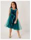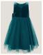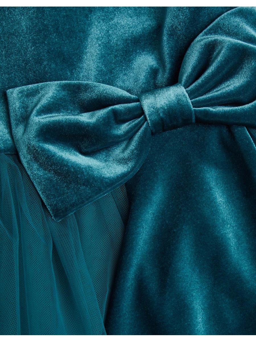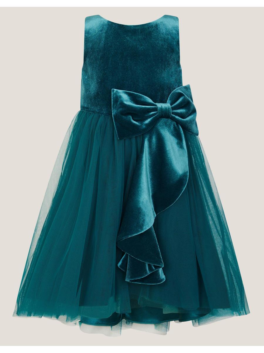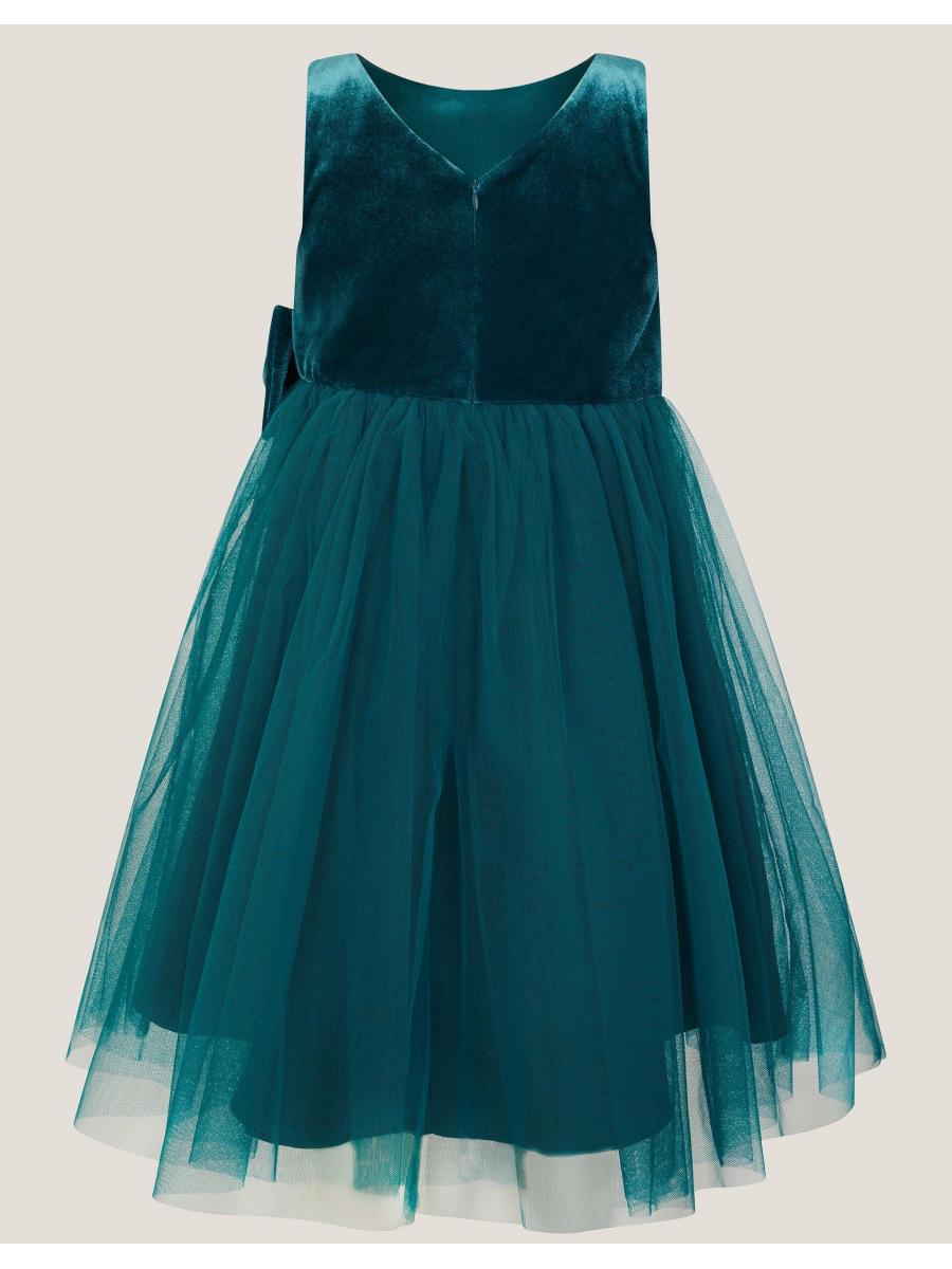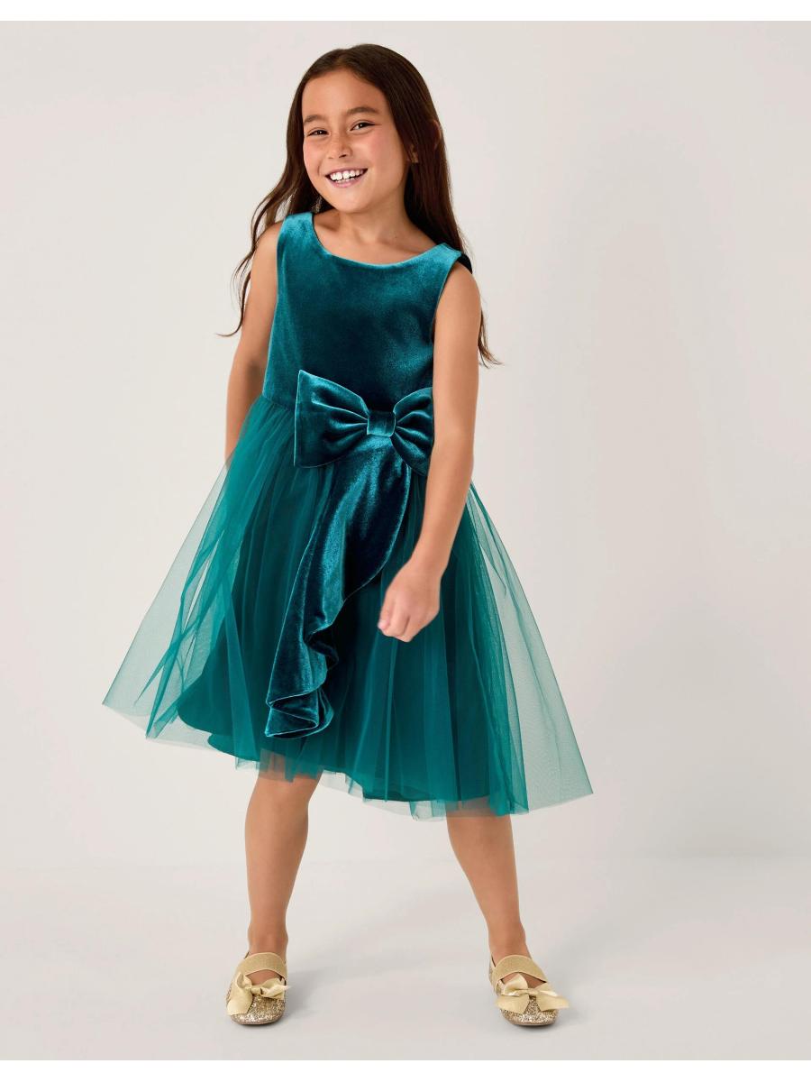 Party in style. Whether they're attending wedding celebrations or dressing up fancy for a birthday party, this dress is ready for any occasion. Designed with a sleeveless bodice in a soft velvet finish, it features a cascading bow at the waist to add even more drama above the puffy tulle hem. Finished with a discreet back zip fastening for easy dressing. Teal