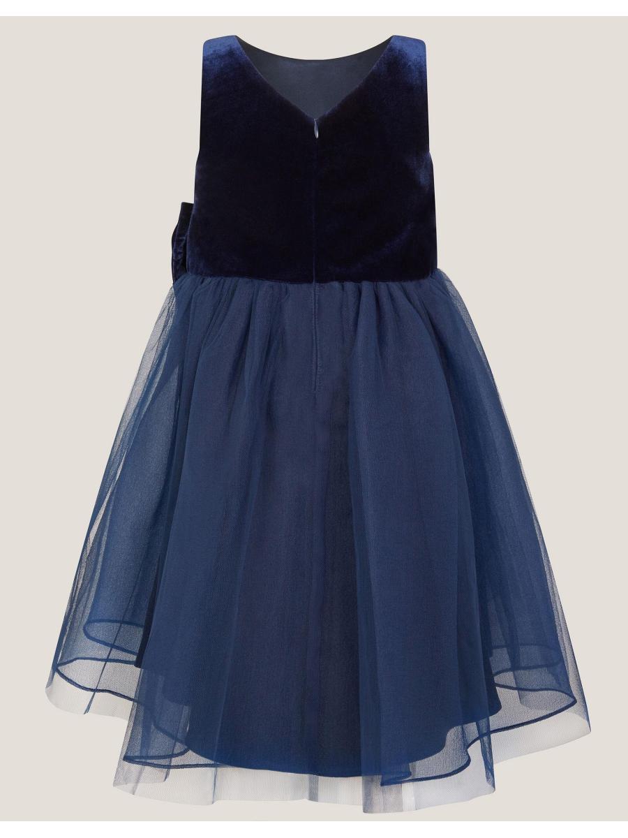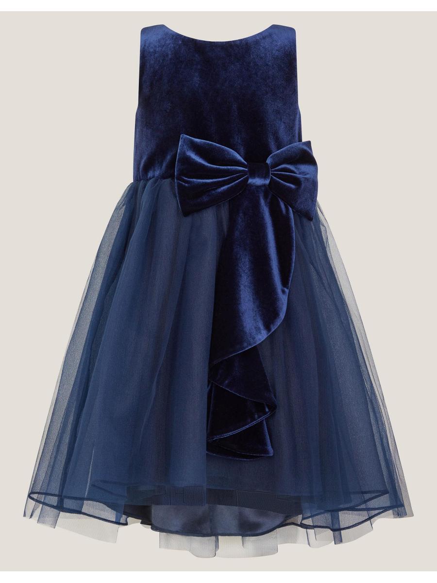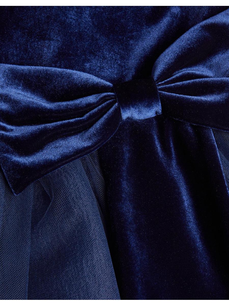 Party in style. Whether they're attending wedding celebrations or dressing up fancy for a birthday party, this dress is ready for any occasion. Designed with a sleeveless bodice in a soft velvet finish, it features a cascading bow at the waist to add even more drama above the puffy tulle hem. Finished with a discreet back zip fastening for easy dressing. Blue