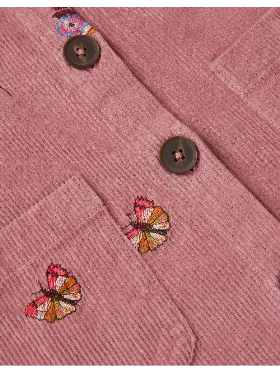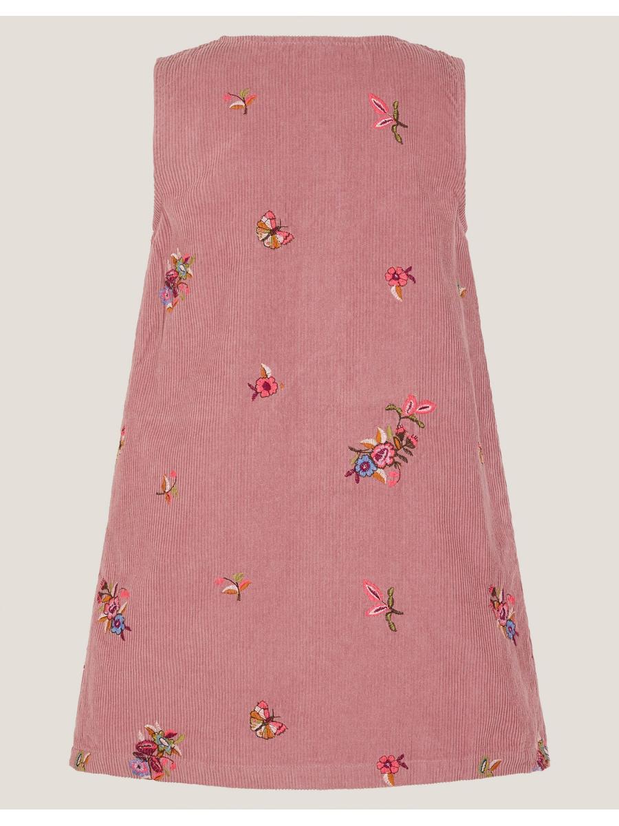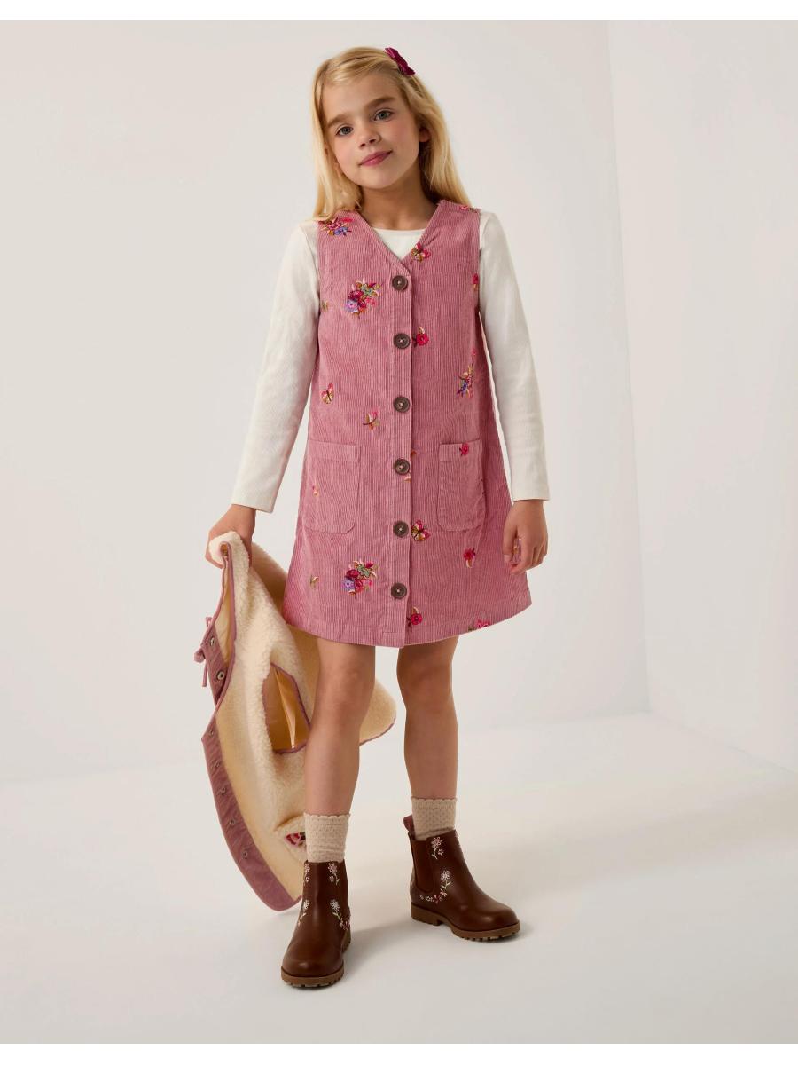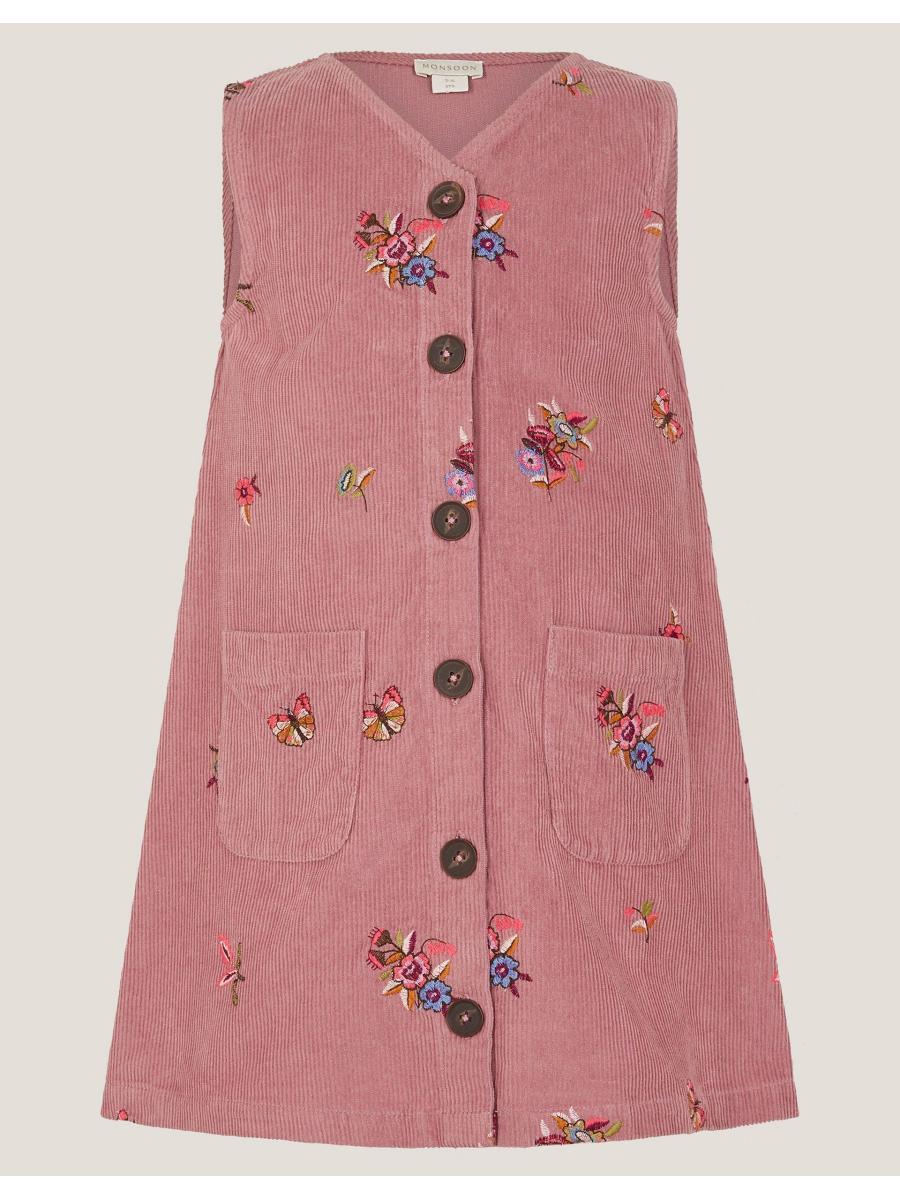 Cute as a button. A dress they can show off throughout the seasons, this pinny is made from soft corduroy with colourful butterflies and flowers embroidered all-over. Finished with a v-neck, front button fastenings and patch pockets, it looks great styled on its own or layered over a T-shirt or long sleeve blouse. Pink