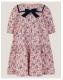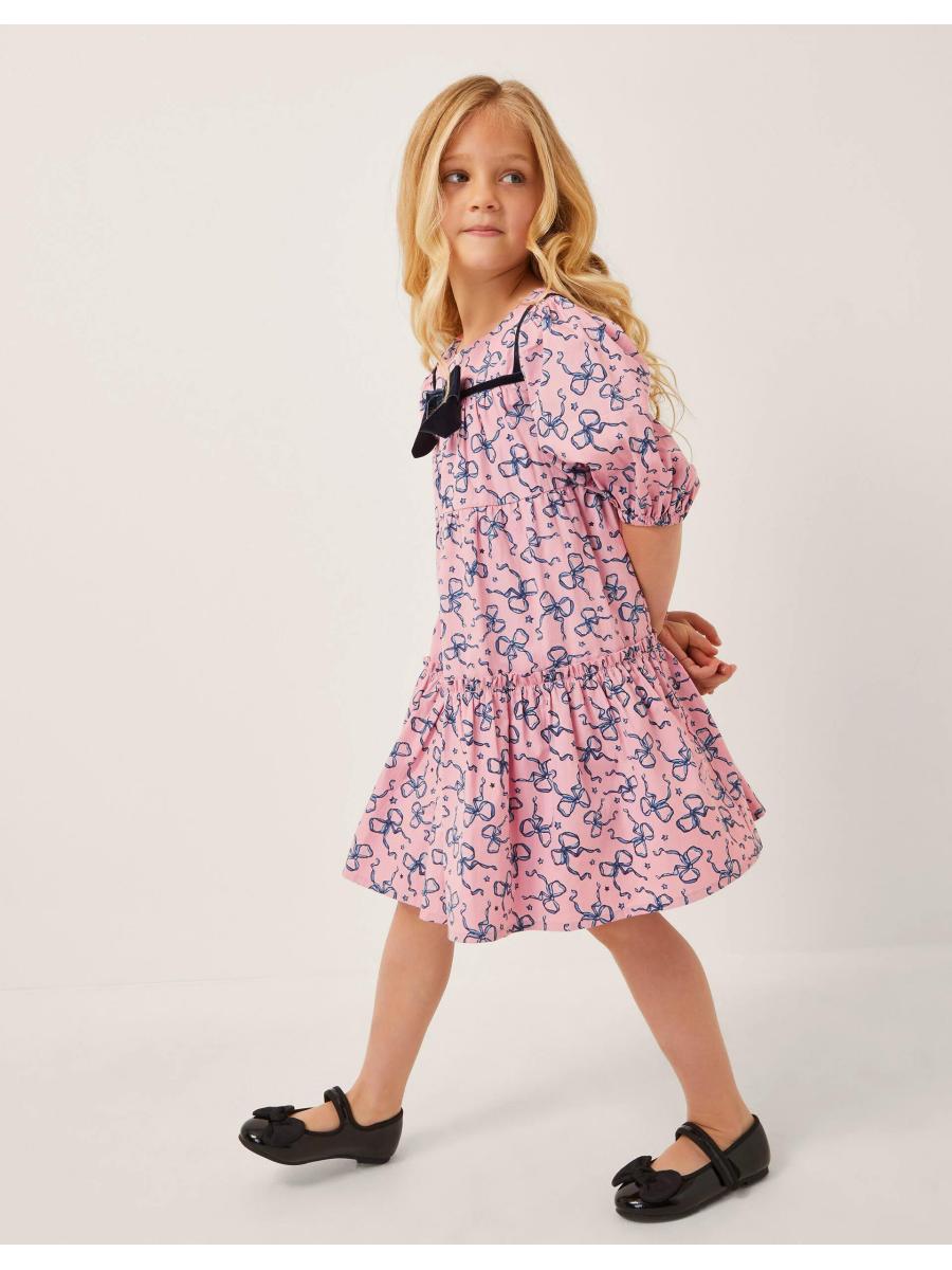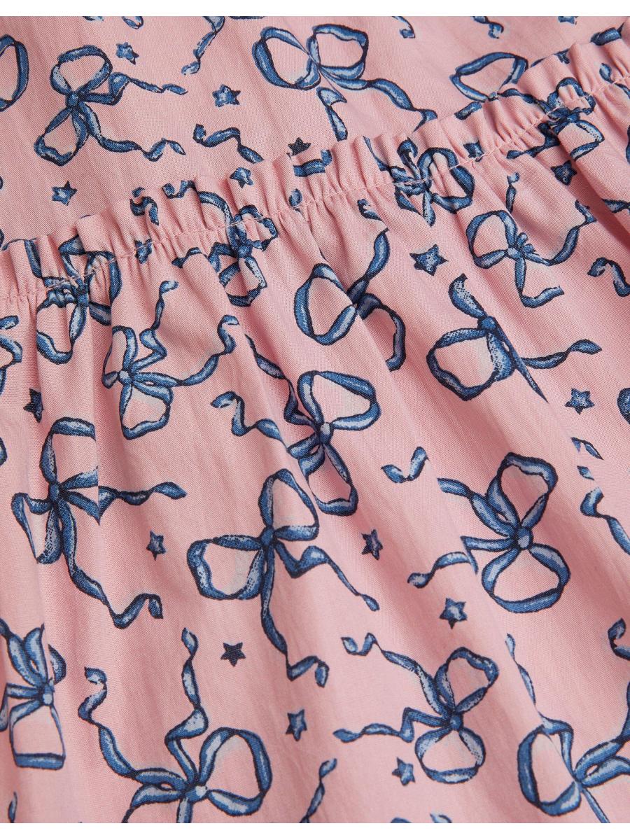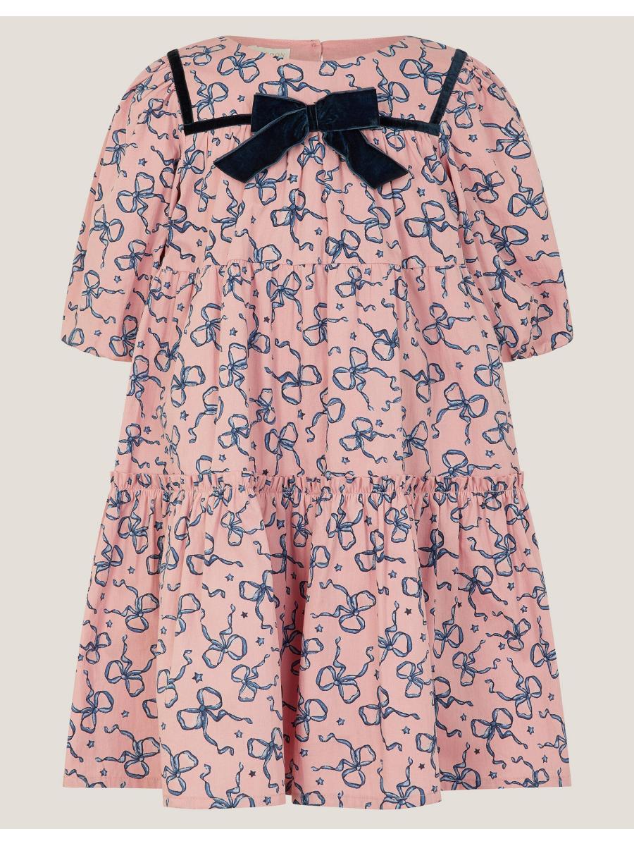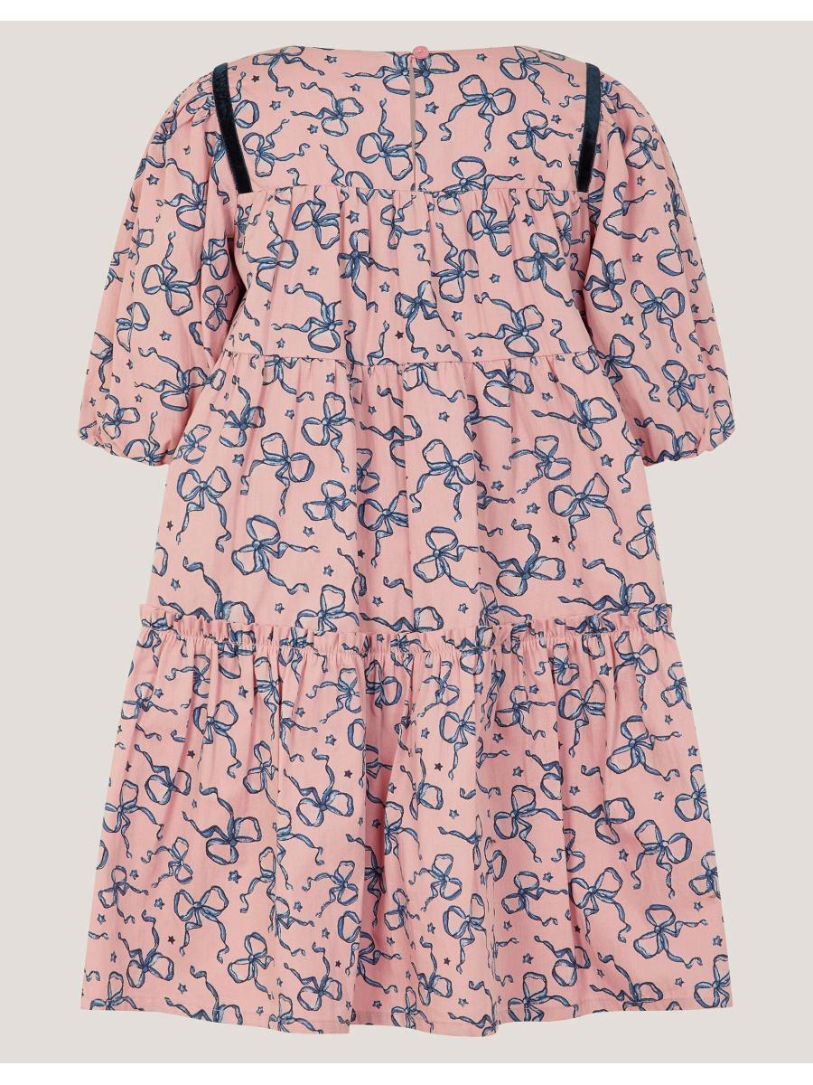 Bows, bows, bows! Made in candyfloss cotton, this swishy dress is printed to perfection. Patterned with blue bows and star motifs over the tiering silhouette, it's finished with a velvety bow detail under the necklace and puffy ¾ sleeves. Pink
