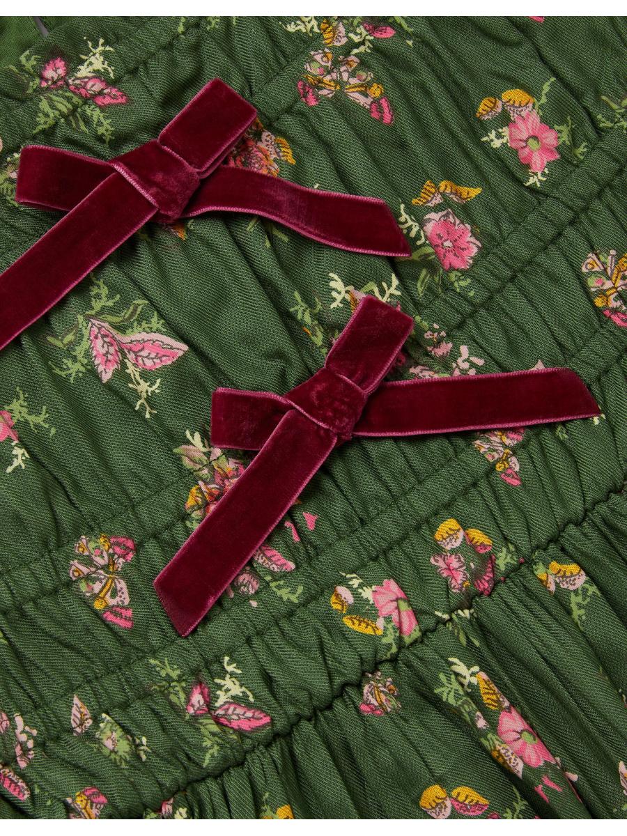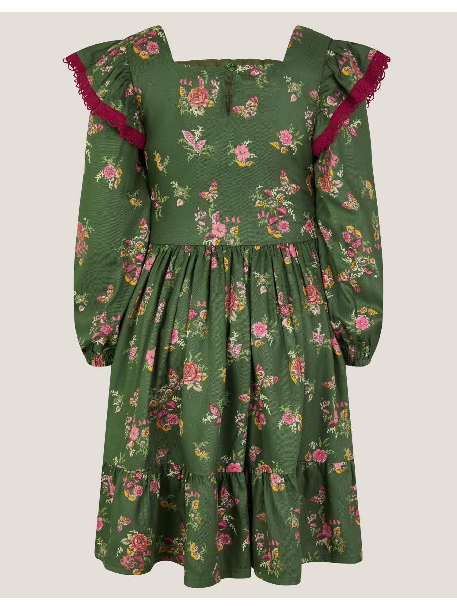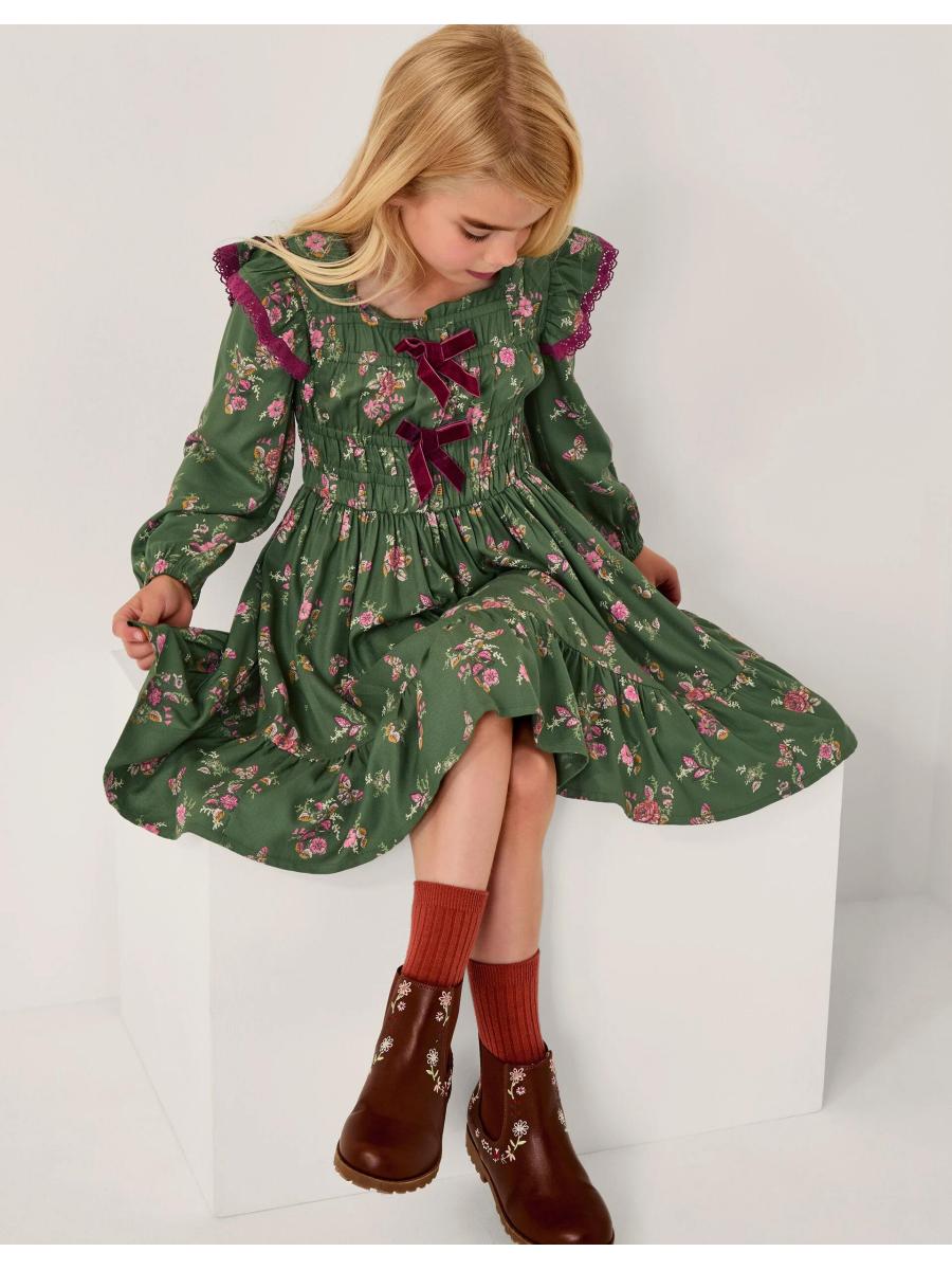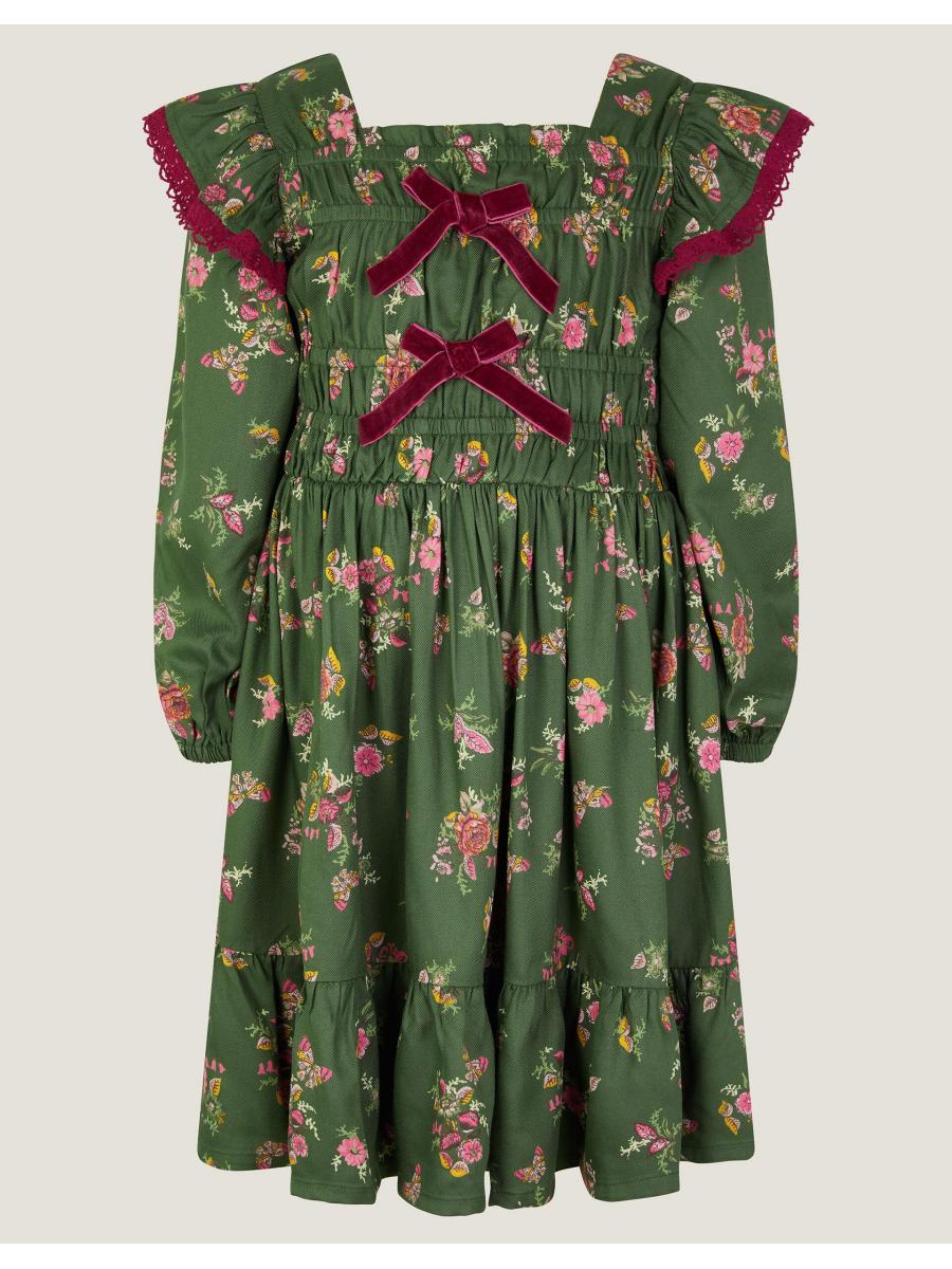 For the social butterflies! Designed with a shirred bodice and decorated with butterfly, bow and floral motifs throughout, this dress is perfect for special occasions. Velvet bows and ruffle sleeves add the perfect final touch. Green