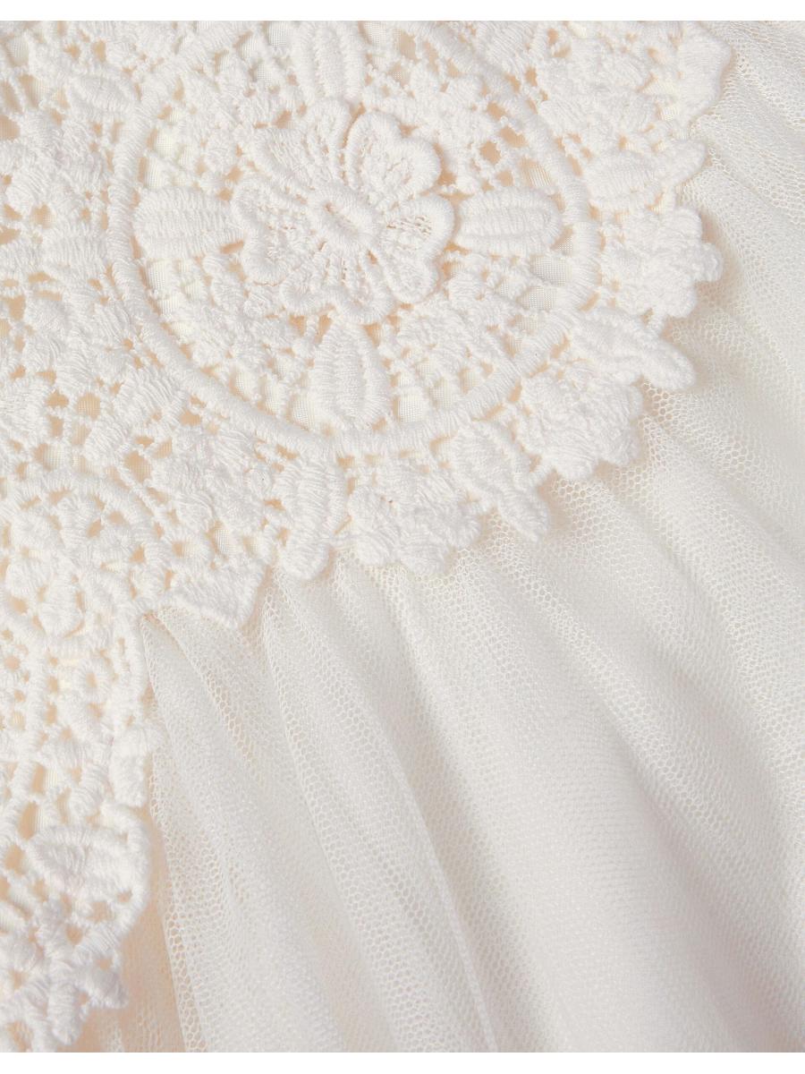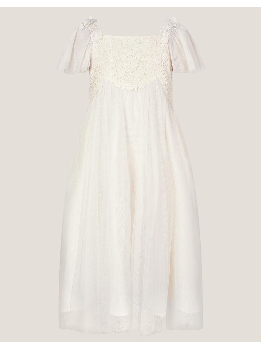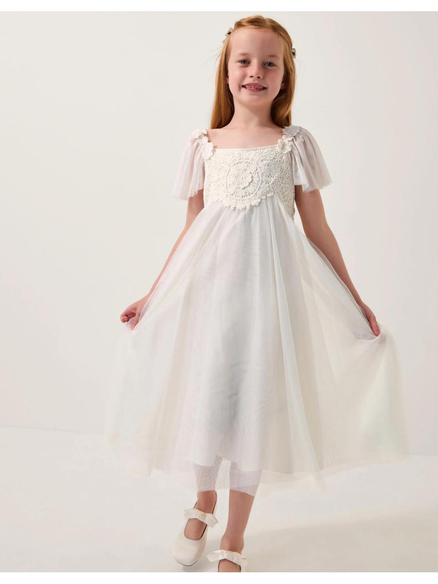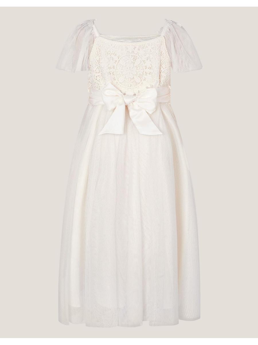 Bohemian beauty. Designed with a crocheted lace bodice, tulle sleeves and a swishy hem to match, this dress is perfect for any special occasion. Finished with a zip fastening and bow to the back. Ivory