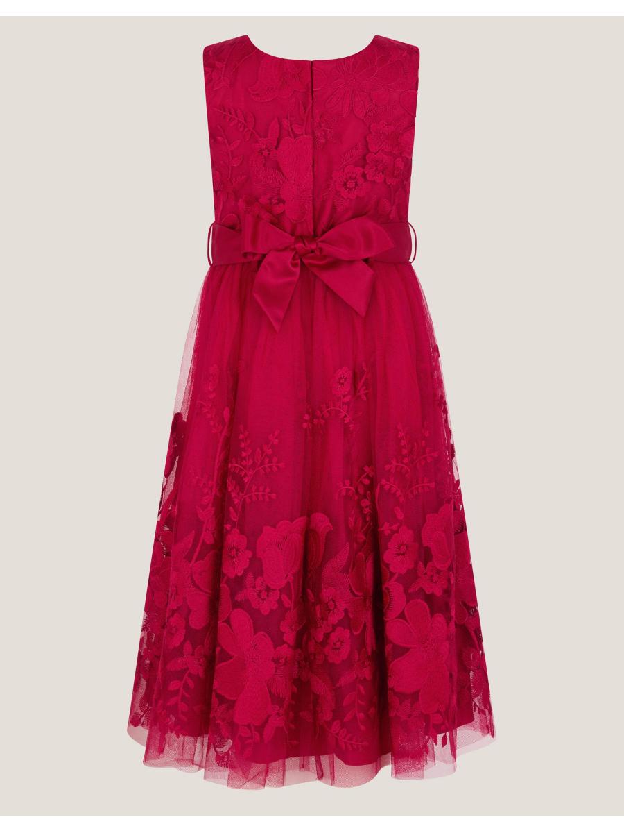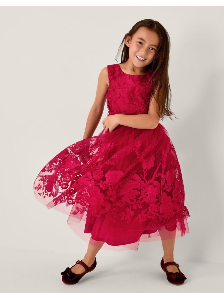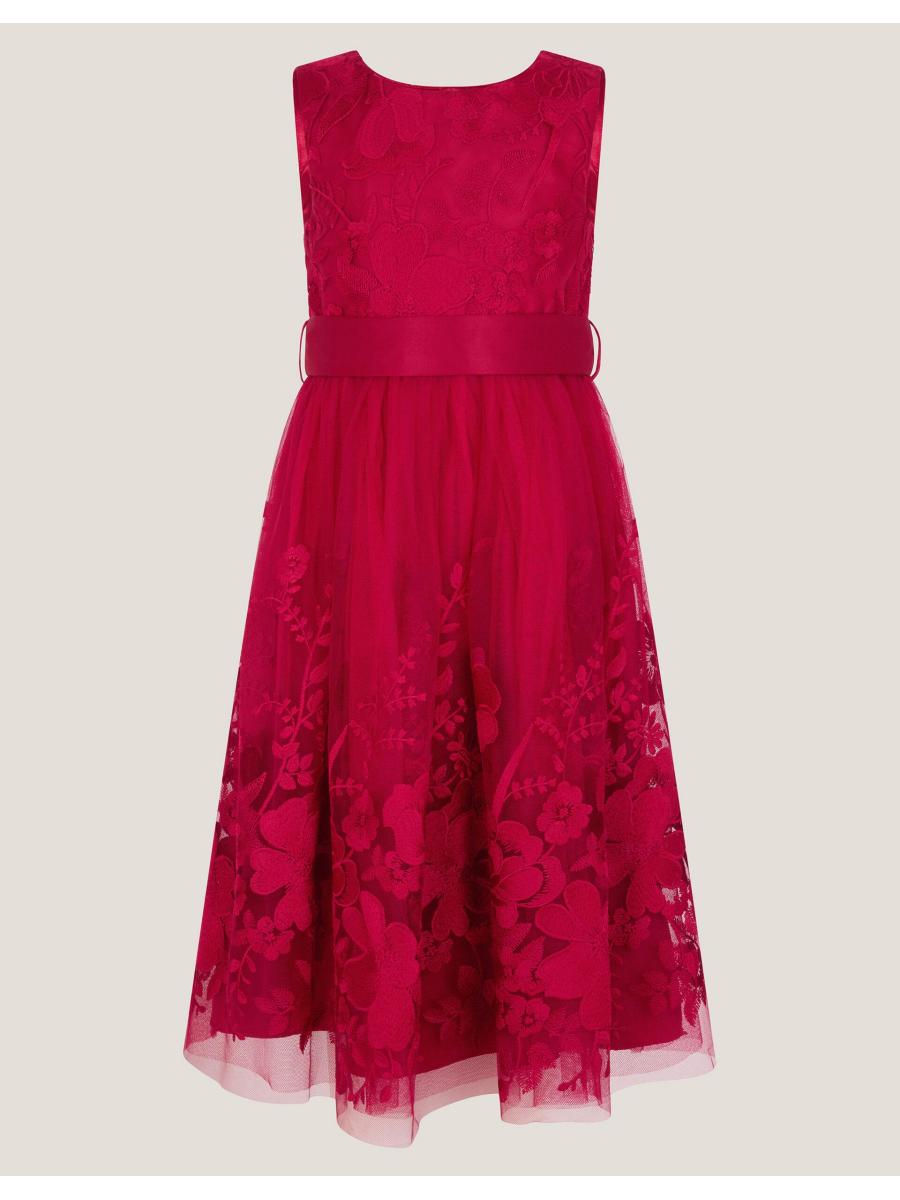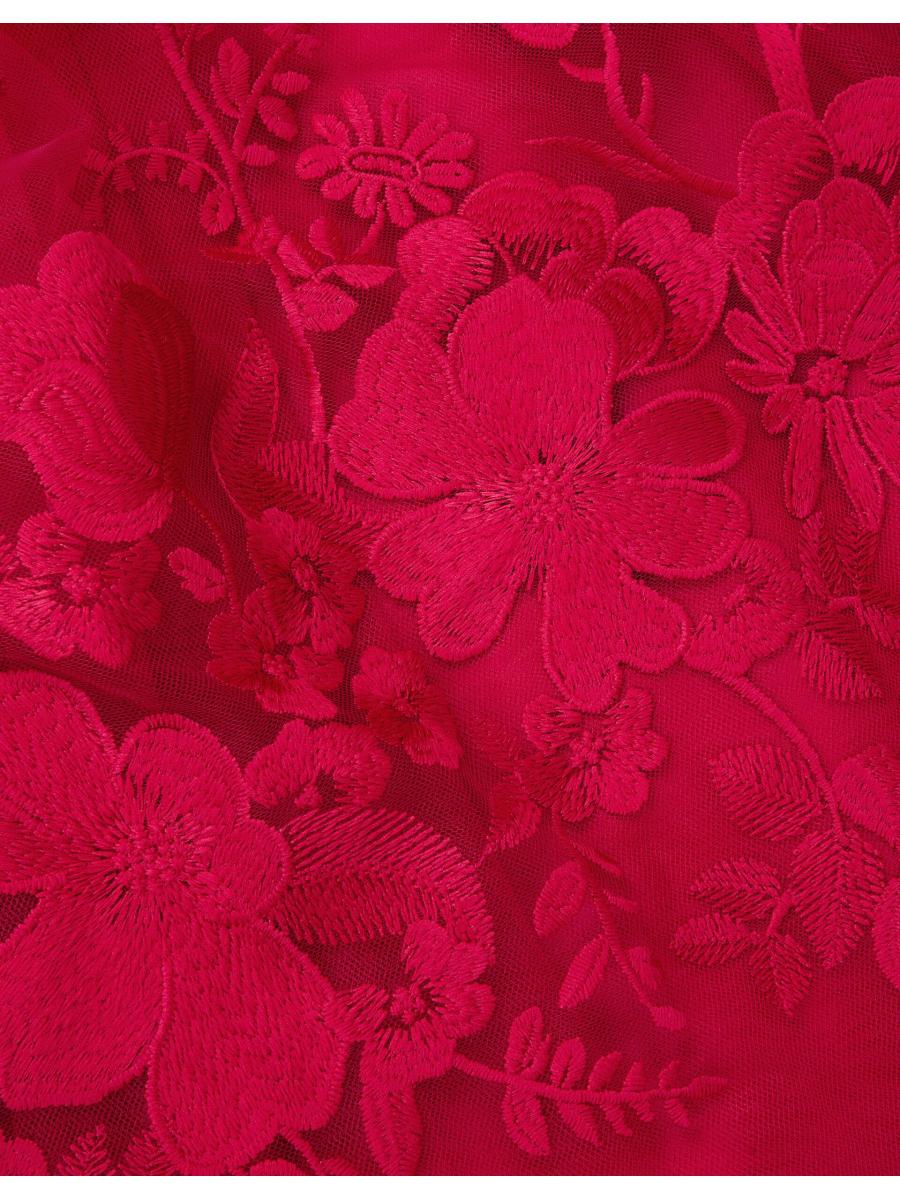 Sure to be best-dressed in this! Soaked in a ruby red colour, this dress is ready for swishing and twirling on the dancefloor. Designed with a sleeveless bodice and ribbon bow belt, it's decorated with floral embroidery over the delicate layer of tulle. Red