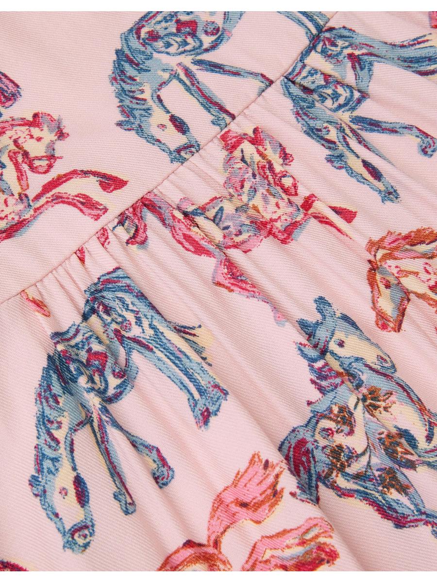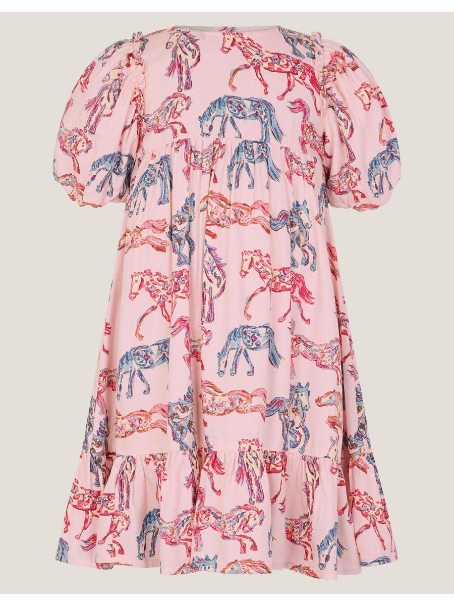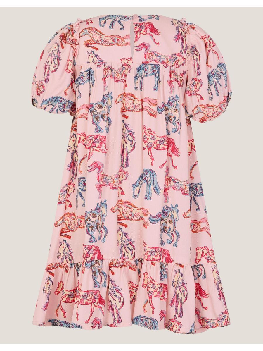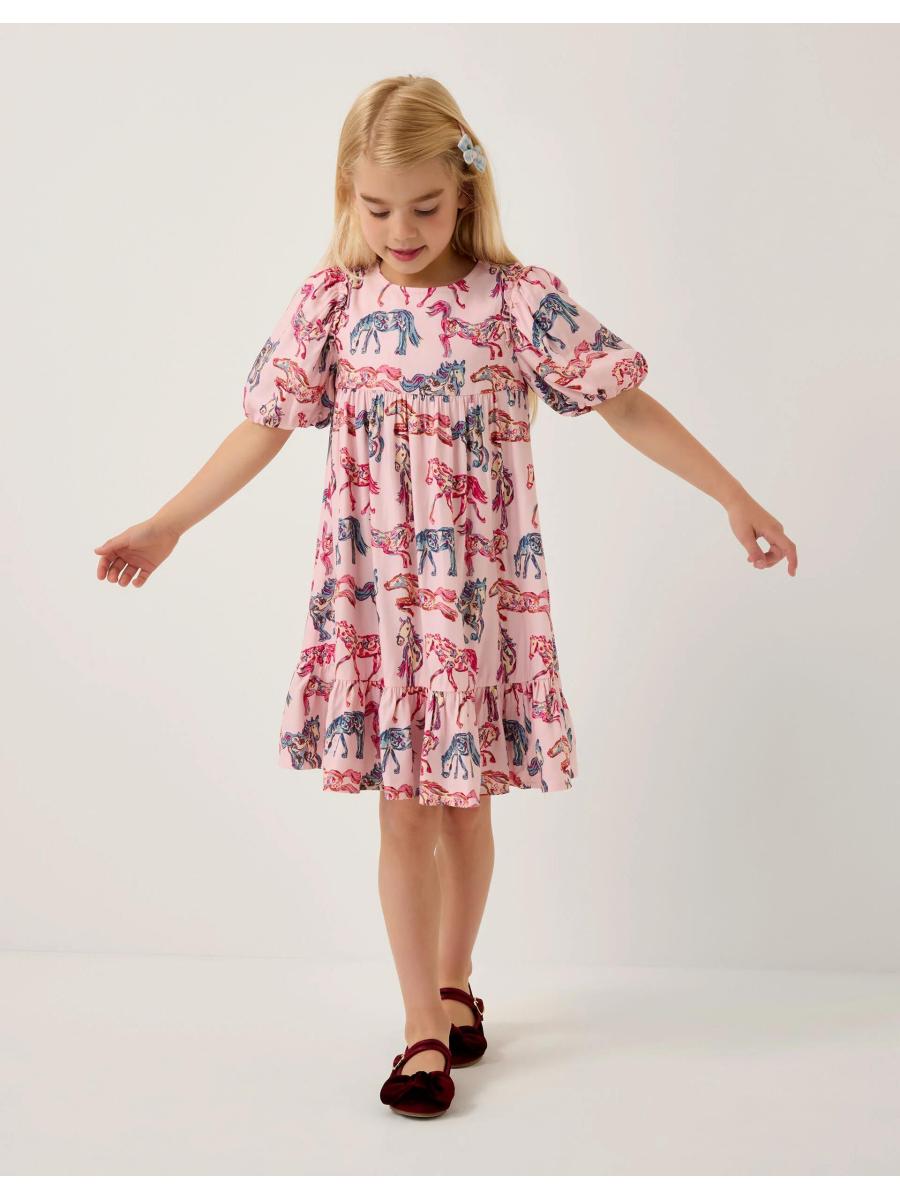 Not their first fashion rodeo. Designed in baby pink with decorative horses galloping around the swishy silhouette, this Western-inspired dress is framed with puff sleeves for a playful finish. Complete the look with cowboy boots and a big YEEHAW! Pink