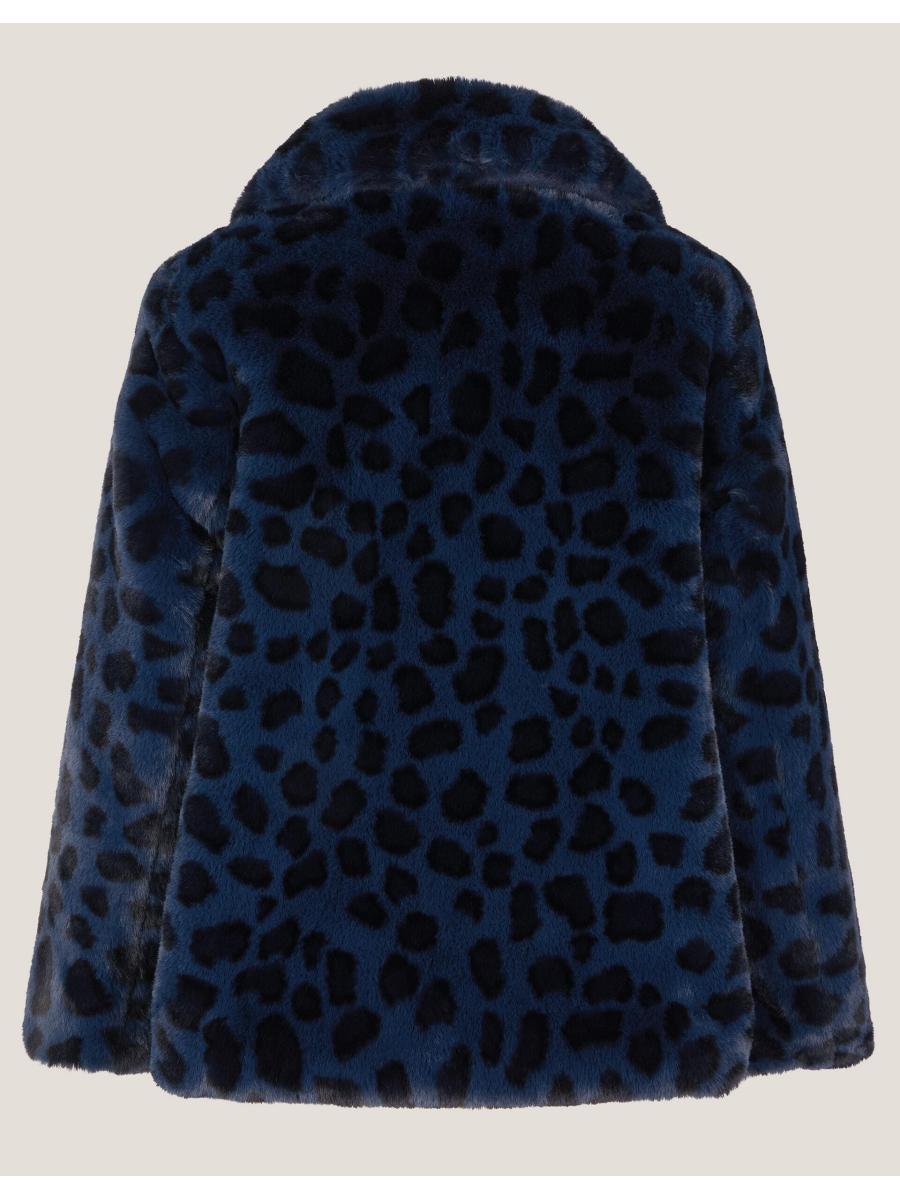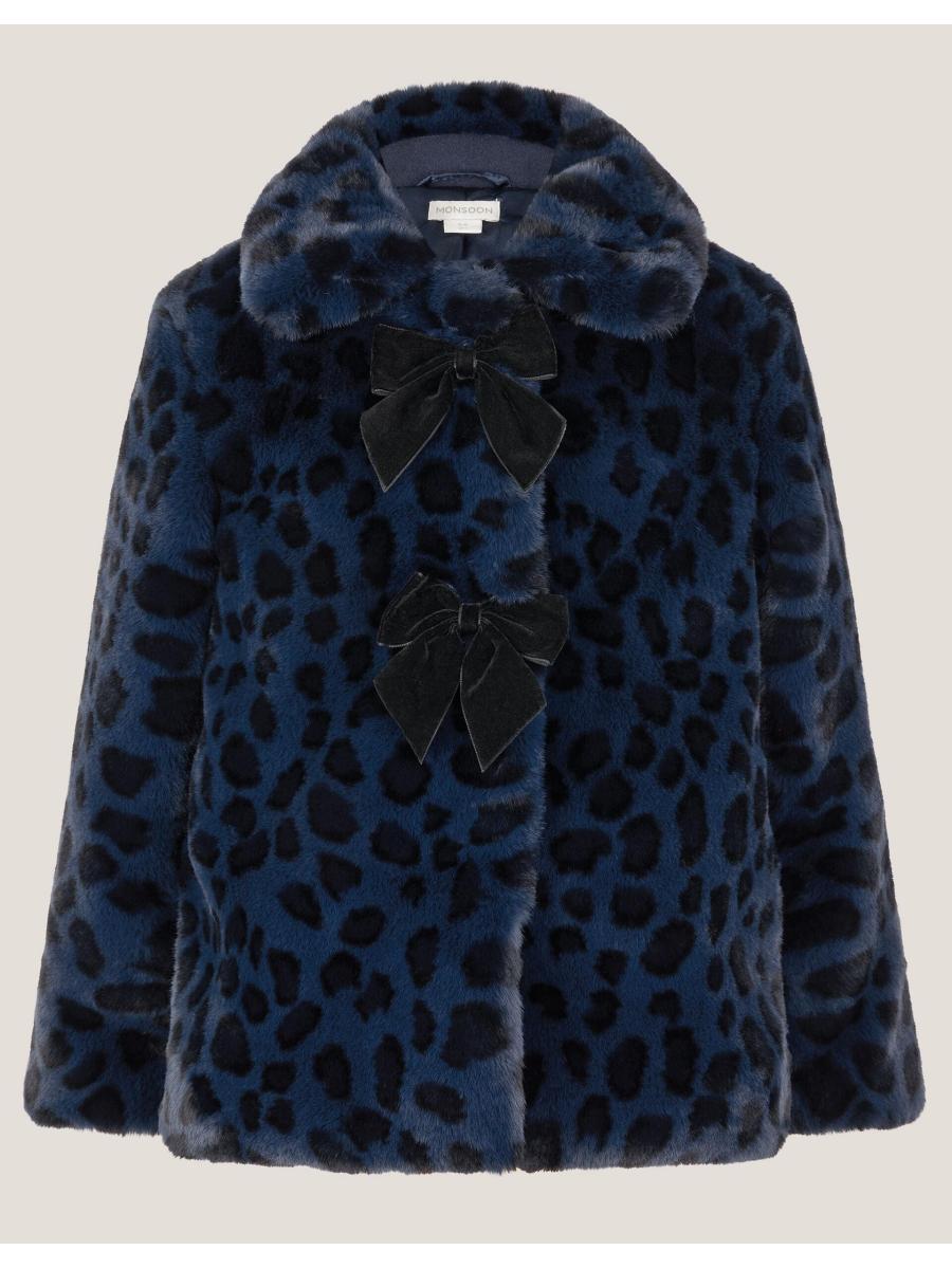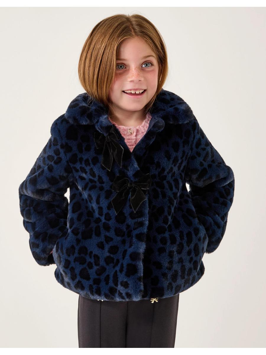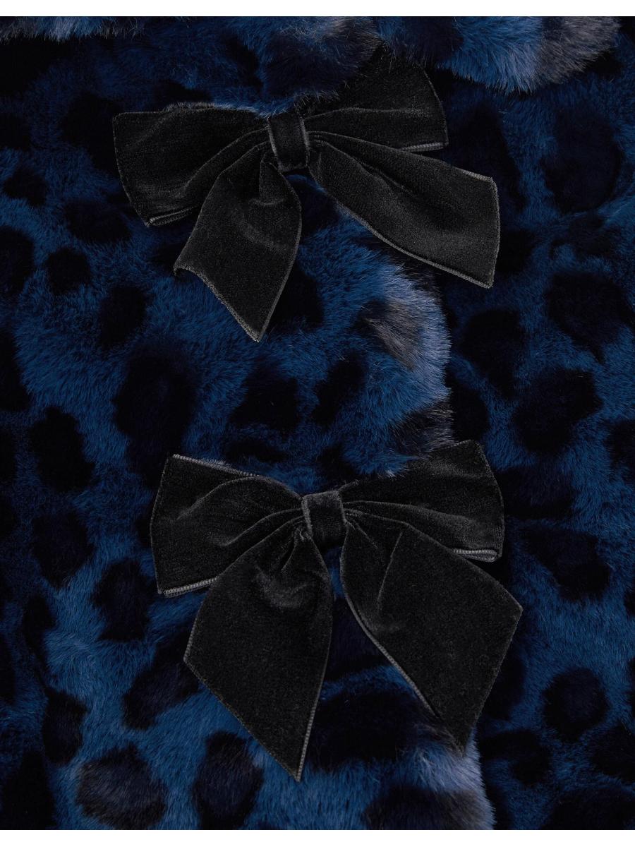 For the wild ones. Crafted in faux fur and featuring a fun animal print design, this coat is guaranteed to keep them warm throughout the colder months. Finished with velvet bows to the front. Blue