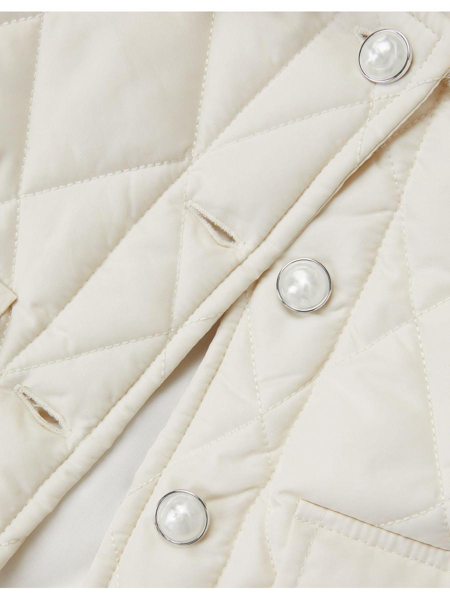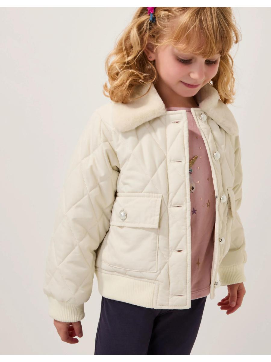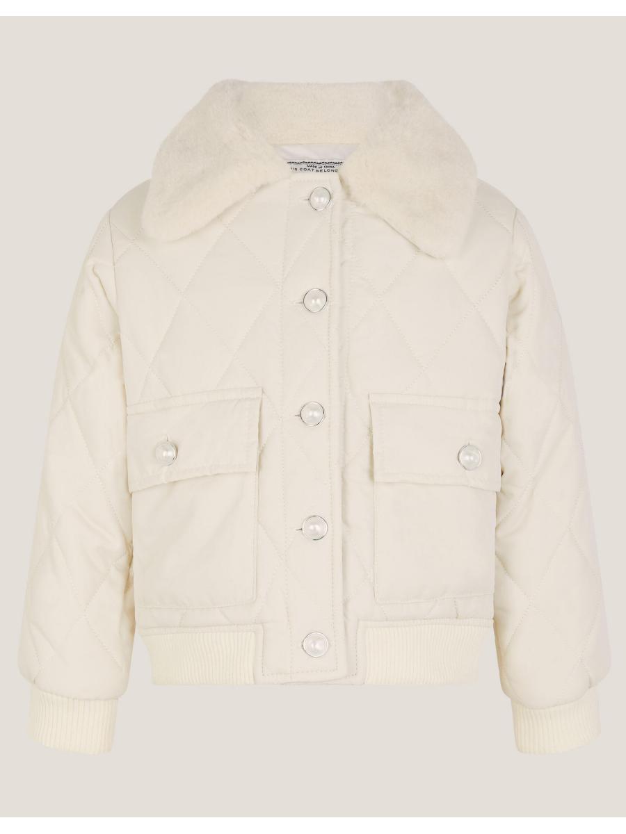 Serving looks, not chills. Snow-M-G, this jacket is a great choice for the transition from autumn to winter styling. Inspired by a bomber jacket silhouette, it's topped with a snuggly soft faux fur collar, stitched with diamond quilting and finished with big pearly button fastenings. Cream