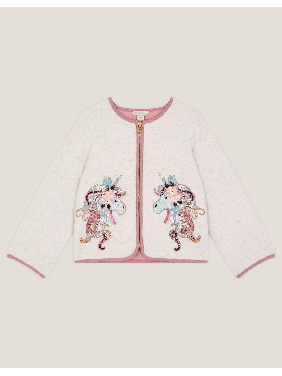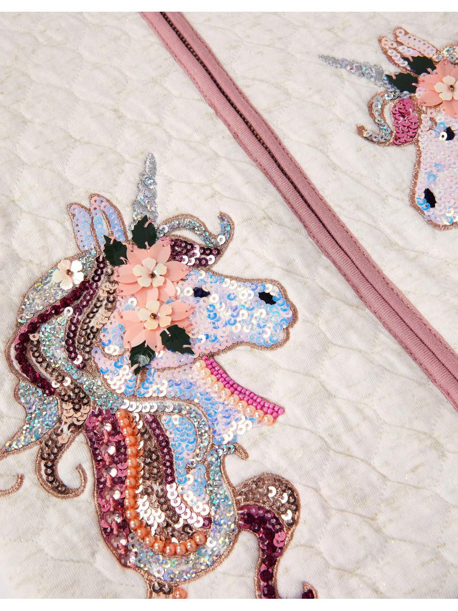 Hey, magical princess! The perfect finishing touch to all their party looks, this bomber jacket is bedazzled with sparkly unicorns over the quilted backdrop. Complete with pink trims and a front zip fastening. Ivory