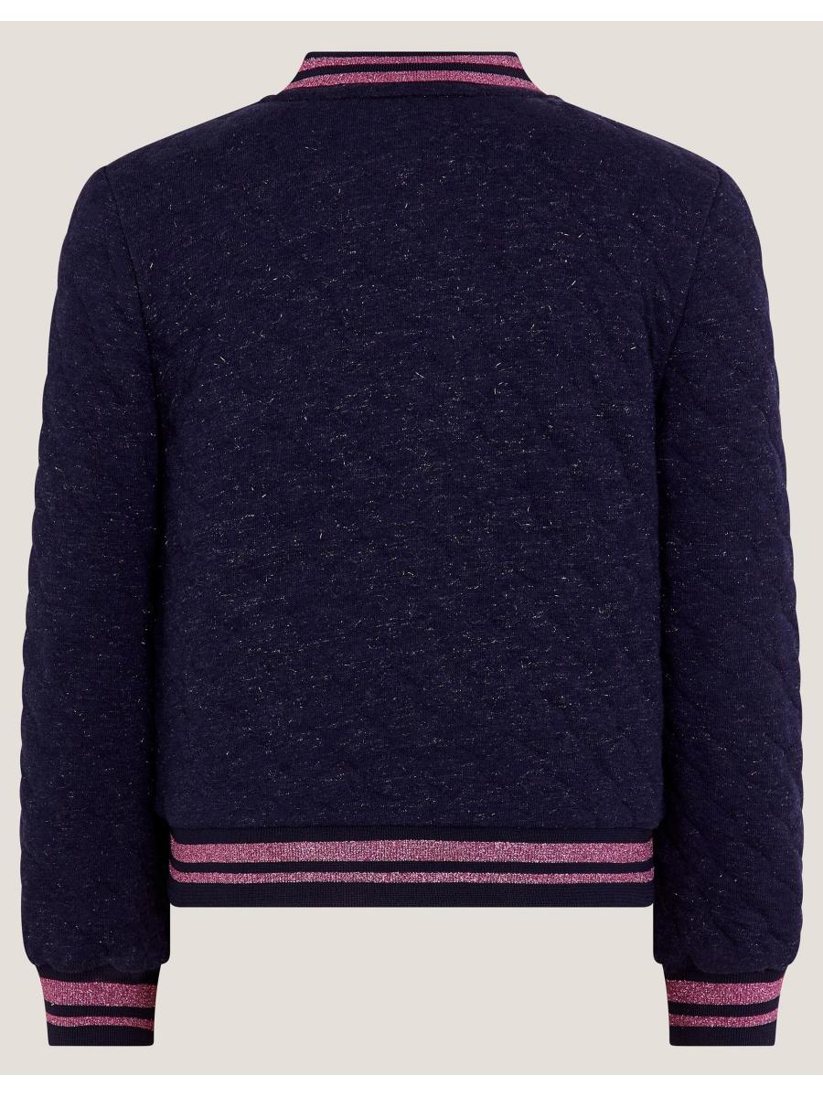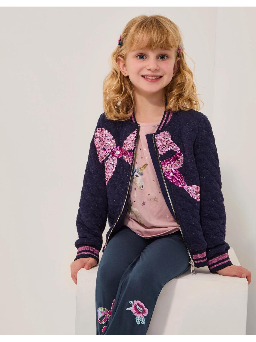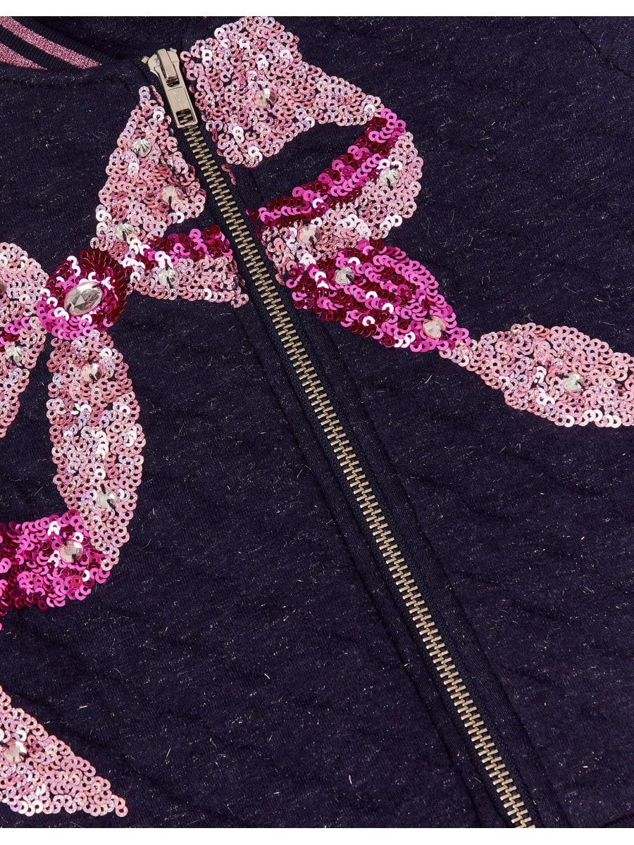 Sparkles: Daywear edition. Designed in a classic bomber style, this jacket showcases an XL pink sequin bow through the front, matching the stripes at the neckline, cuffs and hem. Finished with a zip fastening for easy dressing. Blue
