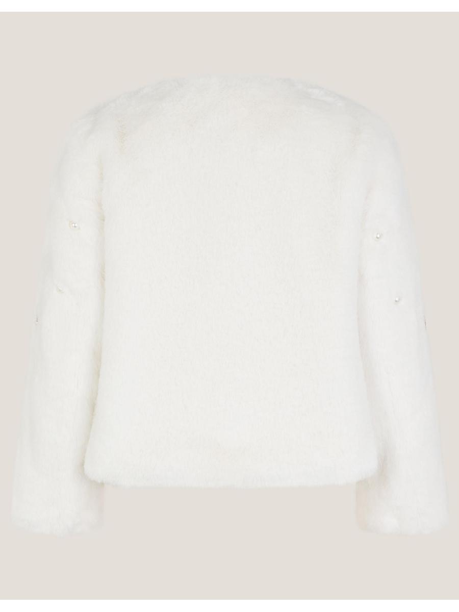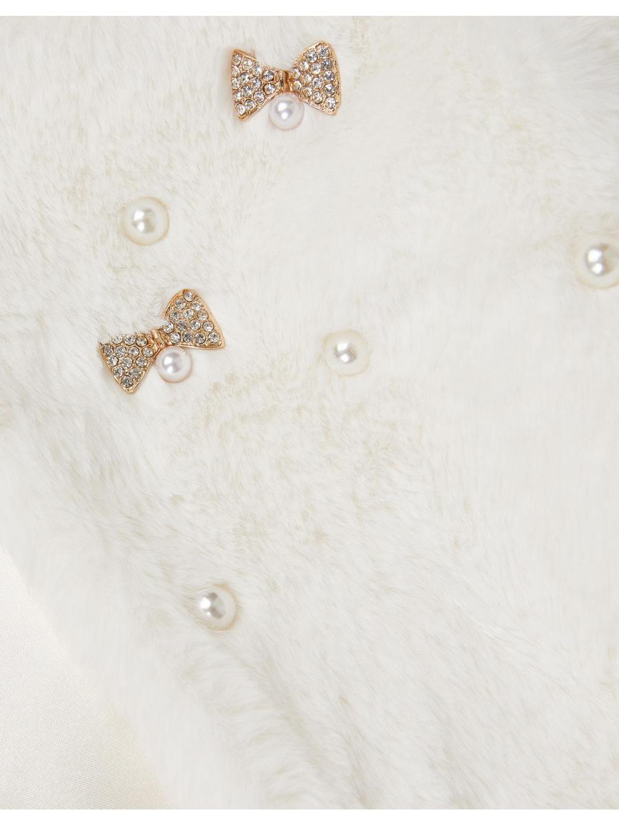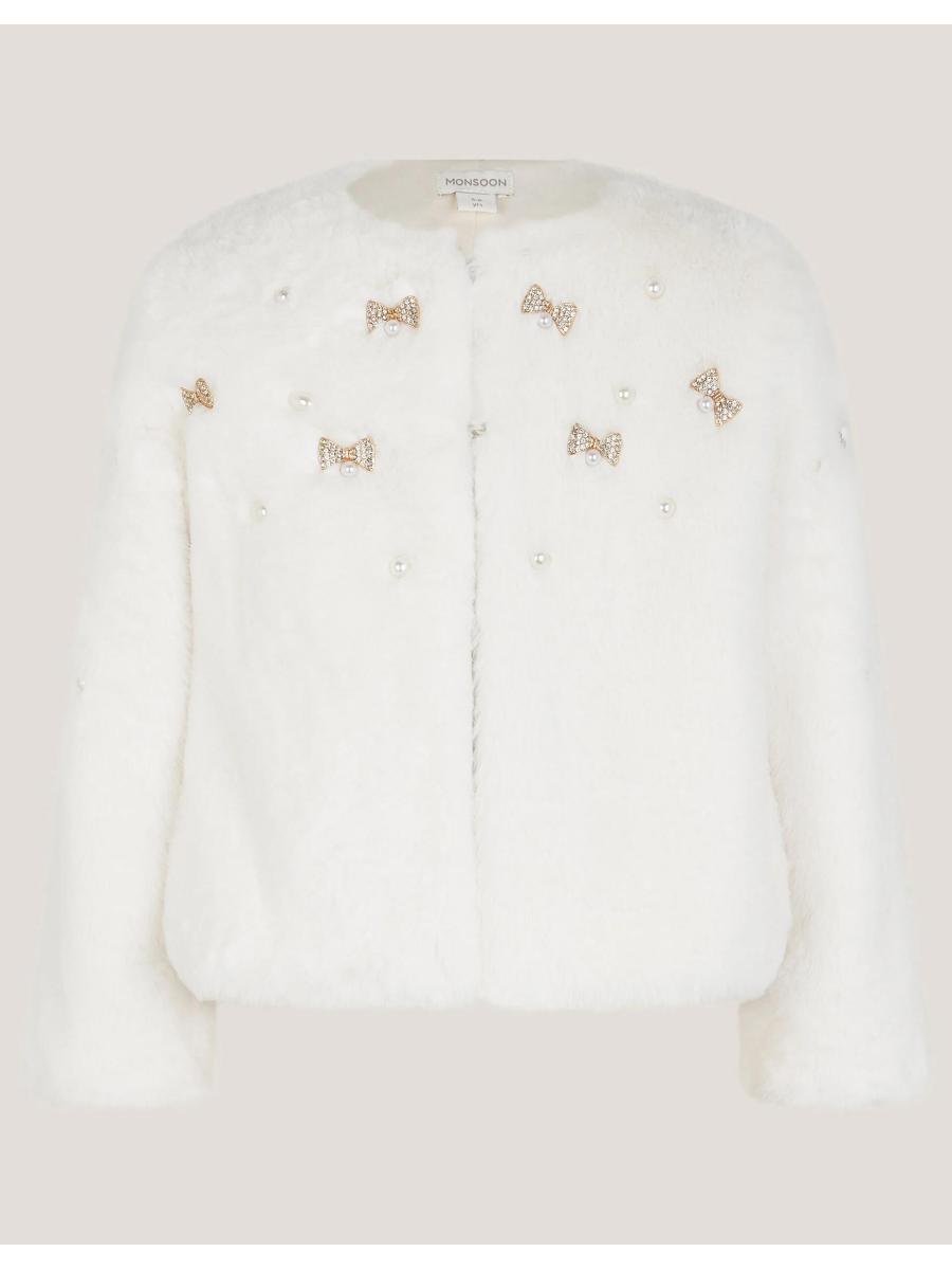 Winter warmers: Sparkly edition. The perfect layer to go over all their party and special occasion outfits. This jacket is made from super-soft faux fur, embellished with gold-tone diamante bows and pearl beads. Finished with discreet fastenings. Ivory