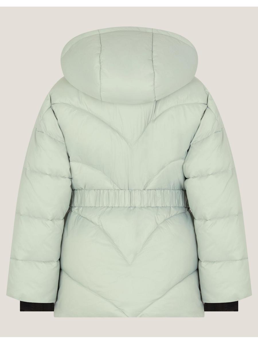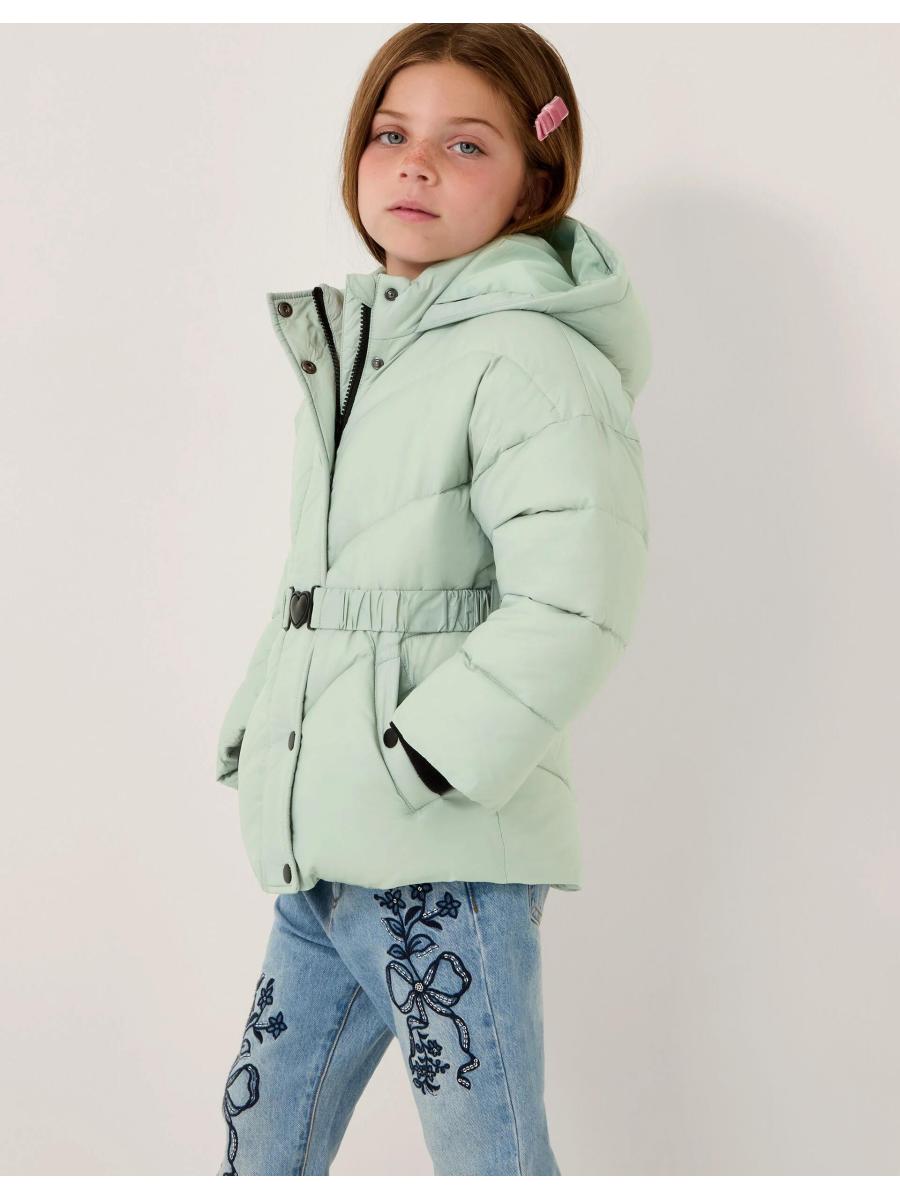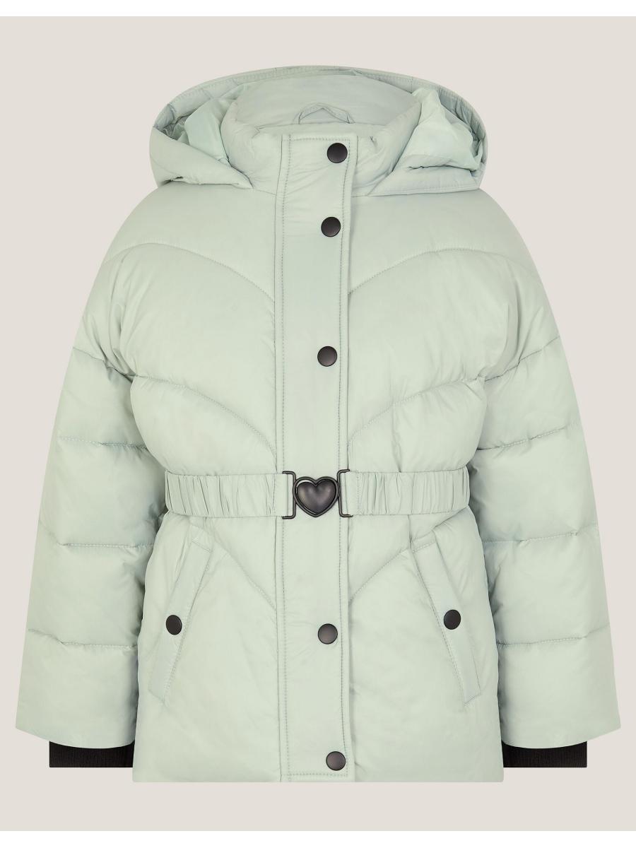 Brrrr! Let the outdoor adventures begin! Featuring a quilted design, long sleeves and a hood, this cute puffer coat is designed to keep them warm in the colder months. The best part? The heart buckle belt to the waist. Fastens with a snap button closure to the front. Green