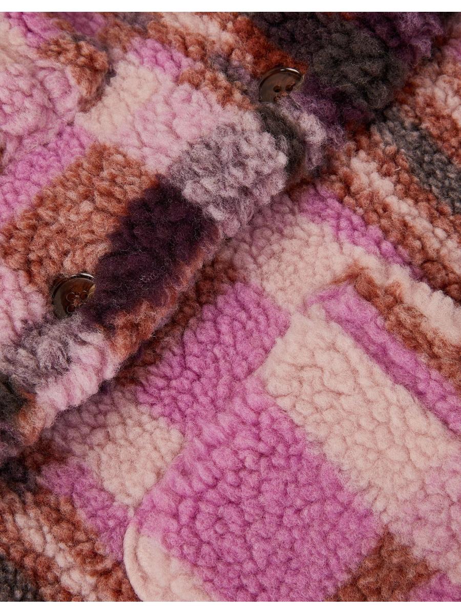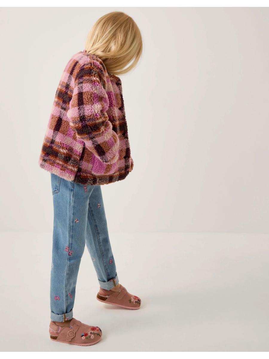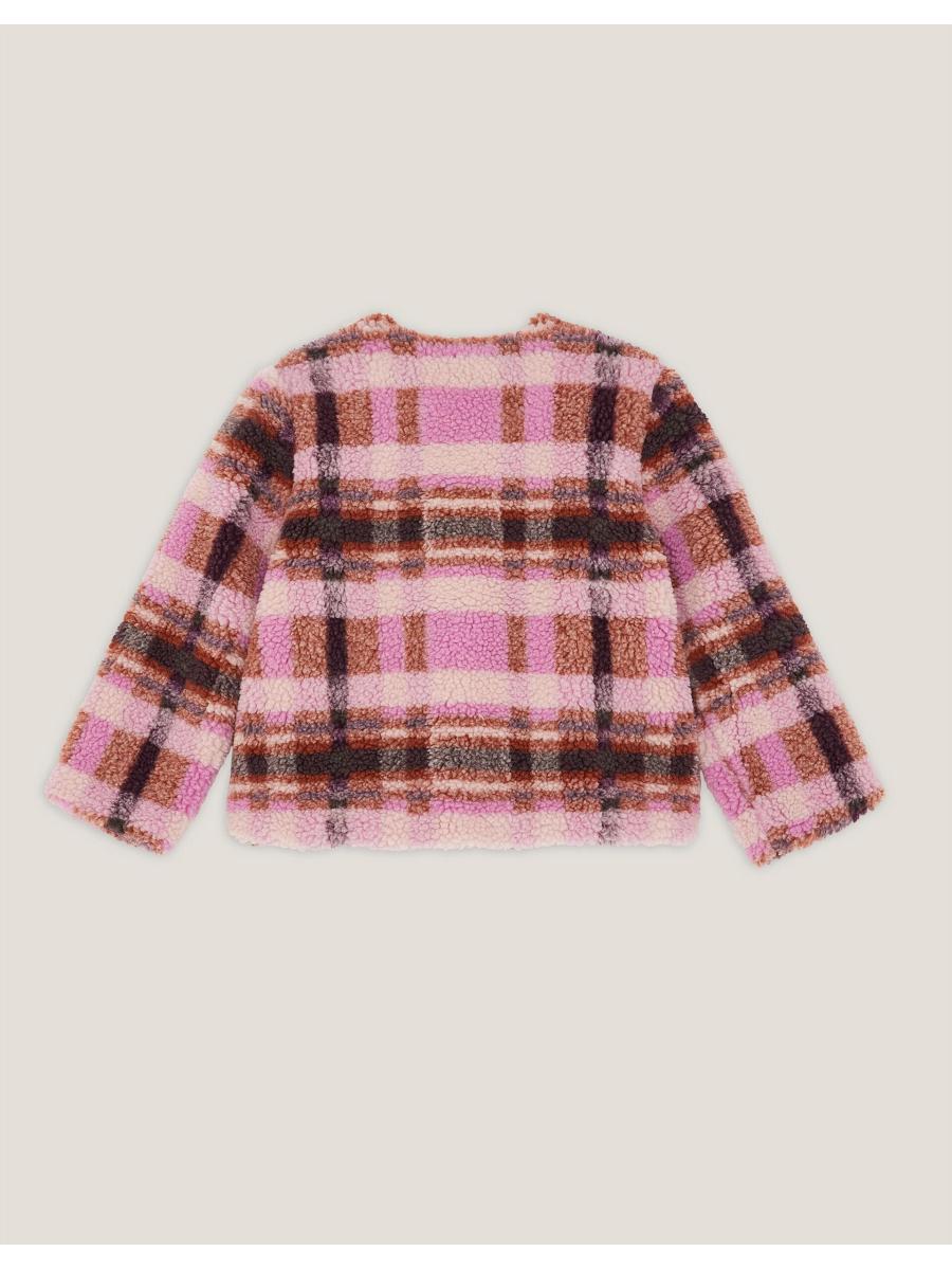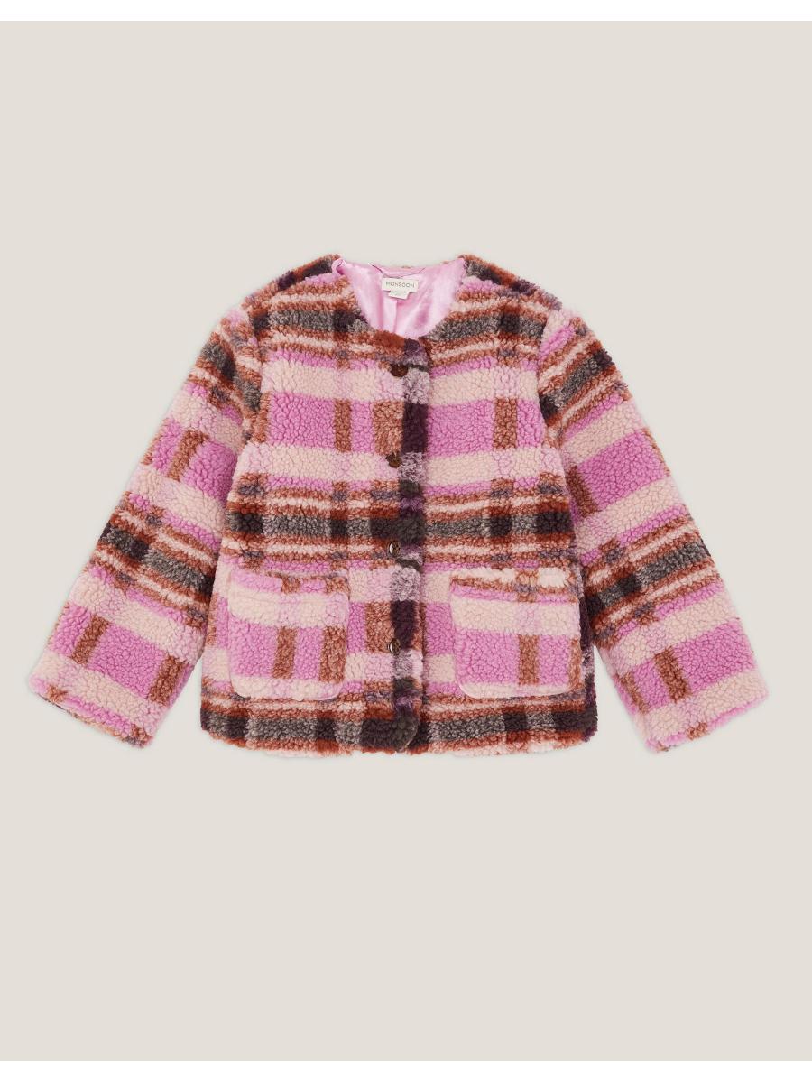 A jacket that really says 'Check me out!'. Keeping them as snuggly as a teddy bear, this jacket boasts a soft borg fabric with a bold checkered pattern in pink and neutral tones. Finished with two patch pockets and front button fastenings. Pink