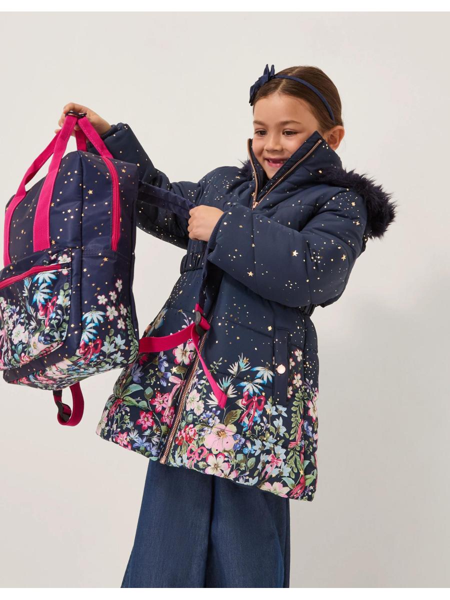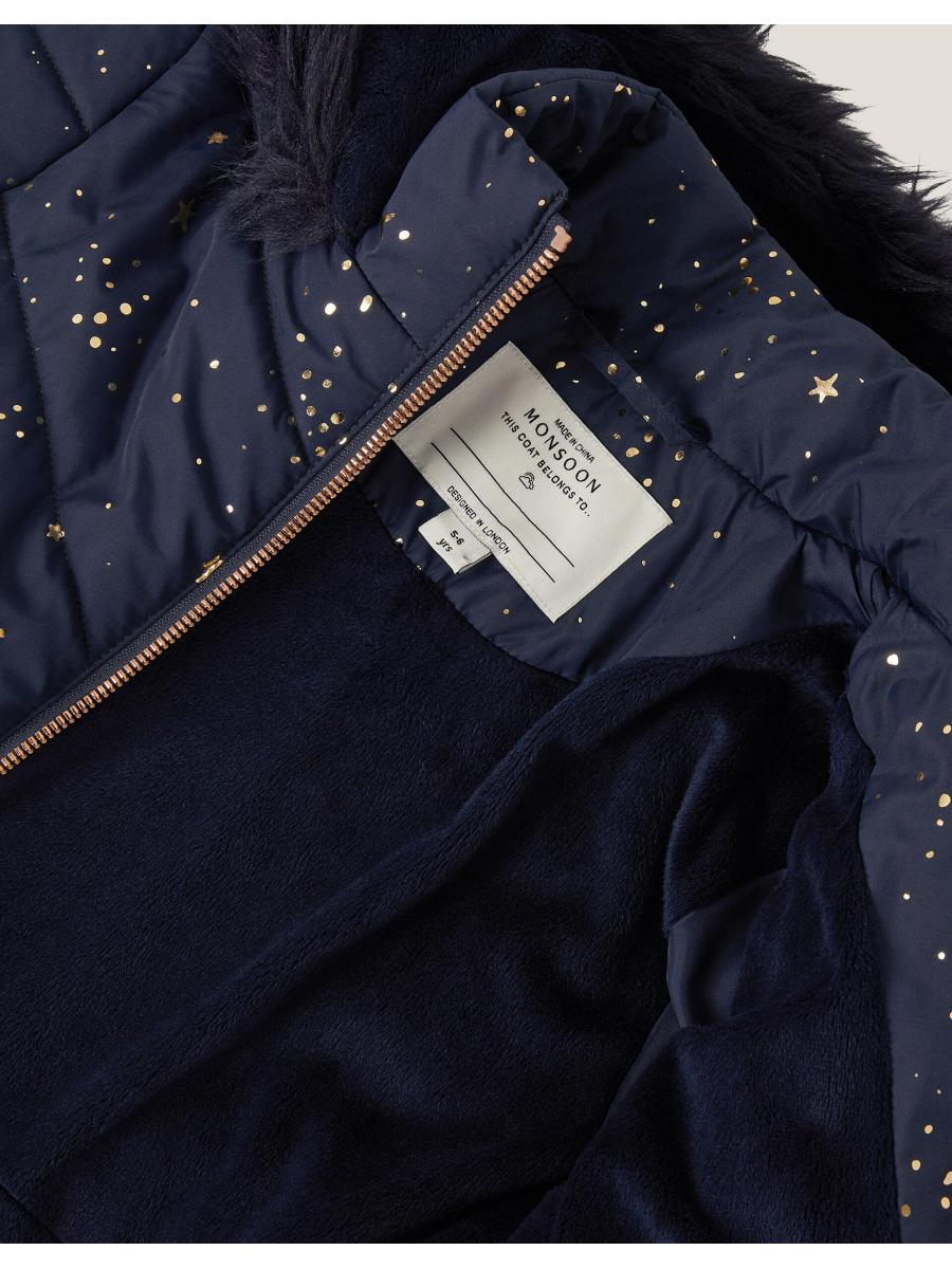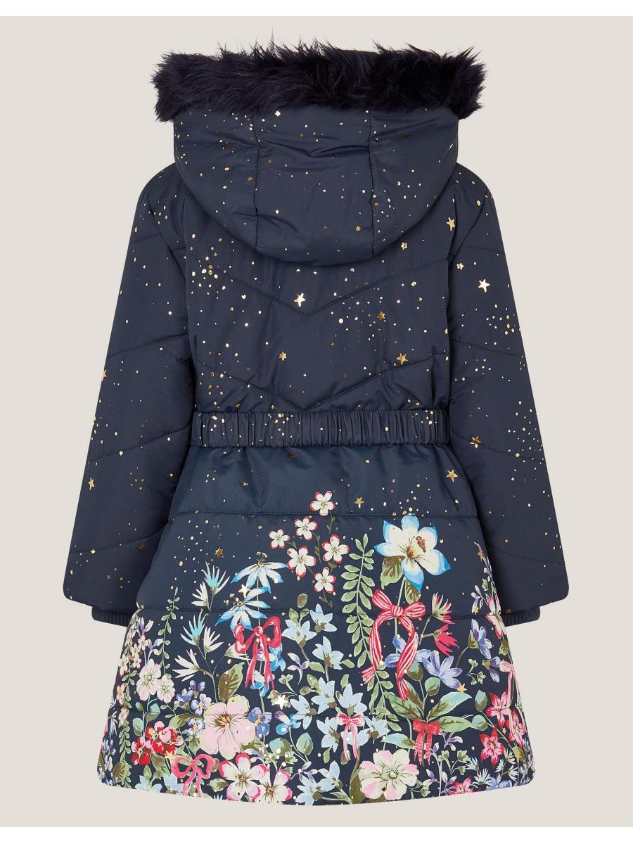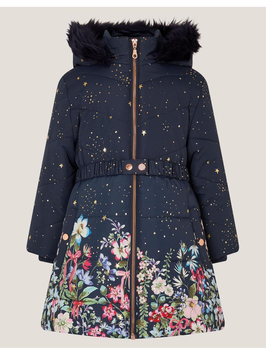 Beat the chill. Made with a super-soft and cosy padded finish, this coat is decorated with golden stars, colourful flowers and fluffy faux fur around the hood. Finished with a zip fastening and elastic waist belt for a cinched look. Blue