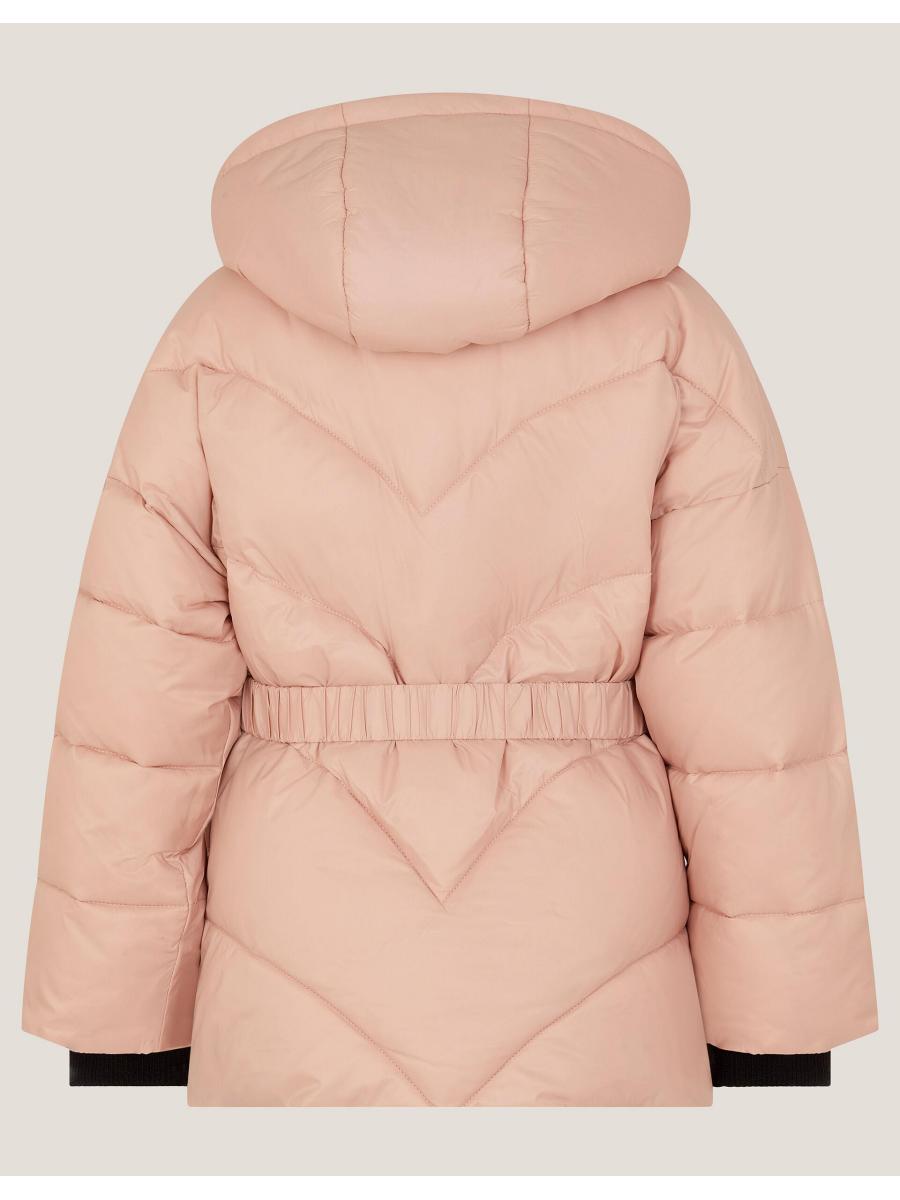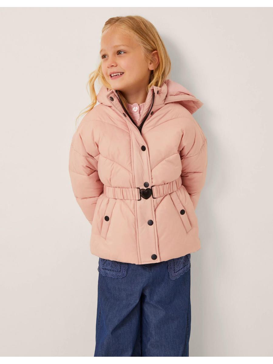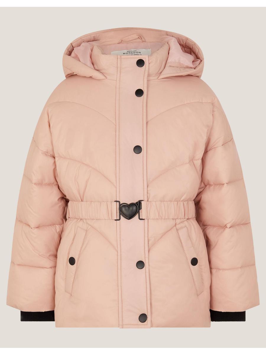 Brrrr! Let the outdoor adventures begin! Featuring a quilted design, long sleeves and a hood, this cute puffer coat is designed to keep them warm in the colder months. The best part? The heart buckle belt to the waist. Fastens with a snap button closure to the front. Pink