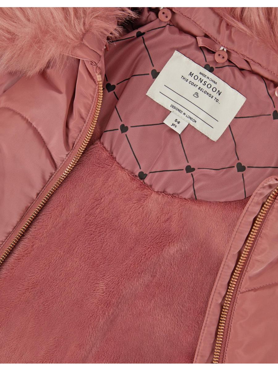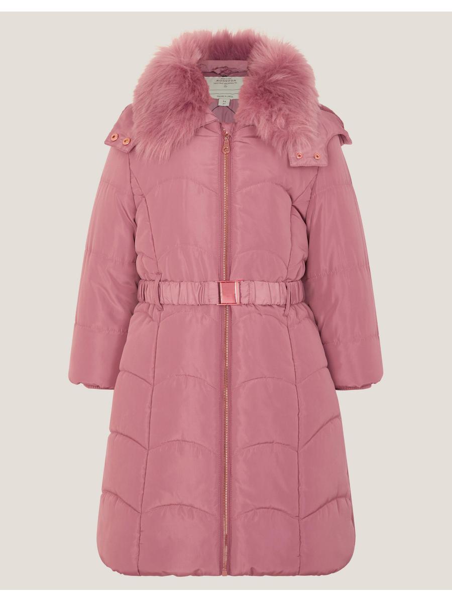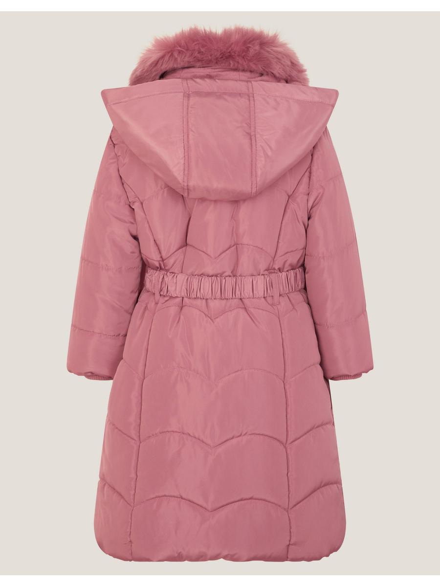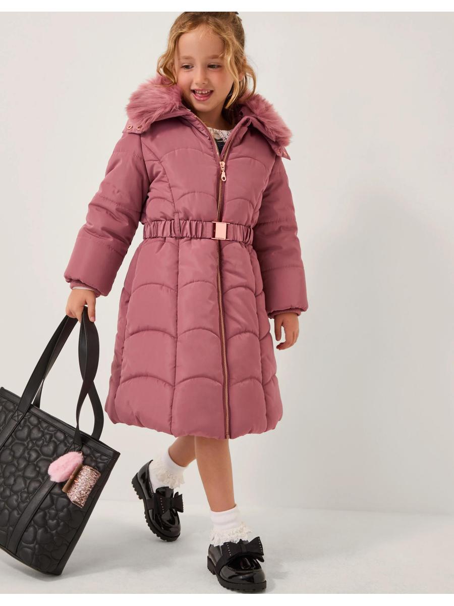 Keep them cosy (and warm) in style. Designed with scalloped quilting, this puffer coat features a faux fur trim around the hood, a stretchy belted waist and front zip fastening. Pink