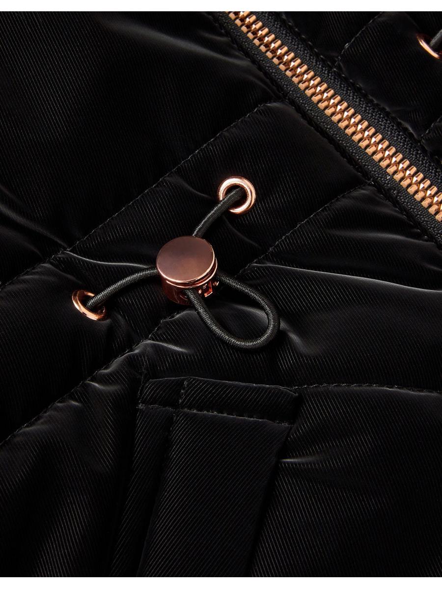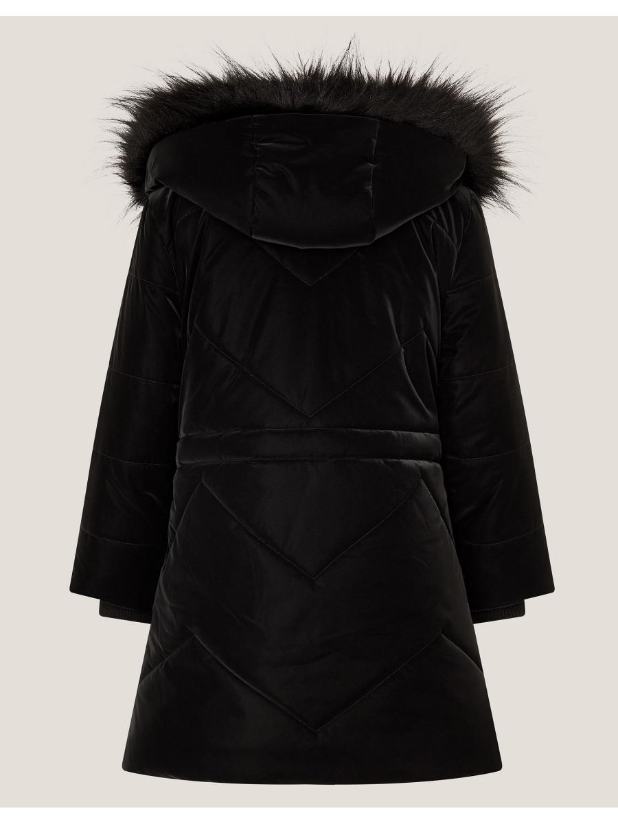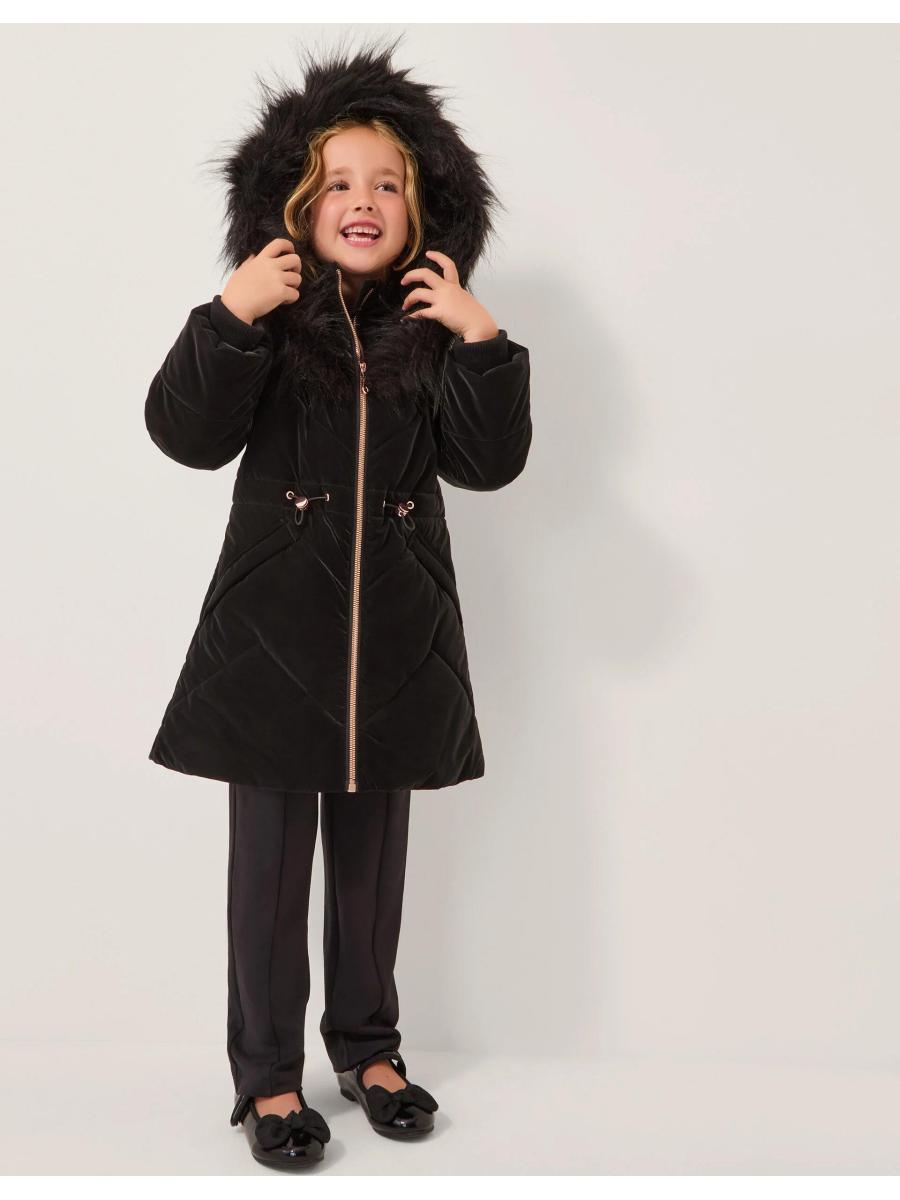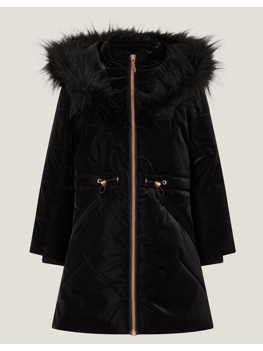 Back to school ready! Soft and durable to keep the cold out, this padded coat features diamond quilting with a luxurious faux fur hood. Finished with a gold zip fastening and elastic toggles to cinch the waist. Black