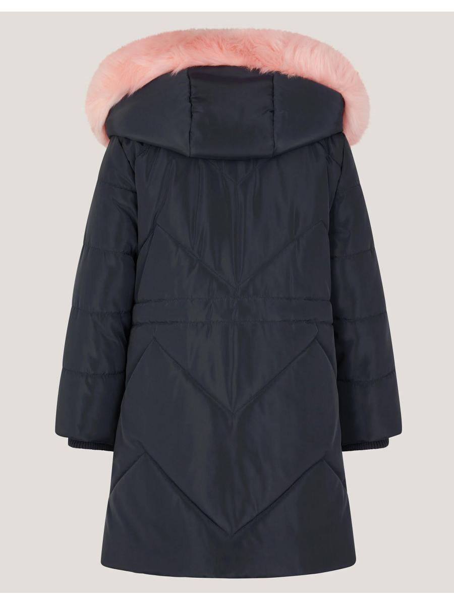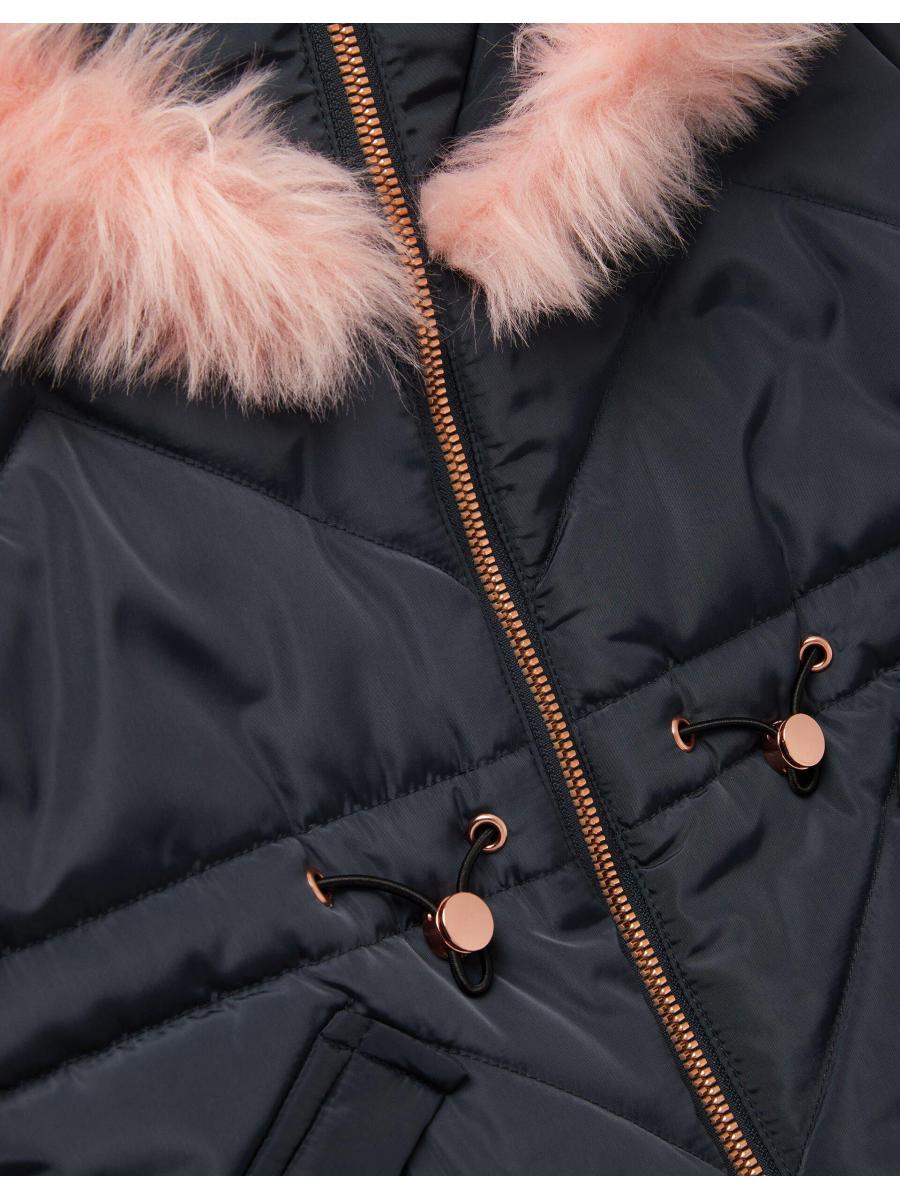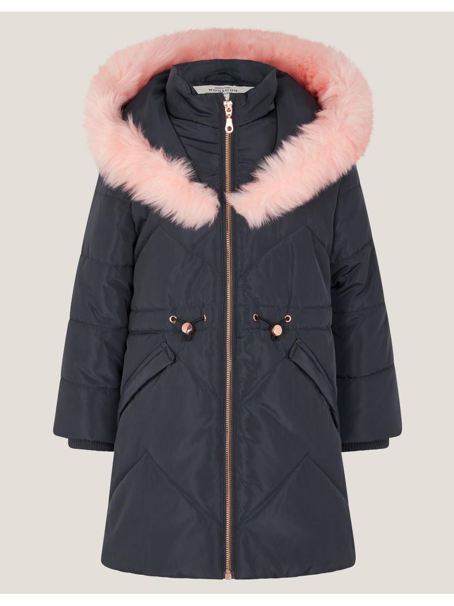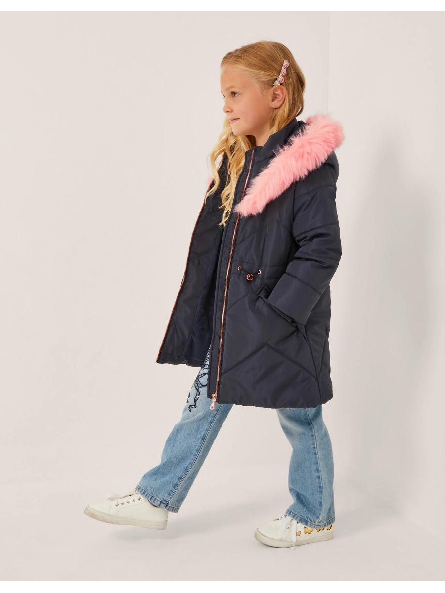 We're feeling warm and fuzzy inside. Designed in a quilted fabric and featuring a bright pink faux fur hood, this puffer jacket is guaranteed to keep them cosy on chilly days. Finished with a front zip fastening. Blue