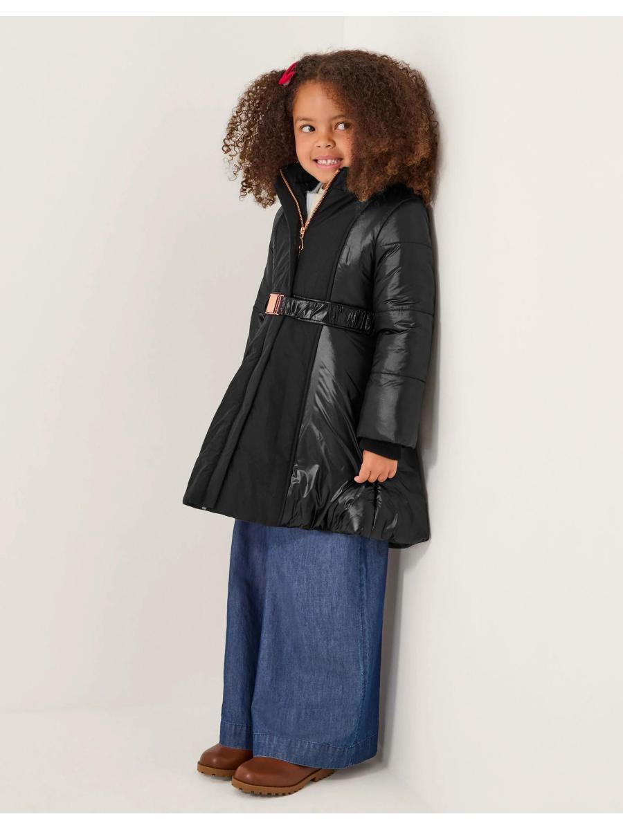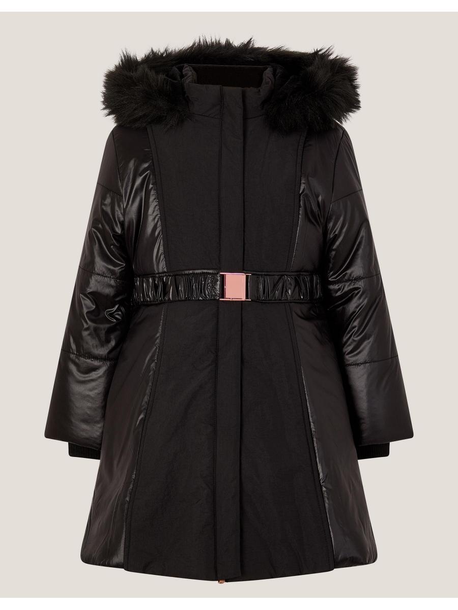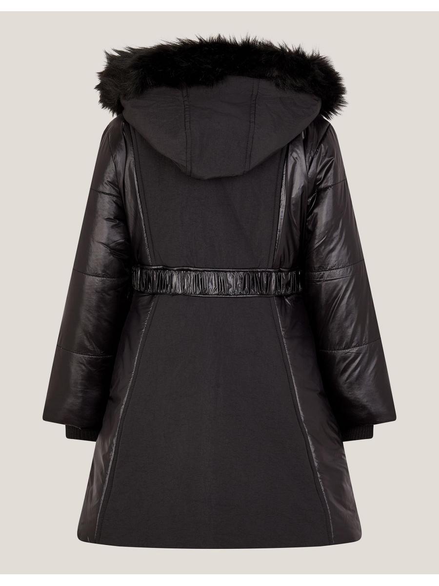 A winter essential, faux real. Perfect for school days and weekend adventures, this shine paneled coat features a faux fur trim around the hood with a stretchy waist belt. Stitched with a padded finish, it's a cosy pick for the colder weather. Black