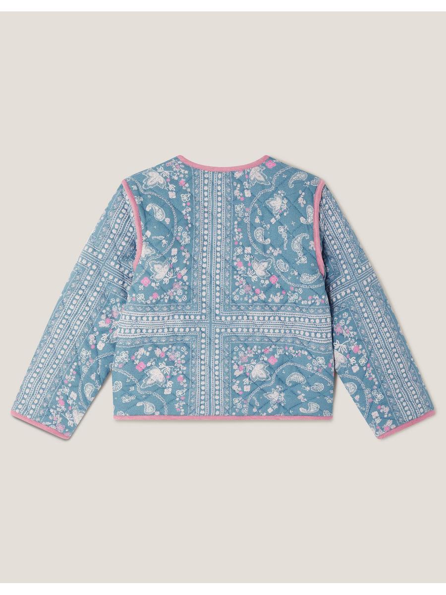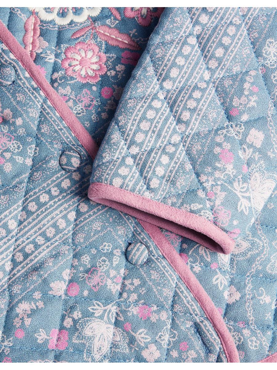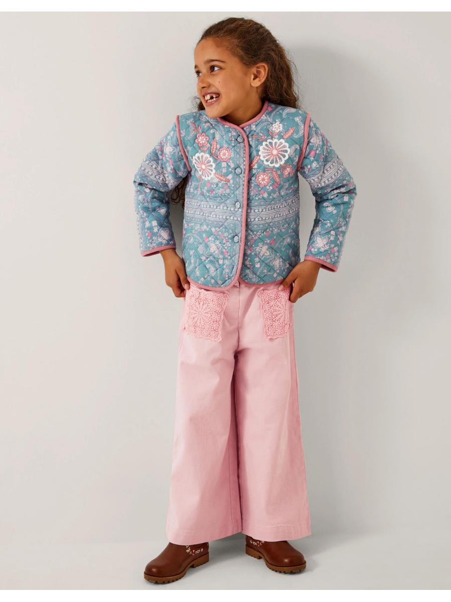 *Wishing this came in adult size, too*. Designed in a blue wash to give a denim look, this quilted jacket is patterned with flowers, butterflies and paisley motifs, with pink and white floral embroidery framing the neckline. Finished with front button fastenings. Blue