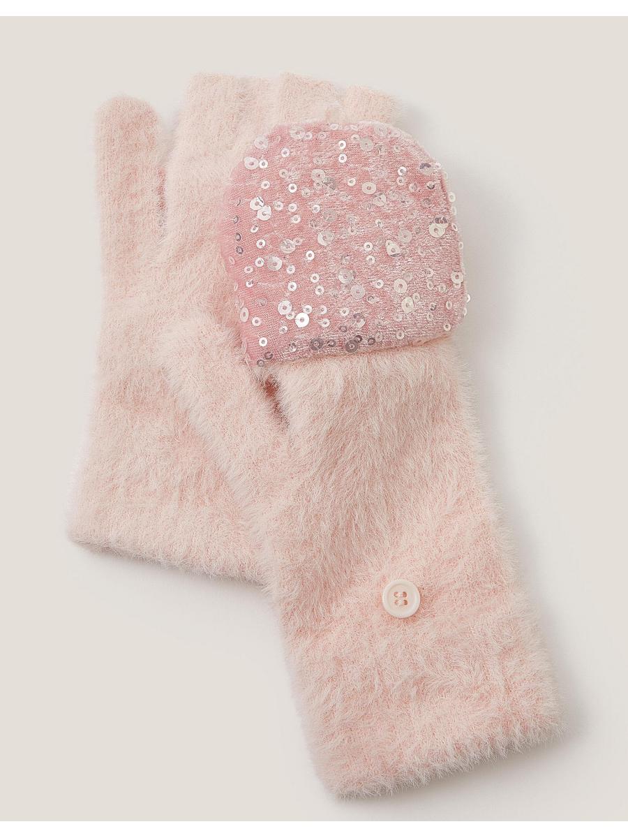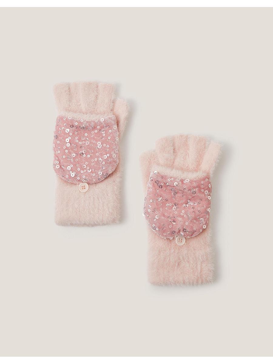 A touch of sparkle. A fun addition to their wardrobe, these fluffy gloves feature a capped mitten so you can switch them up from fingerless gloves. Finished with shimmery sequins. Matching hat available. Pink