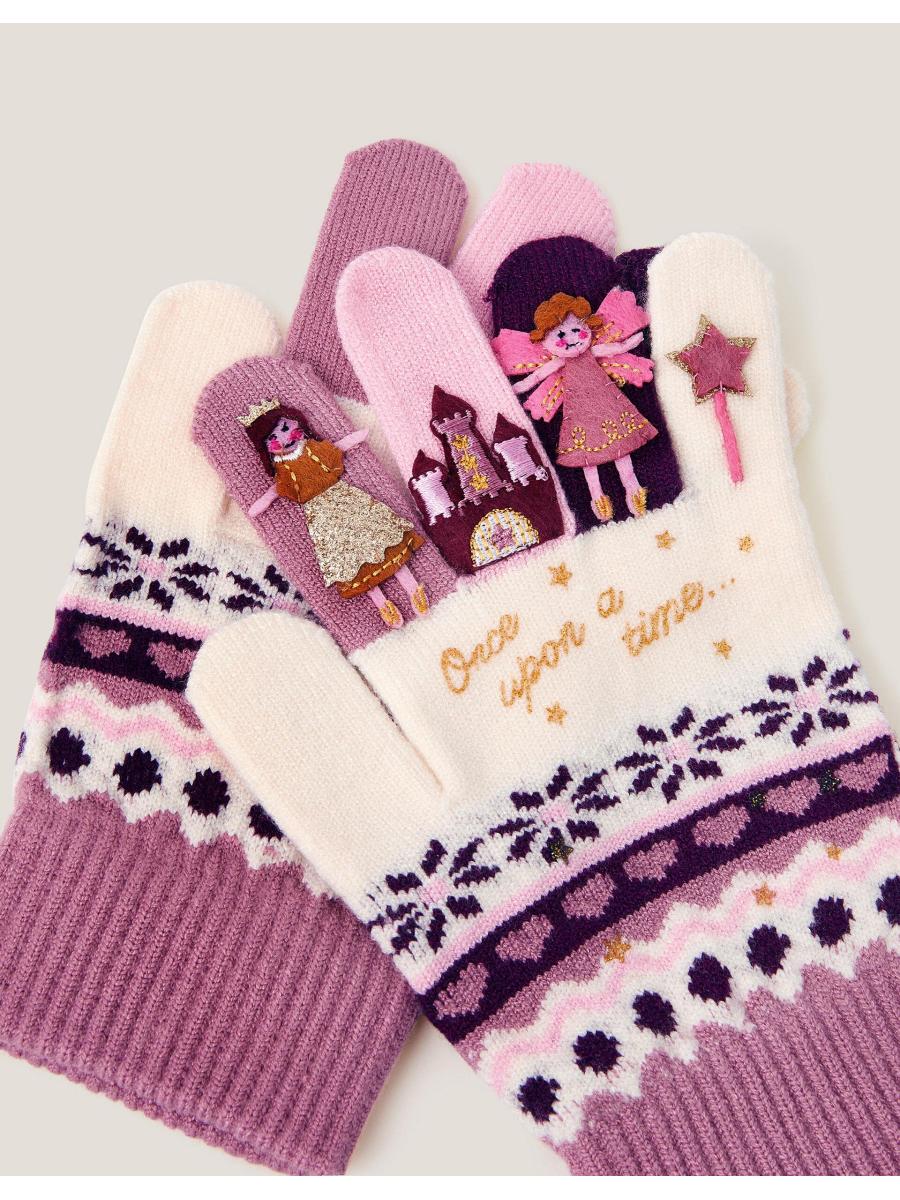 Magical! Inspired by fairy tales and stitched with pretty-in-pink patterns, these gloves feature fairy princesses and enchanted castles embroidered on every finger. Pink