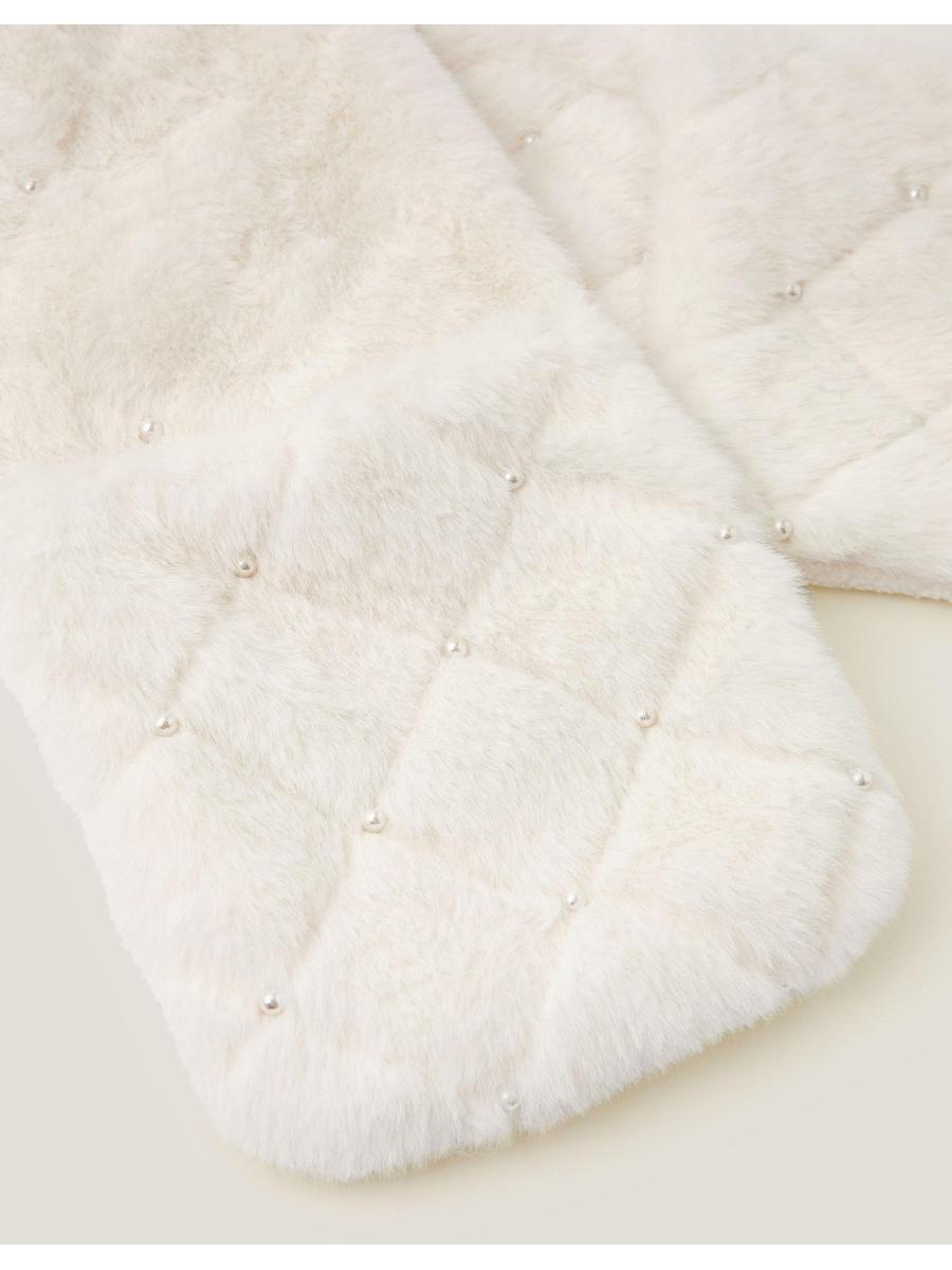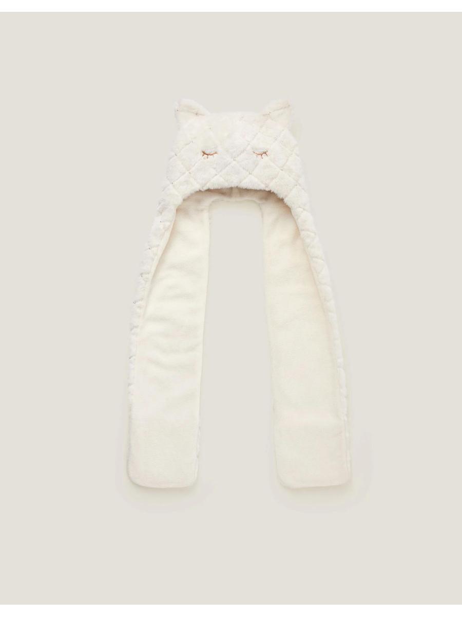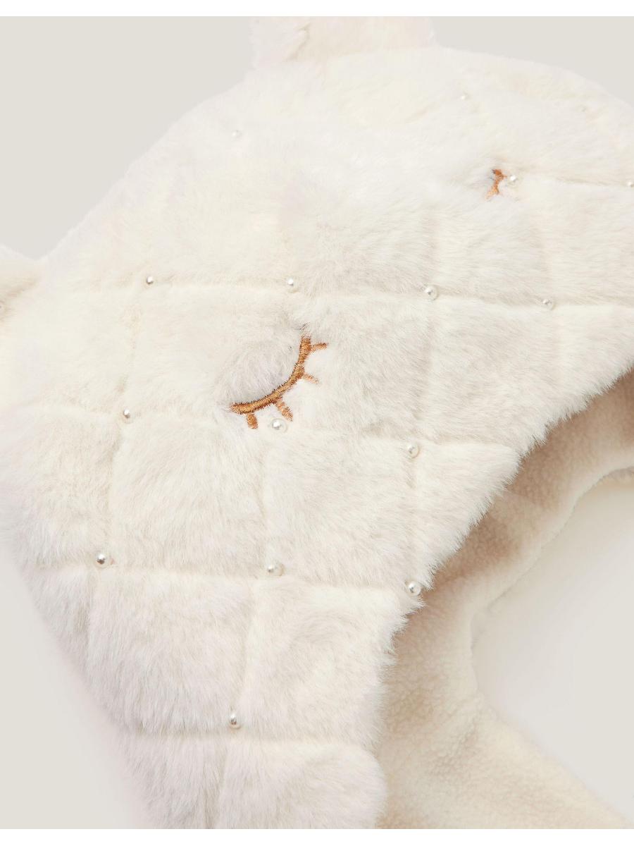 Purrr! More than just a sleepy cat face, this 3-in-1 hat keeps little ones warm from head to fingers. Made from soft quilted faux fur with pearly bead embellishments, the long panels can be wrapped around like a cosy scarf or extended to reveal handy mitten-style pockets at each end. Ivory