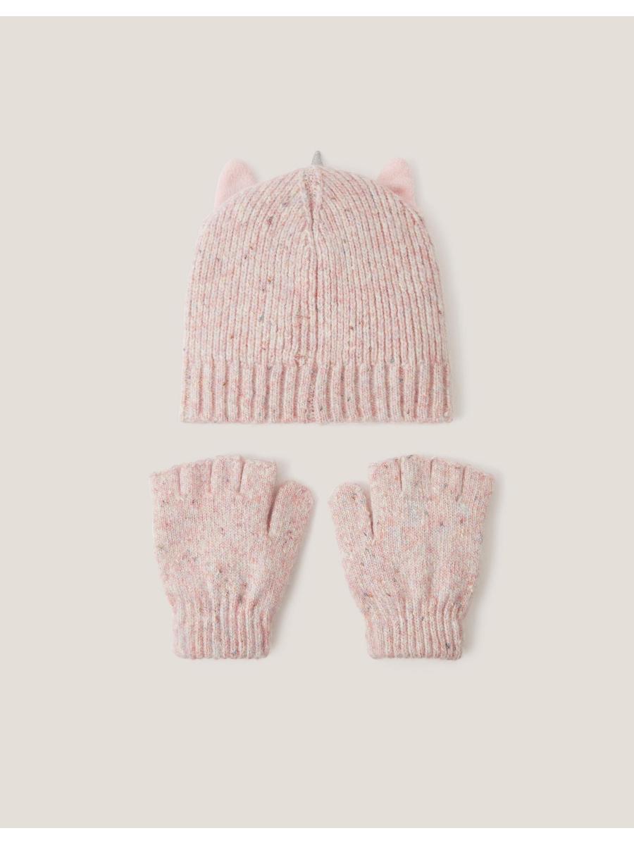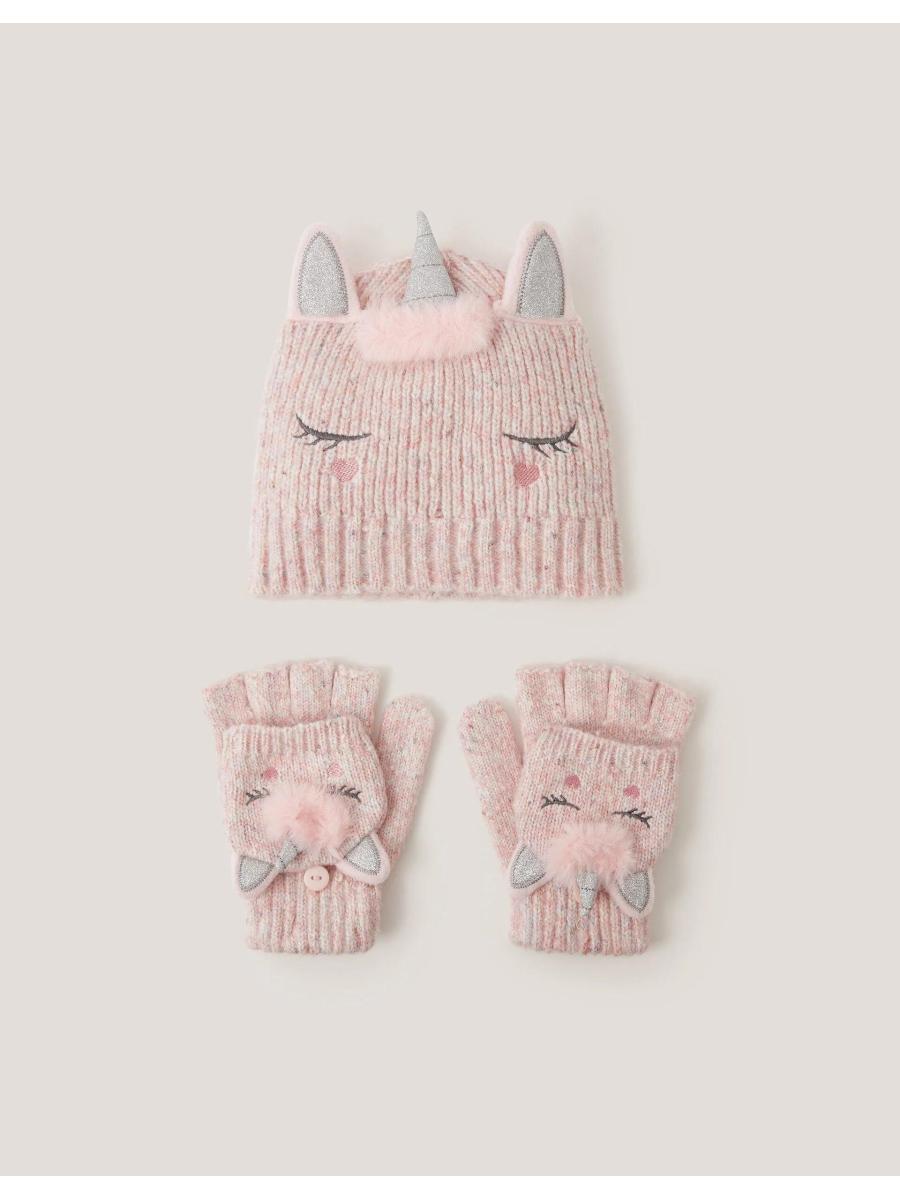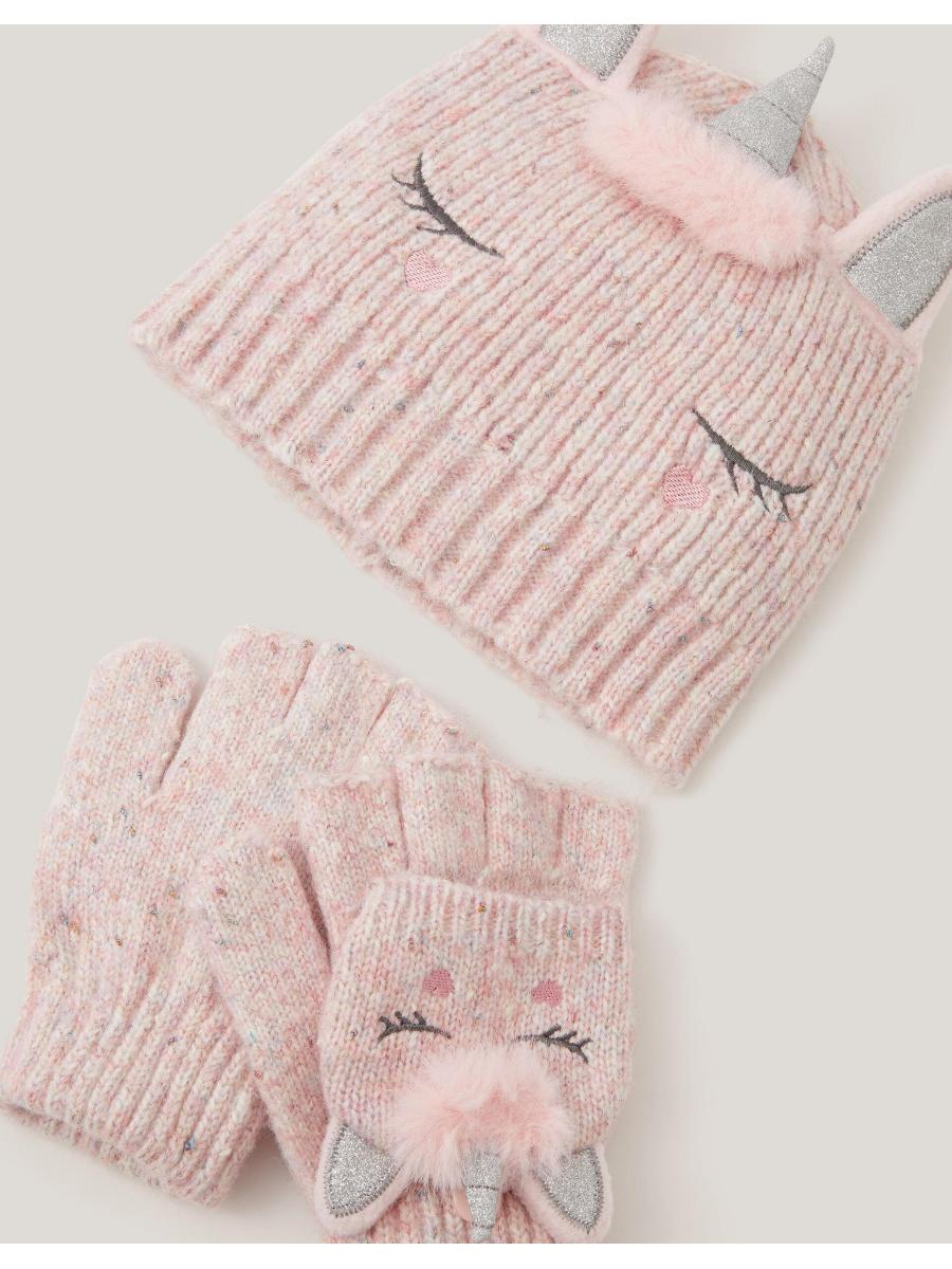 Wintertime magic. Stitched with baby pink yarns, this set includes a beanie hat and 2-in-1 fingerless mitten gloves, both showcasing mystical unicorn designs. Sold as a set. Multi