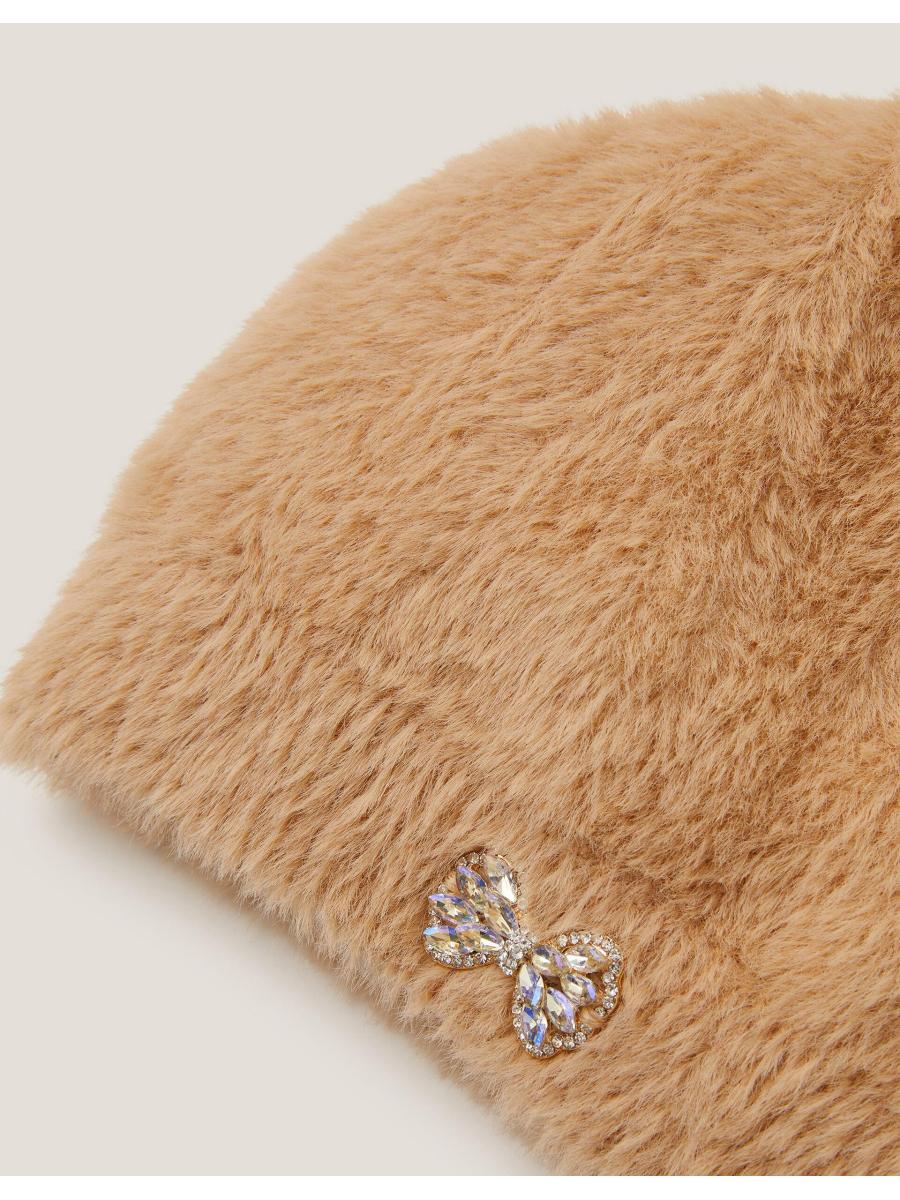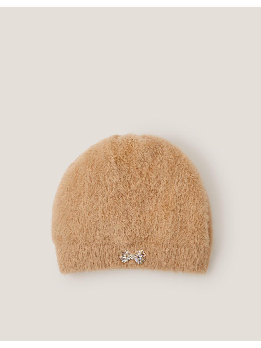 Slay the cold, the cute way. Stitched with fuzzy yarns for a super-soft finish, this hat is bedazzled with a jewel bow at the centre. The perfect winter accessory for those who love to sparkle! Camel