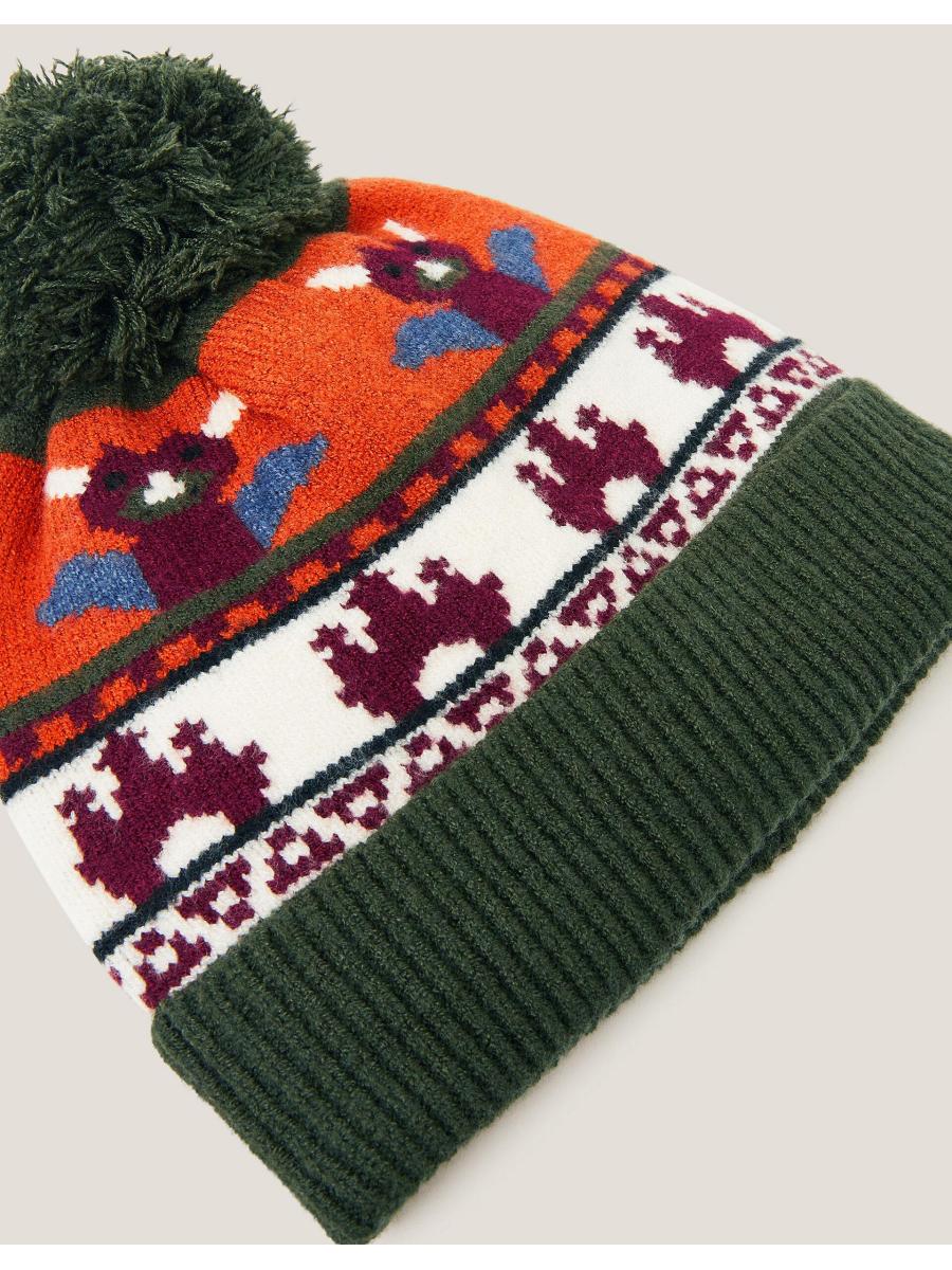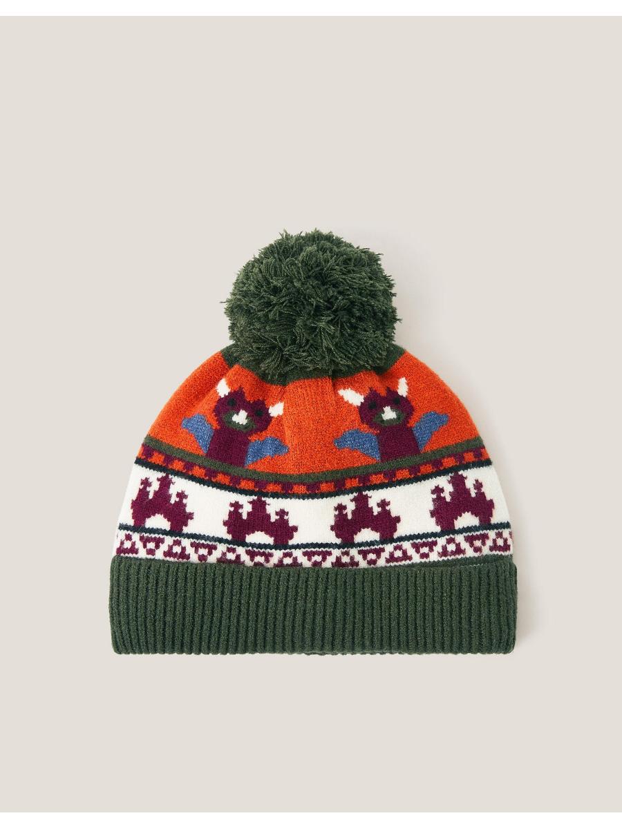 Slay! The best type of armour for little ones in wintertime, this bobble hat features a dragon and castle intarsia design and khaki pom-pom topper. Multi