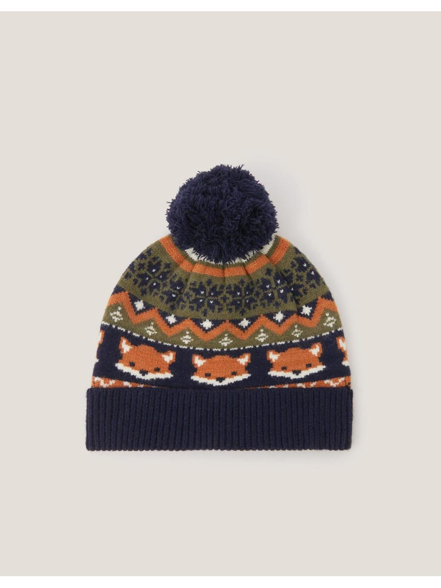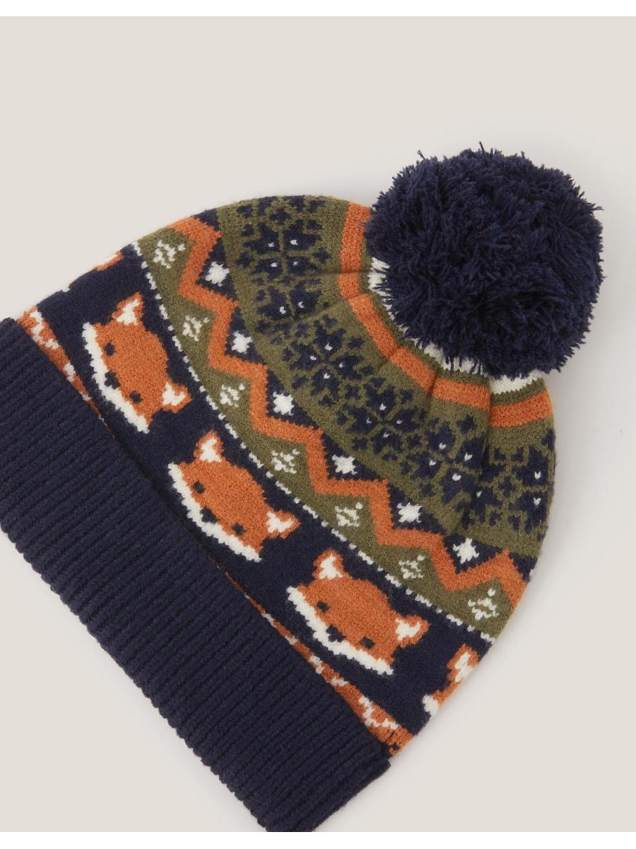 Guys! I spot a fox! Designed in a soft knit, this beanie is decorated with fox motifs below a wintry pattern. Finished with a ribbed trim and fluffy pom-pom top. Multi