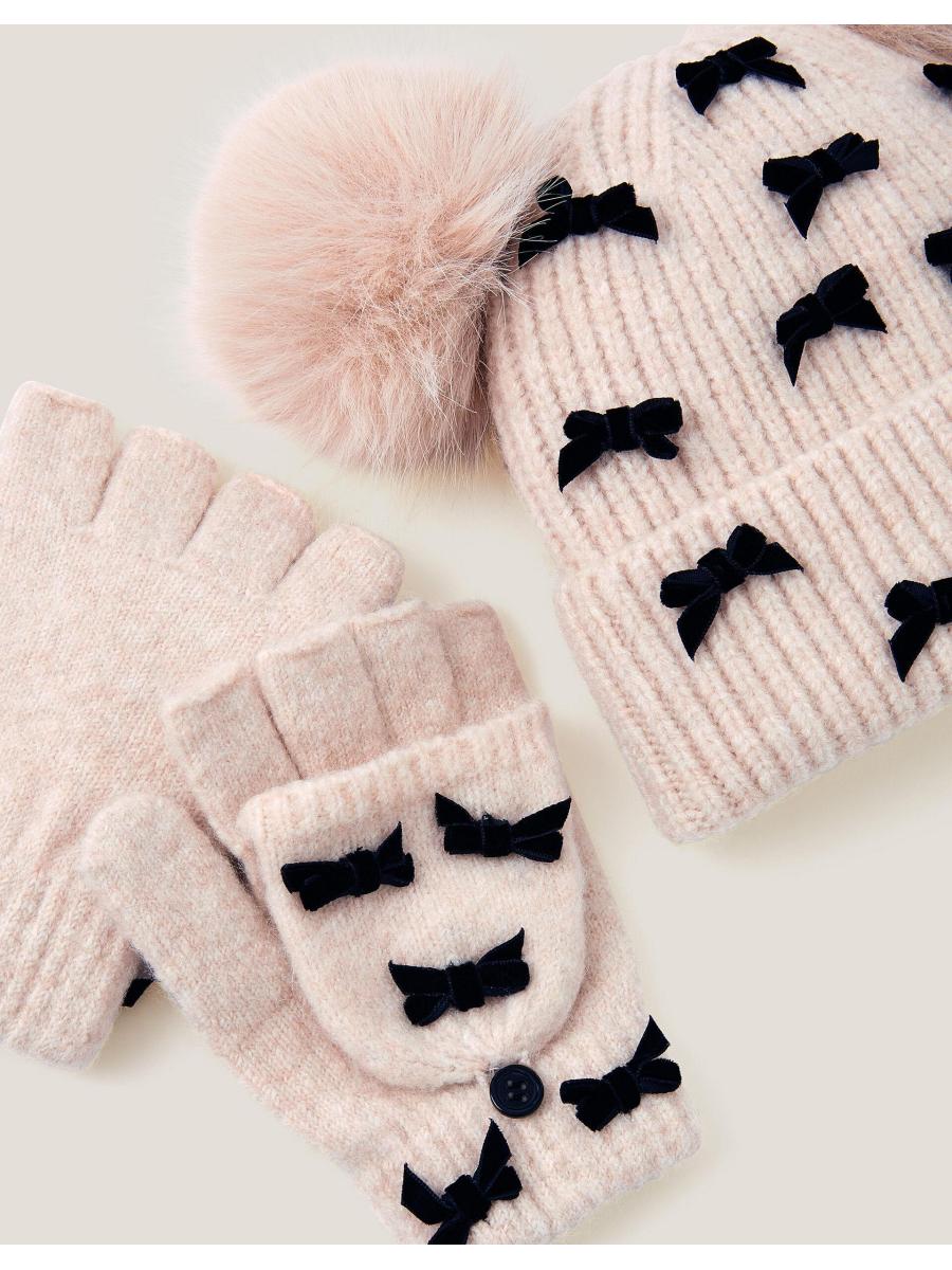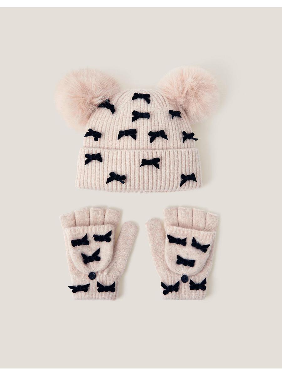 Snow cute! Stitched with baby pink yarns, this set includes a knitted hat with two fluffy pom-pom toppers and 2-in-1 mitten gloves, both decorated with velvety-soft ribbon bows. Sold as a set. Camel