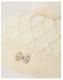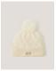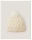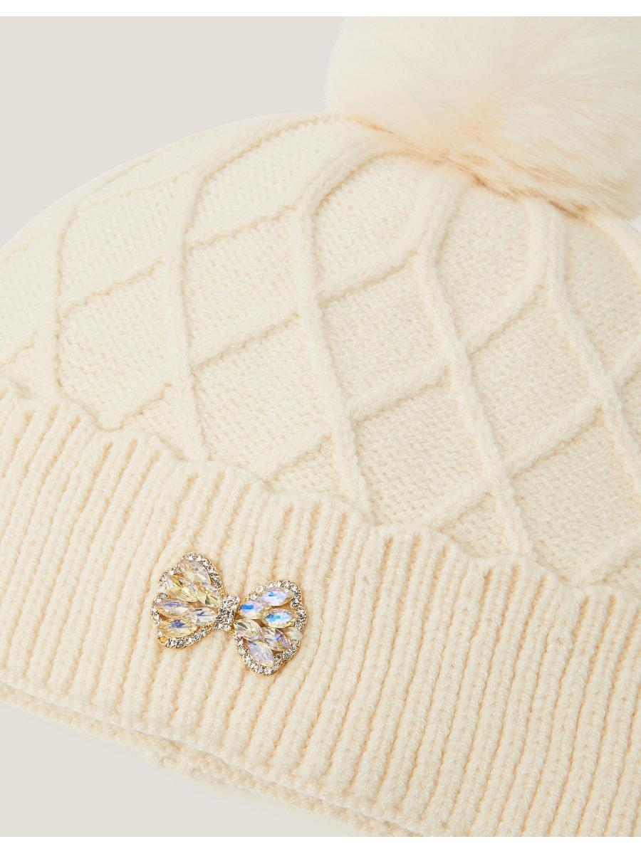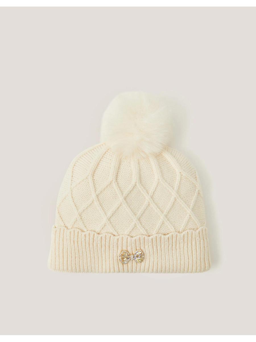 Keep it chic. Designed in cable knit with a ribbed trim, this adorable hat features a fluffy pom-pom top. Finished with a decorative bow. Ivory