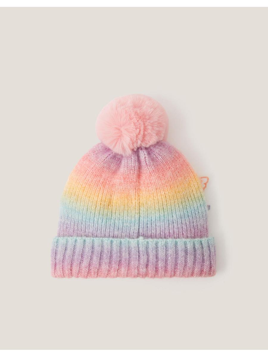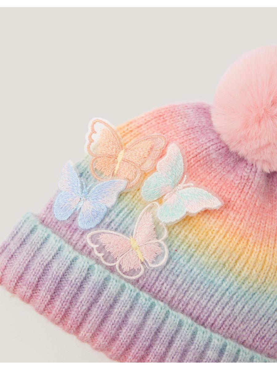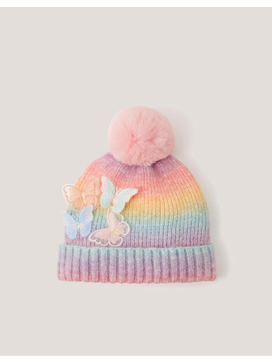 Serving looks, not chills. Brighten up the gloomy days of winter with this bobble beanie. Stitched with rainbow pastel yarns, it's decorated with fluttery butterflies and a pink faux fur pom-pom topper. Multi