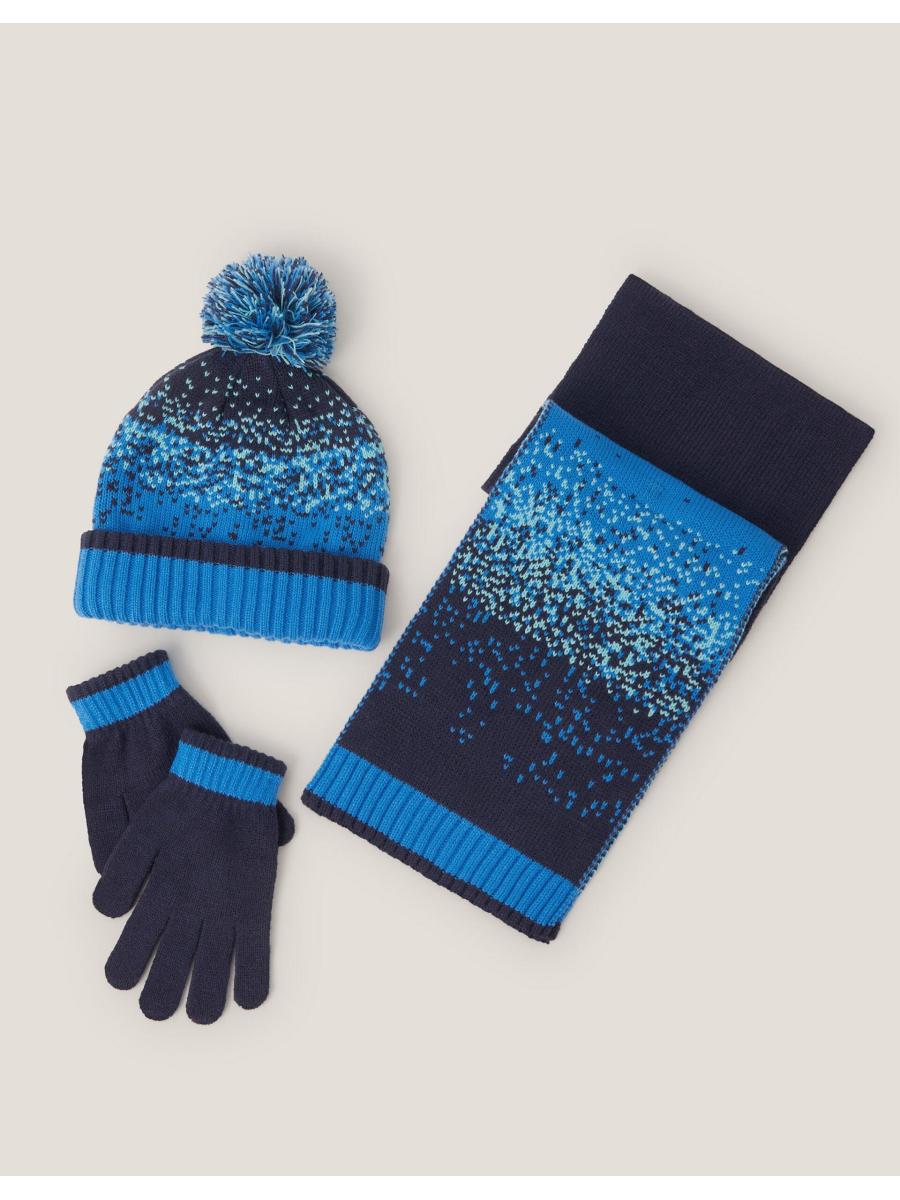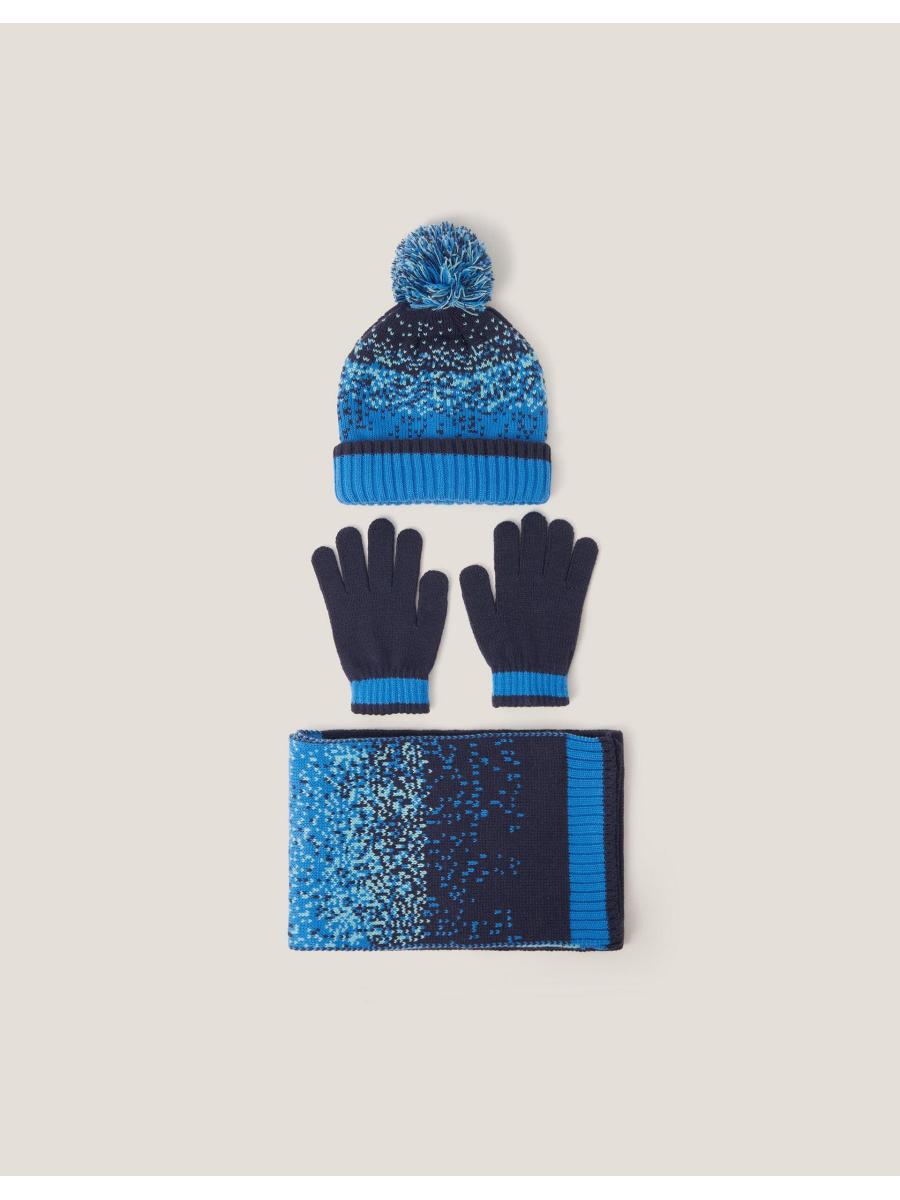 Chill out. Made from soft knits and featuring ribbed trims, this bright blue set includes a matching hat, scarf and gloves. Finished with a pixel print design. Blue