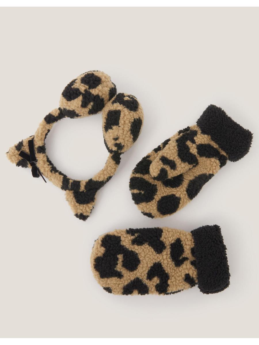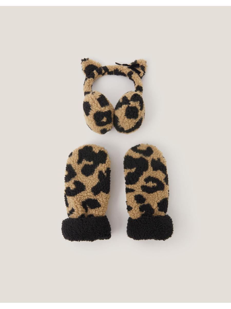 Wild winters. Coated in super-soft borg that'll see them through the chilliest of days, this earmuff and mitten set boasts a fun leopard print design. Multi