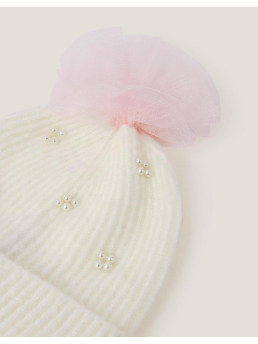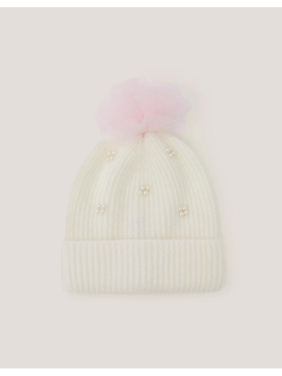 Winter Wonder-ful! Guaranteed to keep them cosy, this chunky knit beanie features a tulle pom-pom top and classic turn-up brim. Finished with clusters of shimmery beads on the front. Ivory