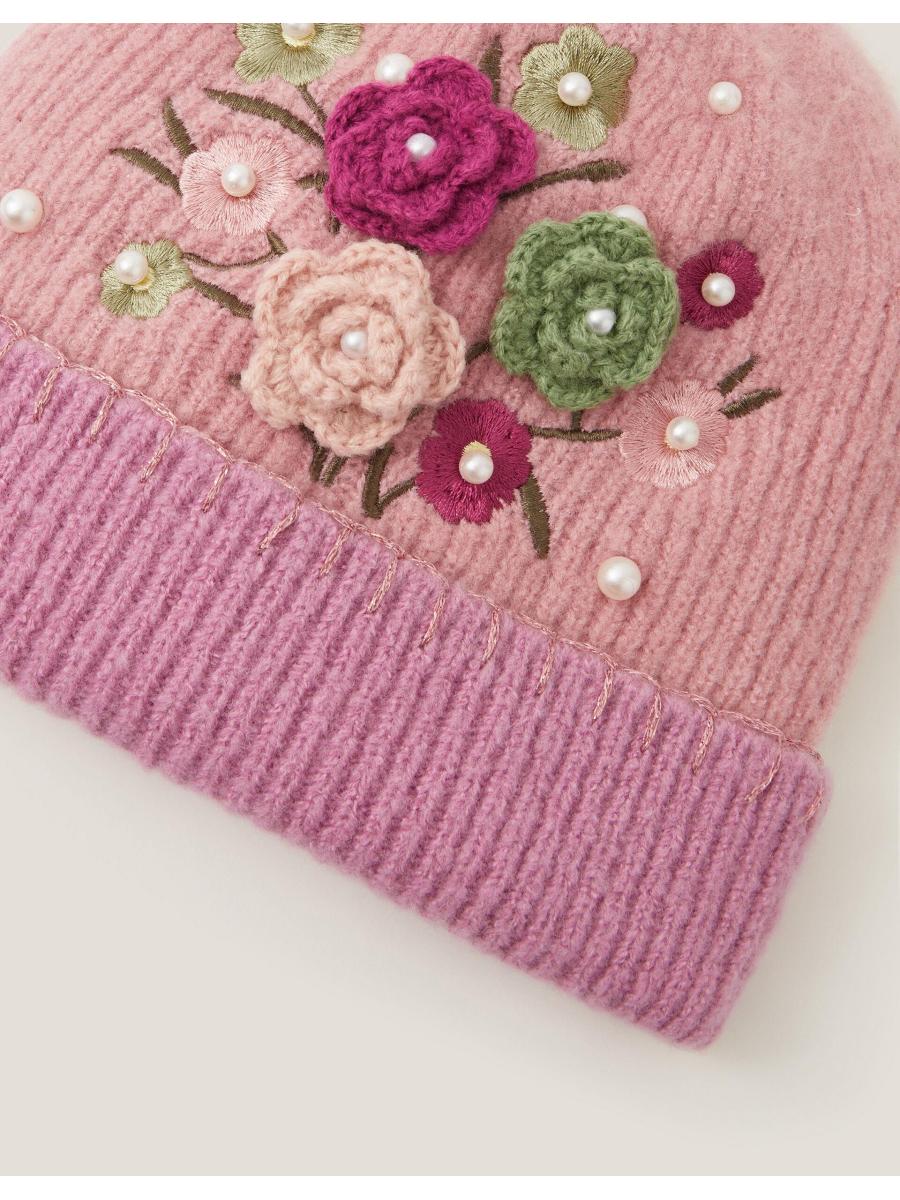 Yay for crochet! Stitched in two tones of pink, this beanie hat is the ultimate winter warmer for little ones who love pretty details. Decorated with crochet and embroidered flowers and shimmery pearl beads. Pink